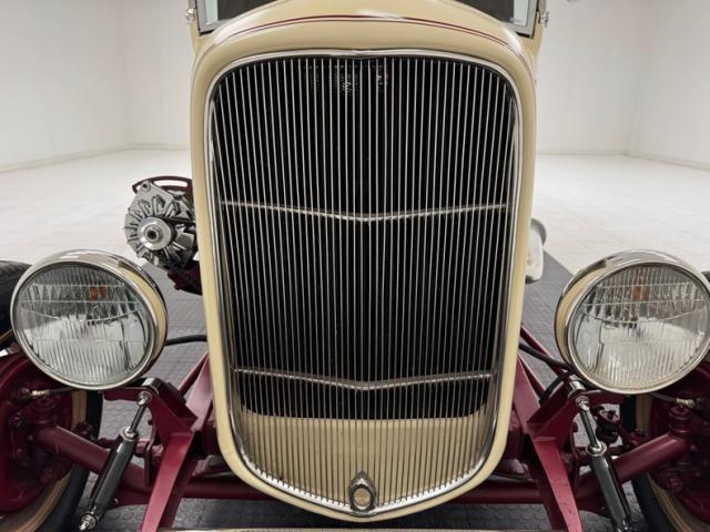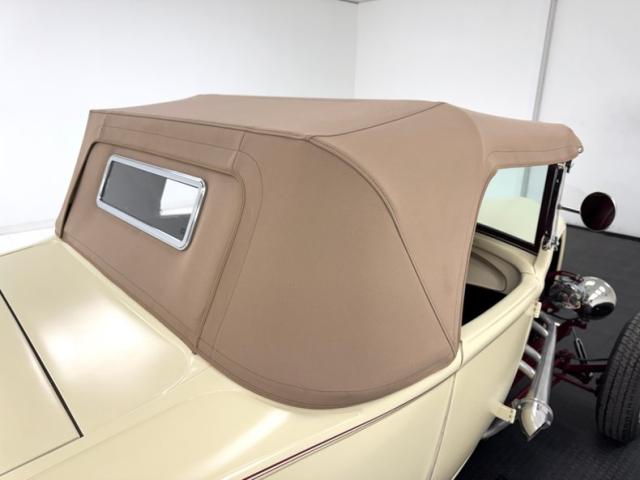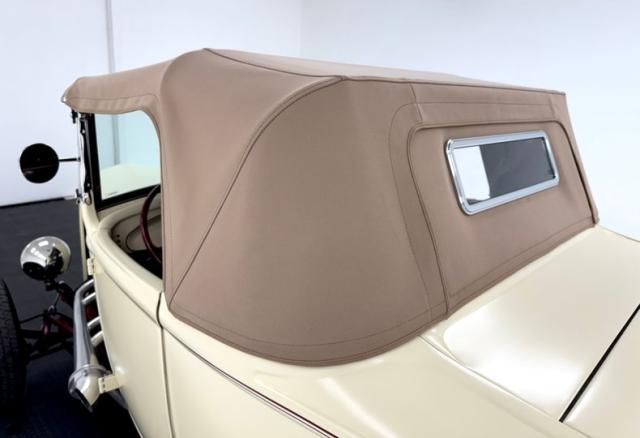 Back in the day, it was more about going fast that looking flashy so matte or satin paint was the norm, and this beauty is covered in a coat of satin desert tan single stage paint on the Brookville body and the tan Brookville canvas top picks up on the similarly painted 15-inch artillery wheels, here wrapped in staggered size tires with a mid 2022 date code. The \'32 Ford radiator shell is color keyed and enhanced by a dark red pinstripe that matches the exposed frame and axle in front in a tasteful design cue. The raked profile puts the rounded tail up in the air where a pair of Pontiac tail lights briefly interrupt the tan coverage, underscored by a pinstripe and topping exhaust tips that come through the rear valance. A single chip on the side constitutes the only exterior imperfection we find.