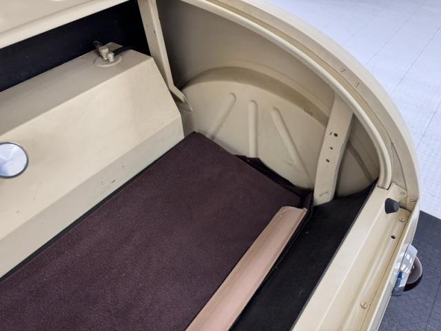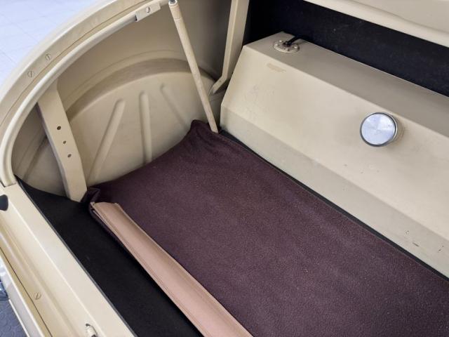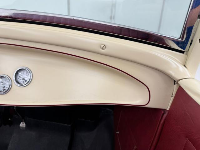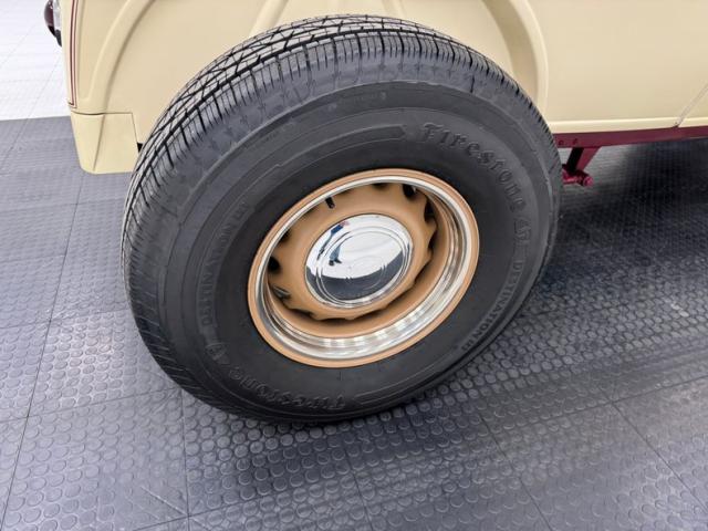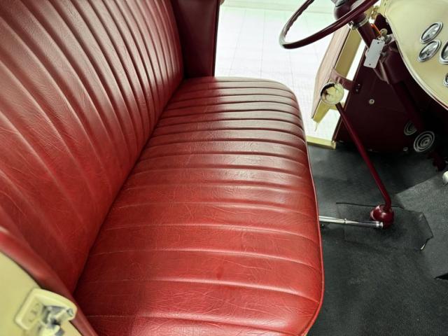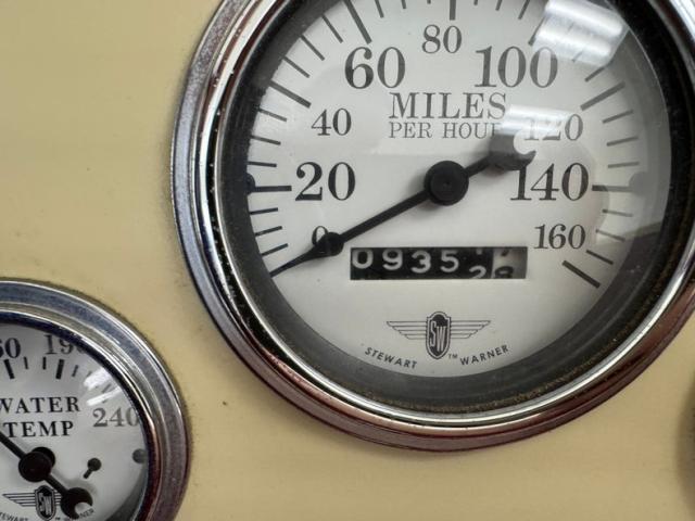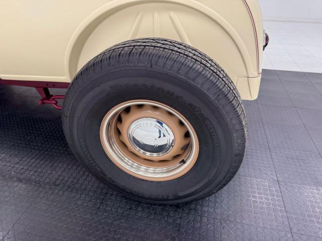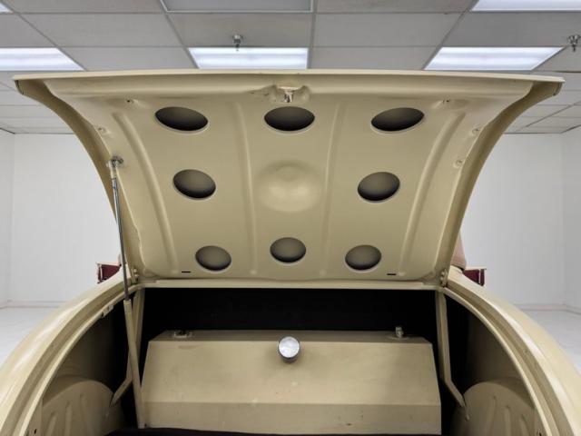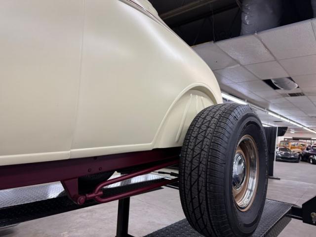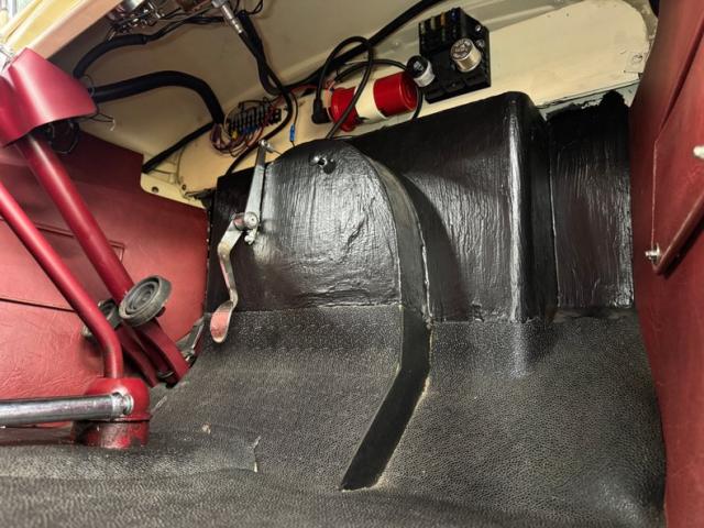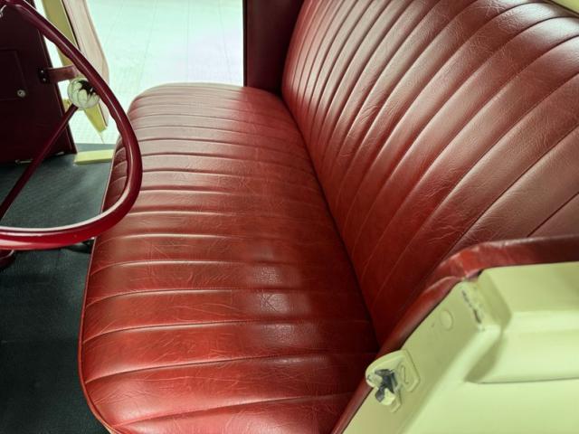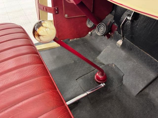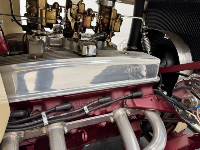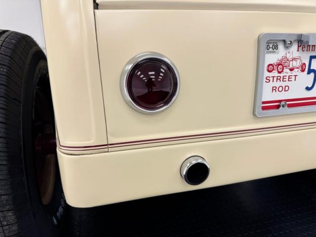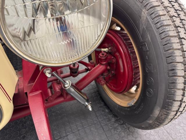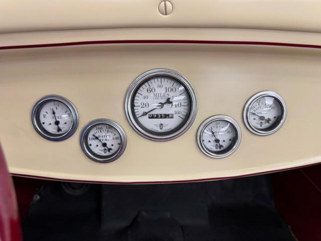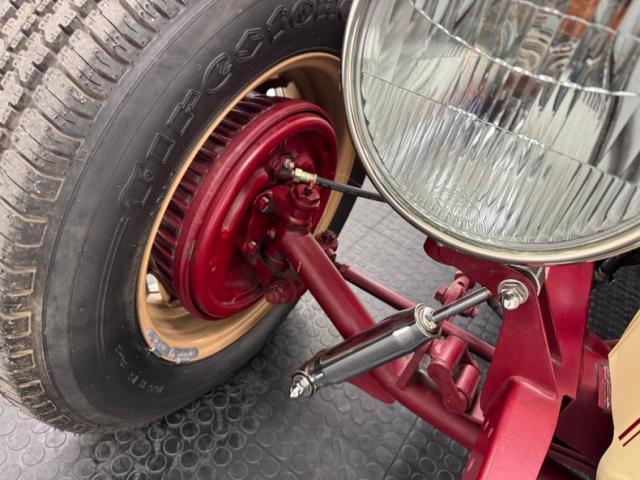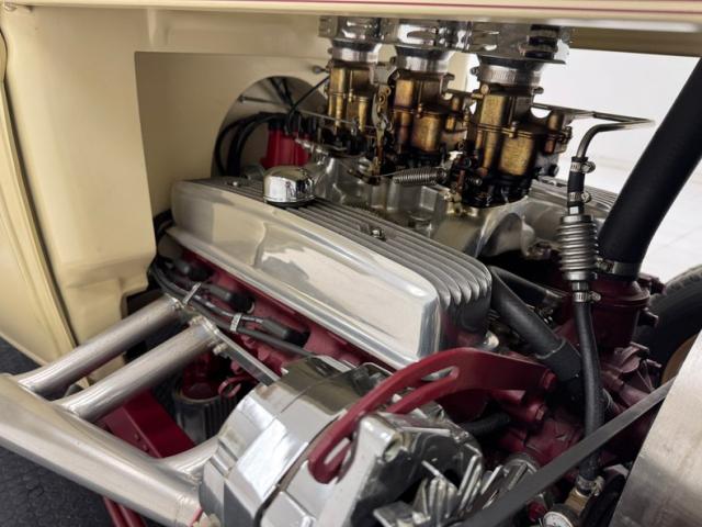 A fantastic choice for the LeBaron Bonney interior connects the outside to the inside as dark red grain vinyl covers the inner doors and bench seat with perfection and the materials are extended to the rear side walls and foot wells. A nice red steering wheel fronts the coordinated dash, tan with a red pinstripe, housing the gauges toward the center, a series of Stewart Warner vintage style, white faced dials. A textured rubber mat covers the floor and the shifter shaft is painted red and topped with a graphic airbrushed knob. The trunk contains a carpeted mat and the aluminum gas tank which, not surprisingly, is painted tan.