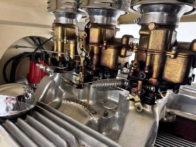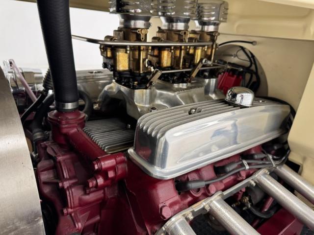 Lakewood headers extend from the sides of the 401ci V8 from a 1965 Buick which is topped by an Offenhauser intake and three 2-barrel 97 carburetors. The transmission is a Toploader 3-speed manual which routes power to the 1957 Oldsmobile axle and 3.23 gears. Finned and polished valve covers along with a number of other polished parts make this exposed engine show worthy. It runs on a 12 volt system.