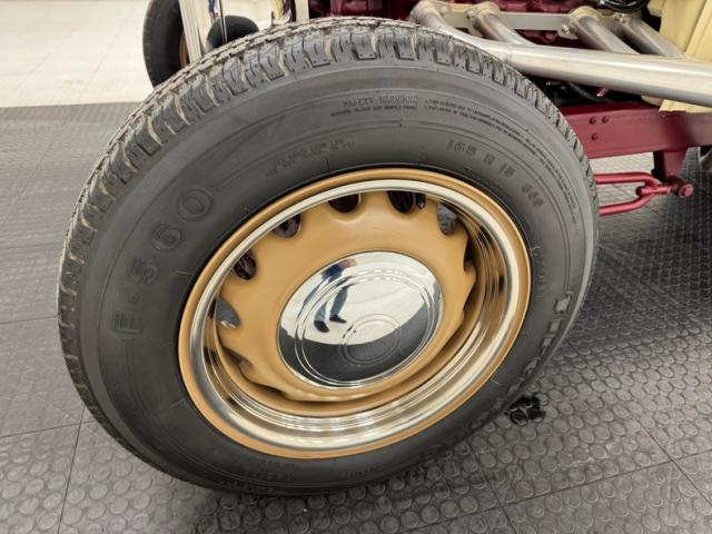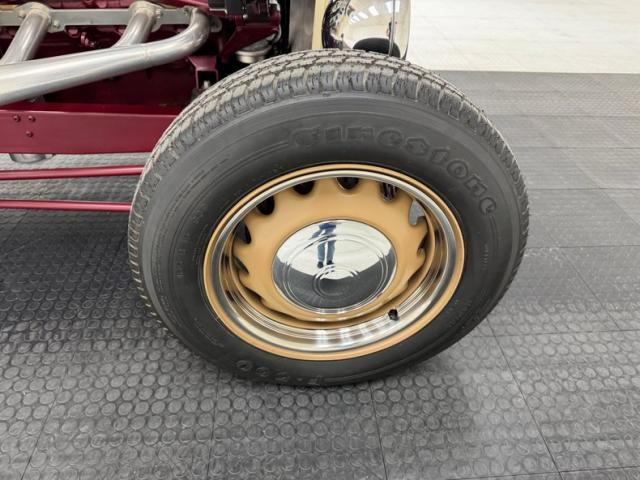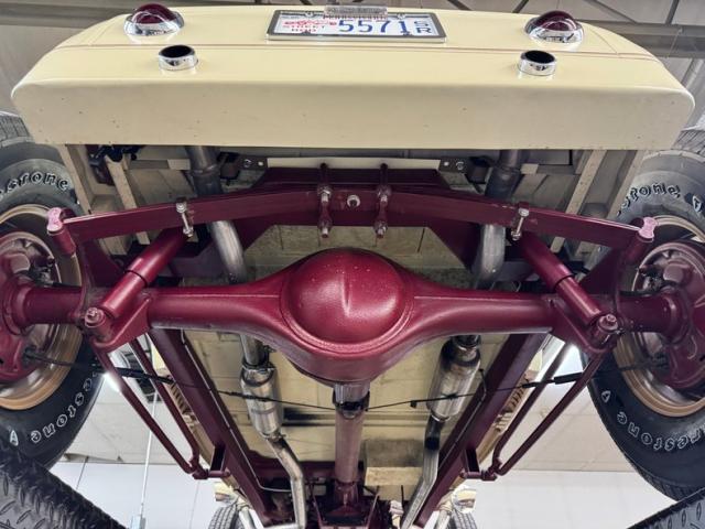 The frame, axles, driveshaft, and wheel components are all painted dark red for a clean and coordinated look underneath. We have drum brakes on all four wheels and the dual exhaust T\'s off the side pipes and flows through glasspack style mufflers on its way out back. The Brookville chassis includes a 4\" drop front axle and transverse leaf springs front and rear.
