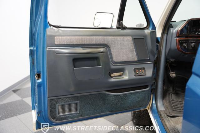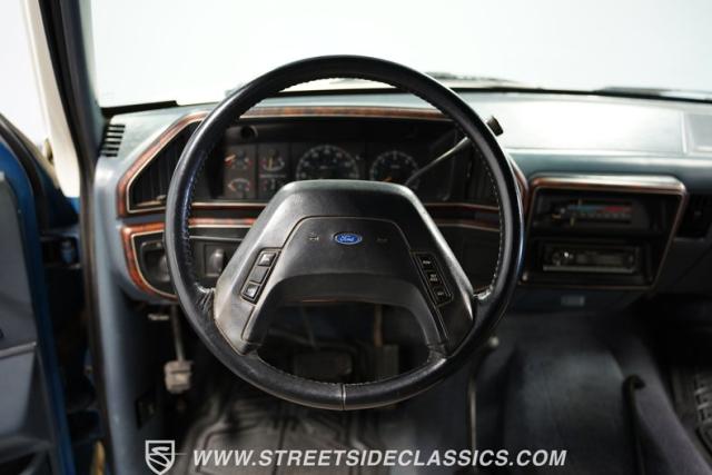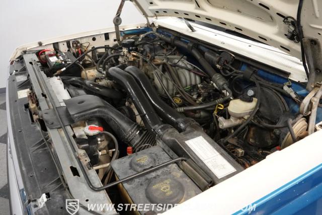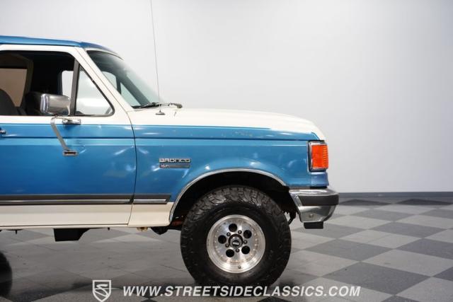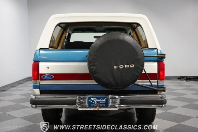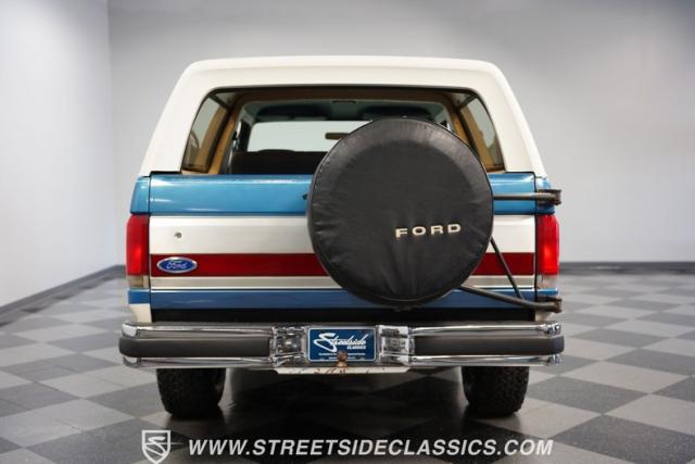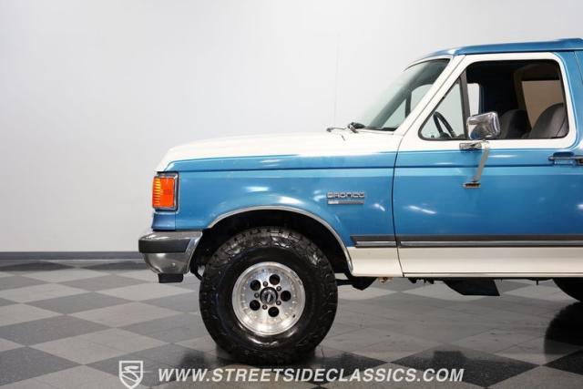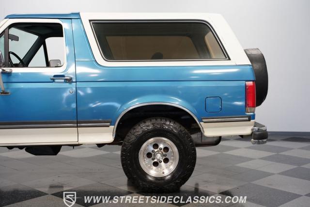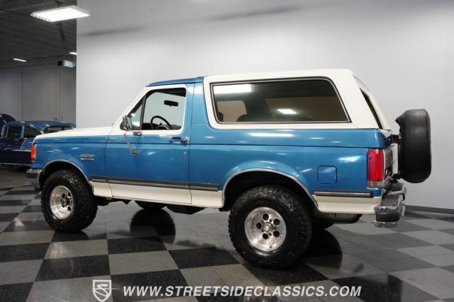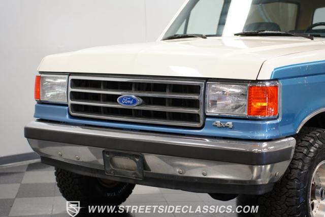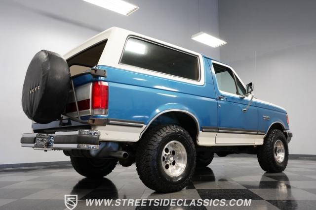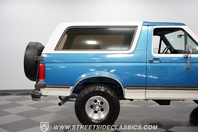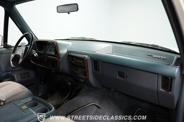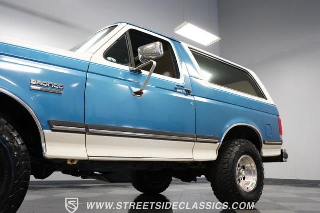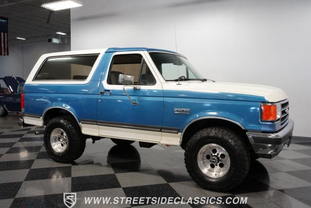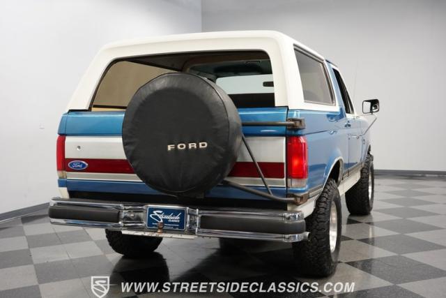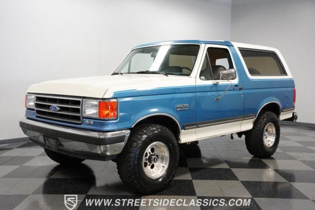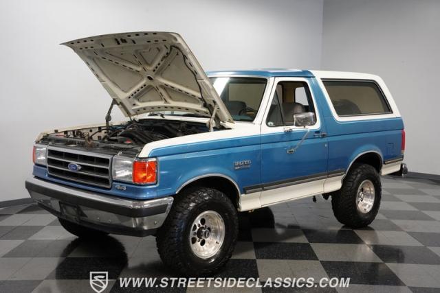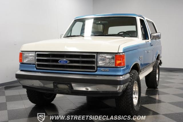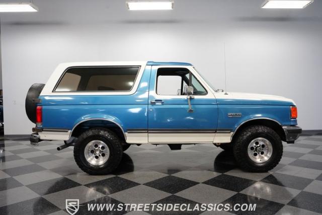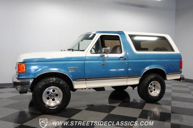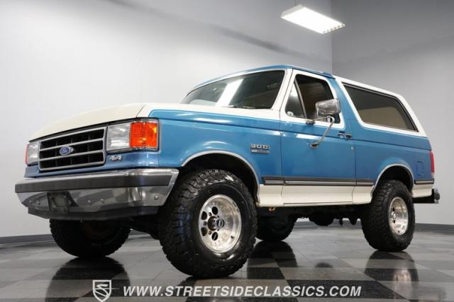 This 1989 Ford Bronco XLT 4X4 has remained in the same family since it was new, with only 64,726 miles on the odometer, which the owner states is actual mileage. The two-tone blue and white exterior creates a classic contrast on Ford\'s legendary off-roader. The raised stance is amplified by brand-new 32X11.50R15LT tires mounted on 15-inch wheels. A removable hardtop and rear tire carrier complete the authentic Bronco profile.