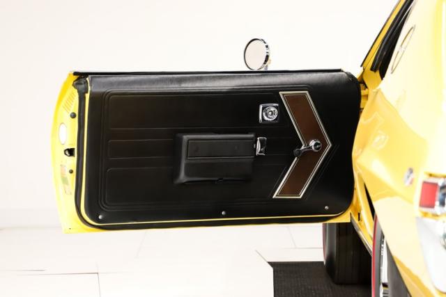 EXTERIOR: It has an unmistakable look, with its short wheelbase giving it a compact, aggressive stance. The long hood, fastback profile, and sculpted body lines deliver classic muscle car proportions with a sporty edge. Claimed to retain its original metal, the body is in amazing condition-laser straight with no rust or damage, and the fit is spot-on. It\'s a factory yellow car, refinished in a richer shade that looks even better, topped with a smooth, high-gloss finish. The white racing stripes really set it off. The chrome and trim add the perfect contrast-the stainless is straight and polished, and the chrome has been redone. The door handles look fresh and it has optional dual mirrors. The windshield appears new, the rear window is one of the best originals you\'ll find. It sits proudly on chrome Magnum 500 wheels wrapped in reproduction redline tires for the perfect finishing touch.