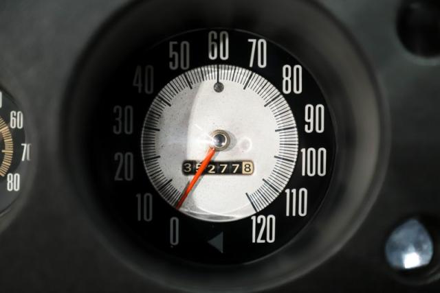 INTERIOR: The two-seater interior looks practically new. The carpet is fresh and fits beautifully front to back. The dash area is exceptionally clean with no splits in the pad, and it features a factory optional tachometer and AM/FM radio. The door panels and armrests are in great shape. The seats have been re-cushioned and upholstered, and both recline as they should. The plastic trim, headliner, and visors all present very well. The original steering wheel is showing just a couple cracks in the rim. The best feature? The Hurst 4-speed shifter rising from the floor-pure muscle car attitude.