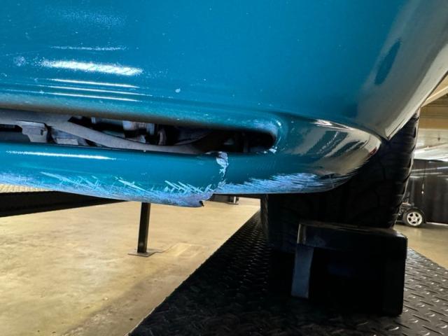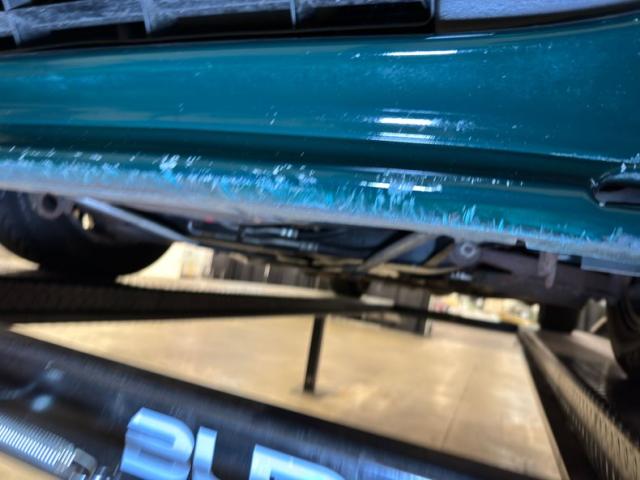 Underneath we note some surface rust, some pitted, but structurally sound metal makes up the unibody, and floor pans as well as the rockers. Independent suspension is on all 4 corners, coil springs in front and coil overs in the rear. Dual exhaust handles the exhale and connects to original equipment mufflers and all is looking good in this neighborhood. We note some oil on the oil pan and flywheel cover.