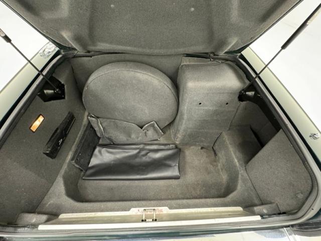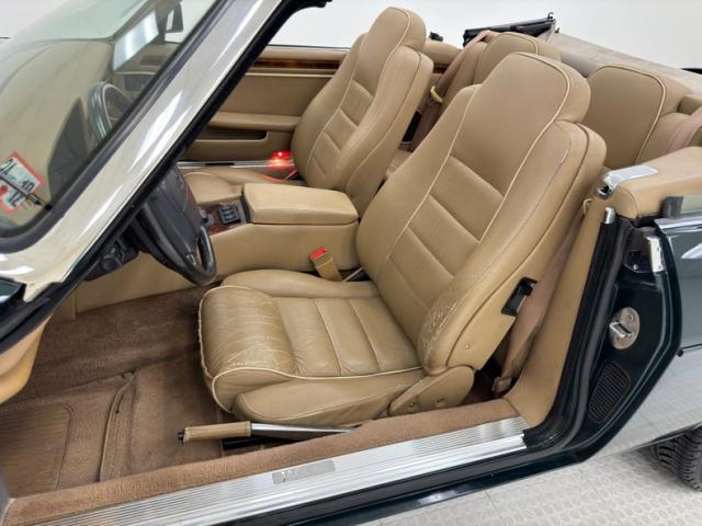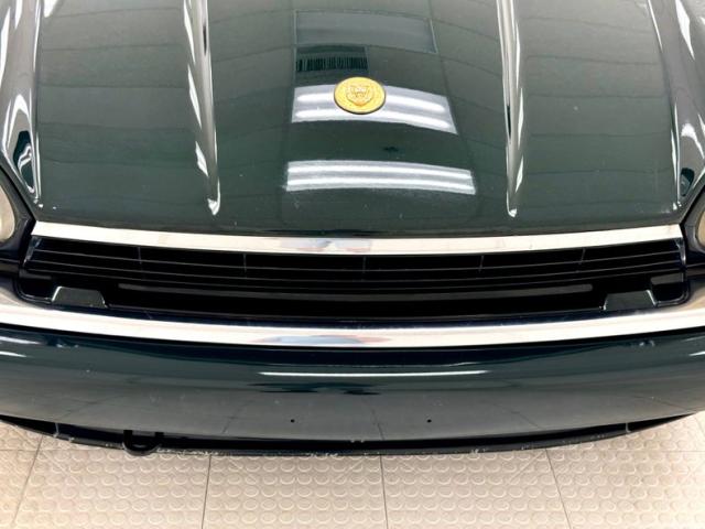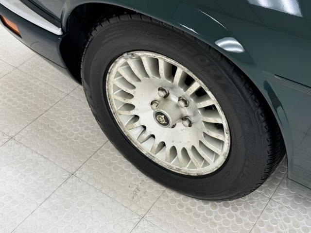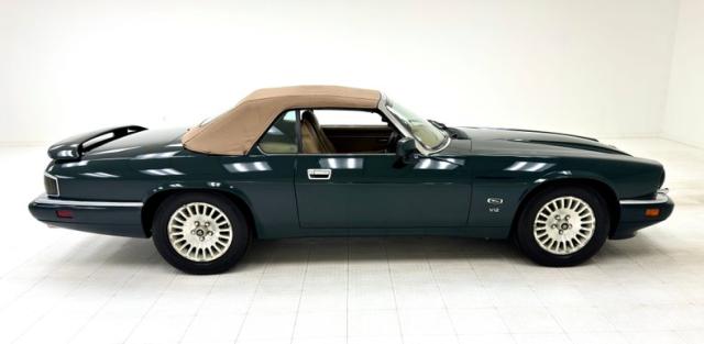 This Jaguar is finished in British Racing Green, now an iconic color on this car\'s sleek body with a muscular stance, often seen on expensive European cars that are capable of high speeds. Straight panels and good gaps are noted as well as European headlights upfront, bordered on the bottom by body matched bumper cover with chrome header that houses headlight washers providing slight protrusions. The chrome is excellently preserved here and on the back bumper. Smoked tail lights span almost the entire width of the car, breaking only to allow a license plate, topped by a rear deck wing and above twin chrome exhaust tips. 16-inch wheels are all around and they would benefit from a refinishing. The tan canvas top is in good condition and houses a glass window. Imperfections included some faded emblems, lots of chin scrapes and a cracked piece, and scuffs on the left and right side of the rear bumper cover.
