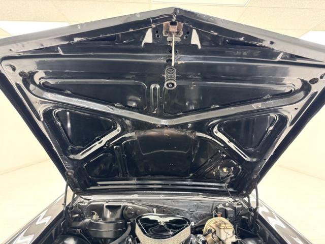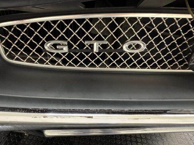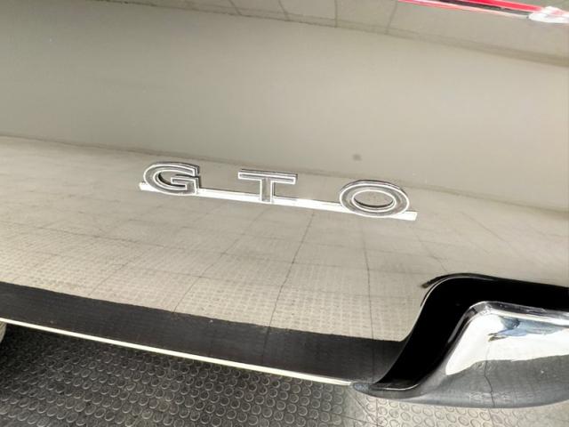 Standard black vinyl door cars wear the GTO badge and terminate with a strip of black carpet with one small tear on the driver\'s side but otherwise clean. Black vinyl bucket seats are up front with some wear on the driver\'s piping while all others appear flawless. A wood colored 3 spoke steering wheel greets the driver ahead of the woodgrain faced dashboard, a remnant aesthetic feature that ended up in a lot of muscle cars as personal luxury performance cars. Four circular gauges fill the front while heat and air controls fill a simple panel in the middle atop an AM/FM radio followed by an added triple gauge cluster. In the center console, the epic Hurst dual gate, (His/Hers), shifter resides allowing one to drive as normal or slam the shifter through the gears. The floor is covered in nice black carpet the trunk shows use on its plaid vinyl mat.