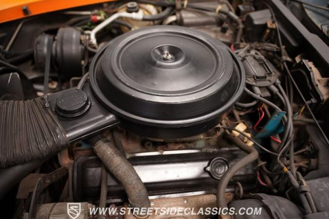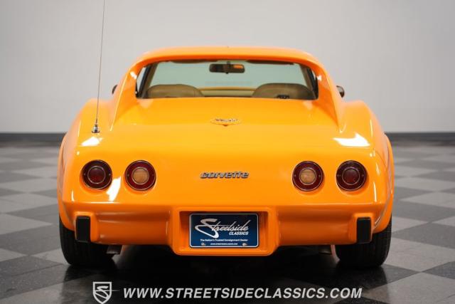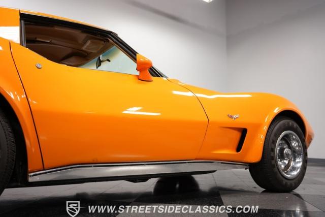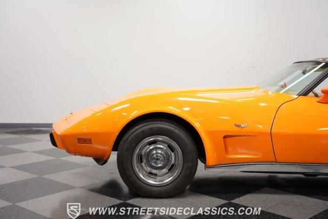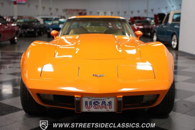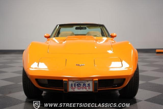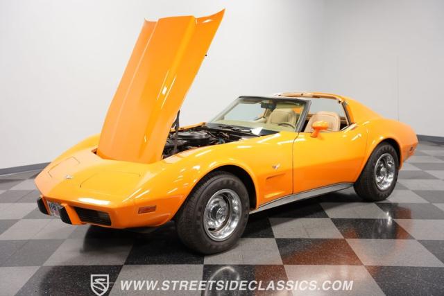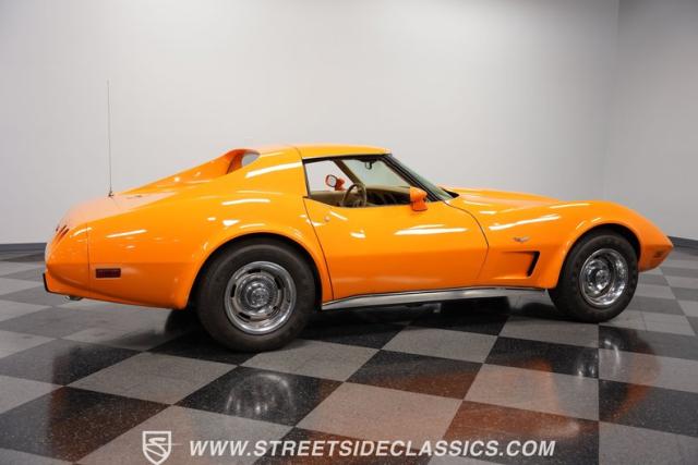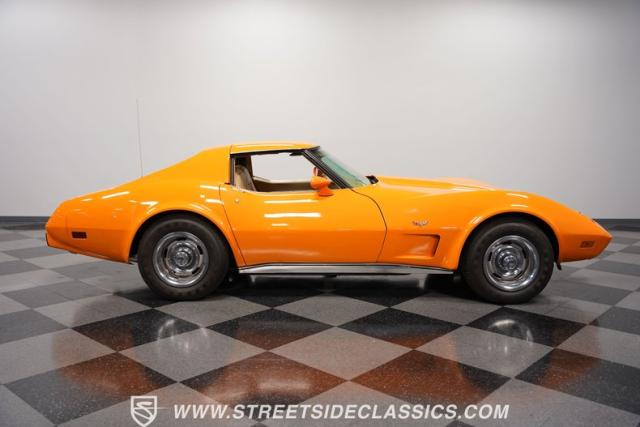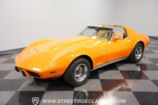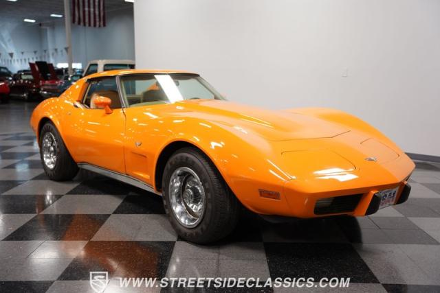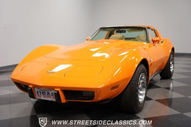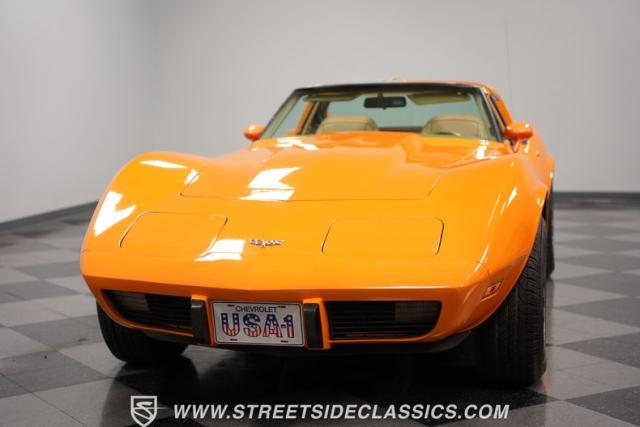 This 1977 Chevrolet Corvette stands as a striking embodiment of an illustrious past. Bathed in an exclusive Corvette Orange hue, this vibrant shade graced the Corvette palette for a fleeting moment unique to its birth year. Much like disco balls twirling under glimmering lights, this Corvette, with its shimmering paintwork, perfectly captures the spirit of 1977. Riding on period-correct 15\" wheels encased in 225/70R15 tires, it boasts a confident stance and assured grip. The T-Tops beckon, inviting the driver to embrace the open, explorative spirit that defined the year of its inception.