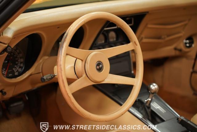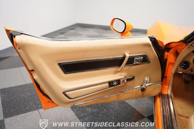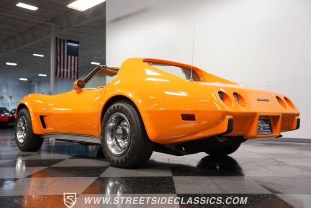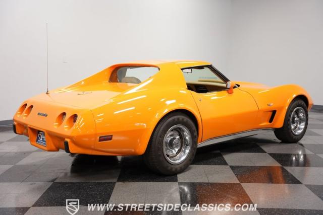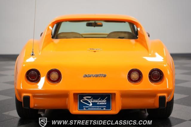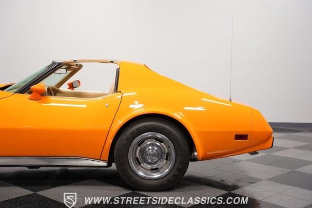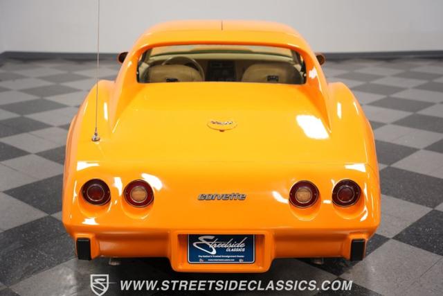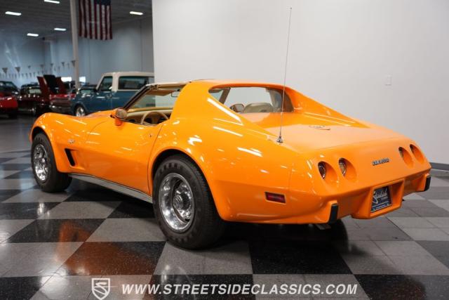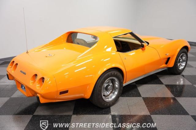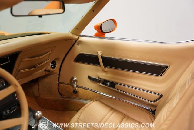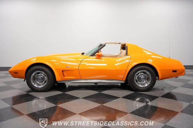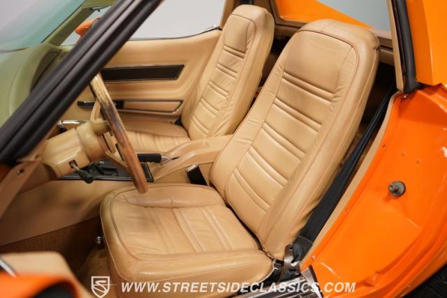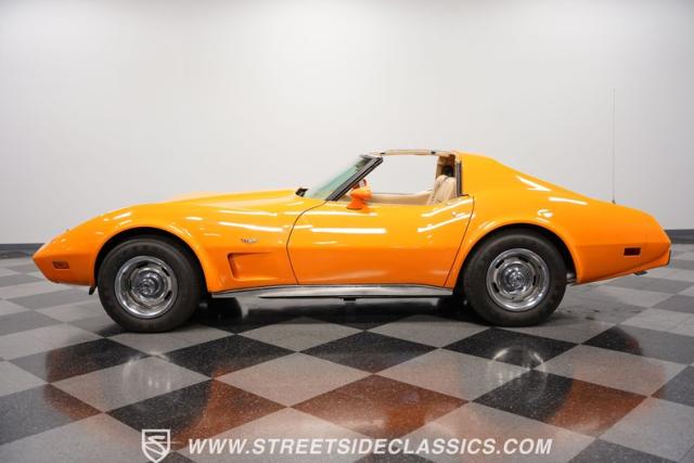 This 1977 Chevrolet Corvette stands as a striking embodiment of an illustrious past. Bathed in an exclusive Corvette Orange hue, this vibrant shade graced the Corvette palette for a fleeting moment unique to its birth year. Much like disco balls twirling under glimmering lights, this Corvette, with its shimmering paintwork, perfectly captures the spirit of 1977. Riding on period-correct 15\" wheels encased in 225/70R15 tires, it boasts a confident stance and assured grip. The T-Tops beckon, inviting the driver to embrace the open, explorative spirit that defined the year of its inception.