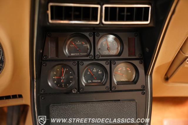 Step inside, and you\'re immersed in a world of Buckskin Tan. The leather seats, echoing tales of sportiness and speed, offer a tactile connection to the Corvette\'s rich heritage. Restored to its former glory yet maintaining its original color scheme, the interior exudes an authentic charm. The floor-mounted shifter commands attention, urging you to engage fully with every drive. The well-preserved gauges contribute to this Corvette\'s rich interior and inform you of the vitals.