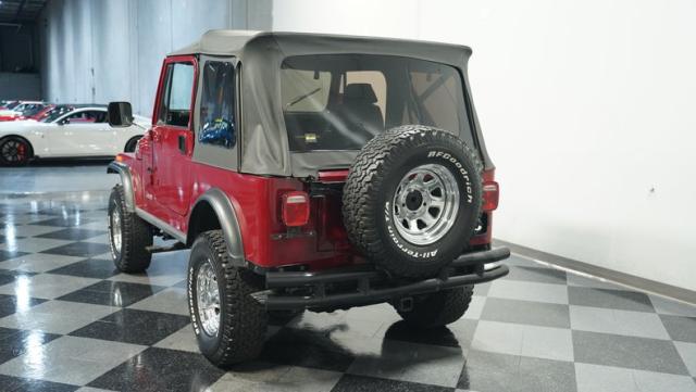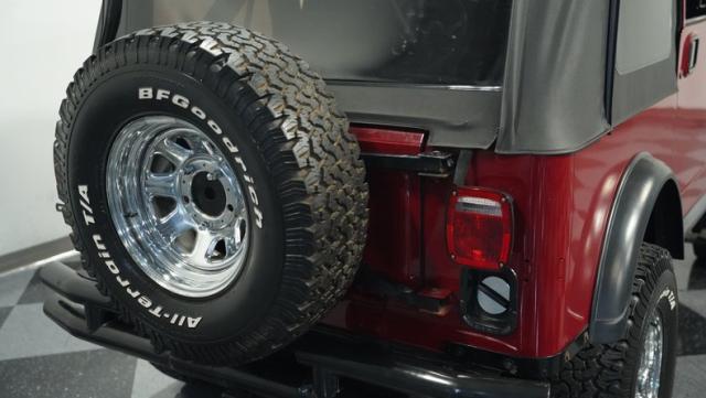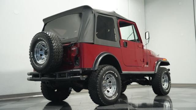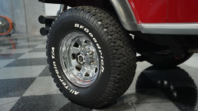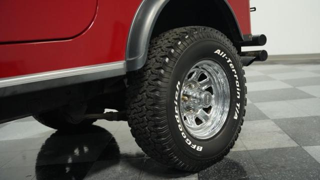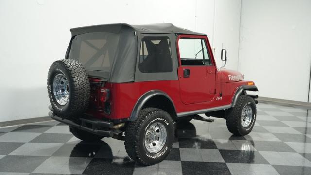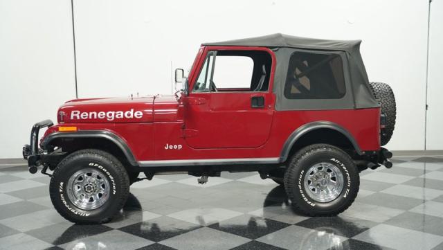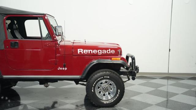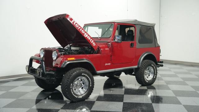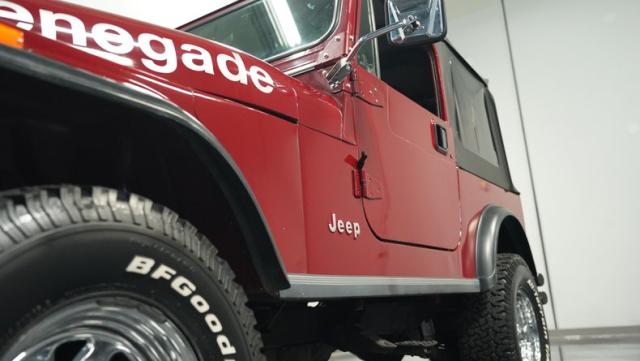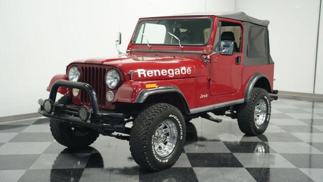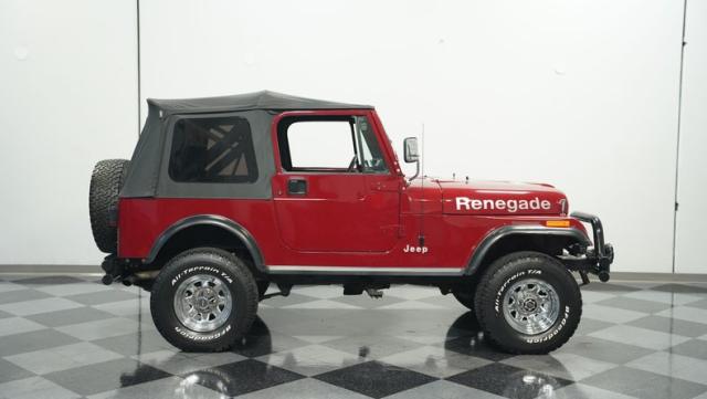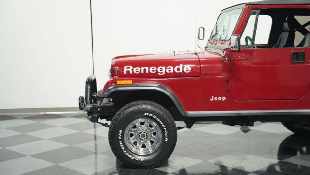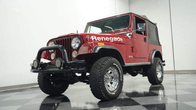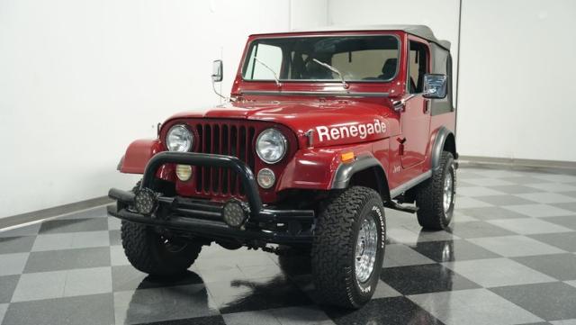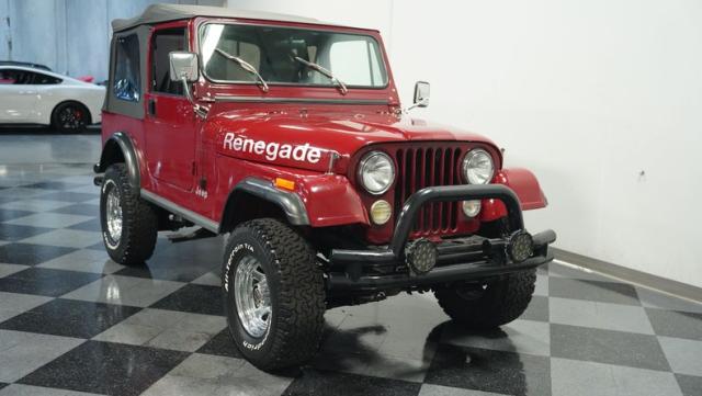 This 1980 Jeep CJ7 Renegade roars with rugged American muscle. Its burgundy exterior, adorned with bold gold decals, showcases the iconic Renegade styling. The aggressive stance is amplified by factory star wheels wrapped in beefy 31X10.5R15 BFGoodrich all-terrain tires, ready to tackle any terrain. An aftermarket push bumper with LED lighting guards the front, while a matching tube bumper and full-size spare protect the rear. The soft top, appearing recently updated, adds versatility for open-air adventures or shelter from the elements.