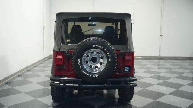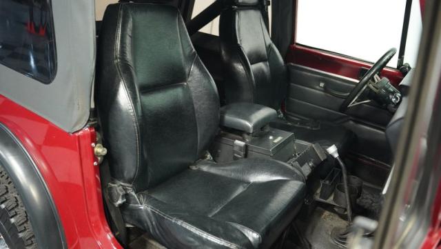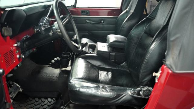 Inside, the black interior exudes utilitarian toughness. Aftermarket Bestop bucket seats offer improved comfort and support for off-road excursions. The cabin features practical upgrades like a locking center console with radio storage and auxiliary gauges for temperature, oil pressure, and voltage. An aftermarket radio provides the soundtrack for your outdoor escapades. The no-frills design emphasizes function over form, staying true to the Jeep\'s adventurous spirit.