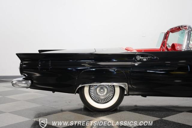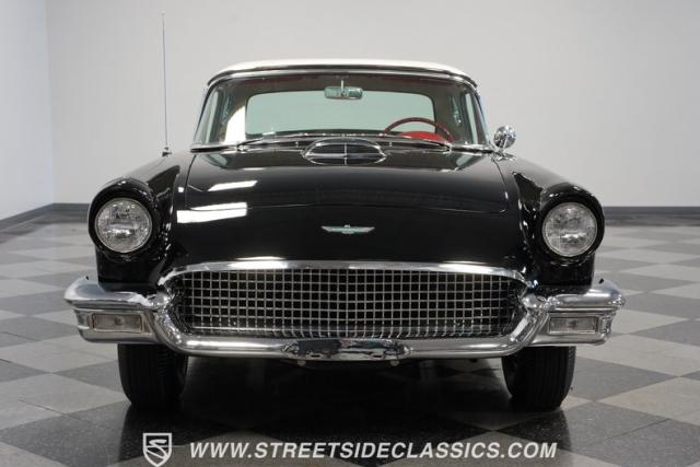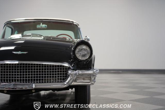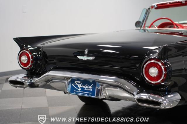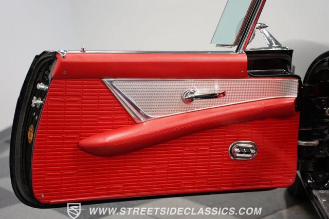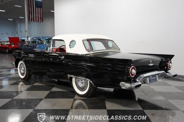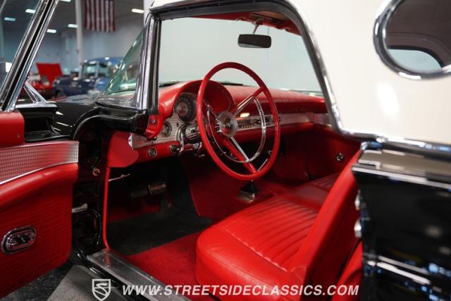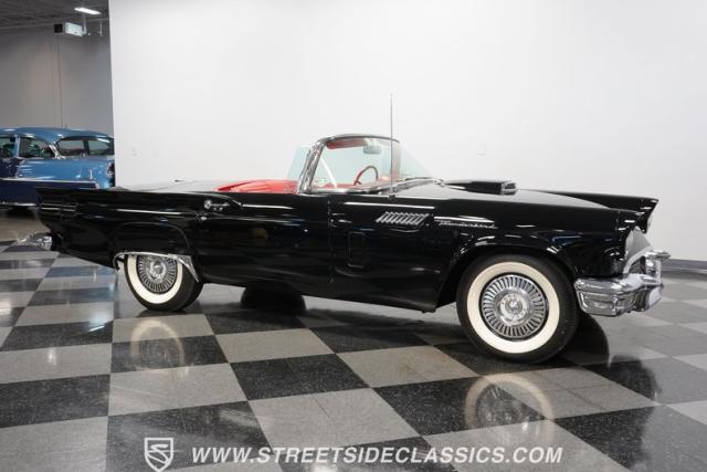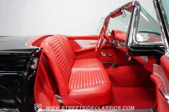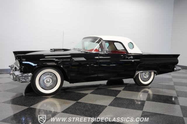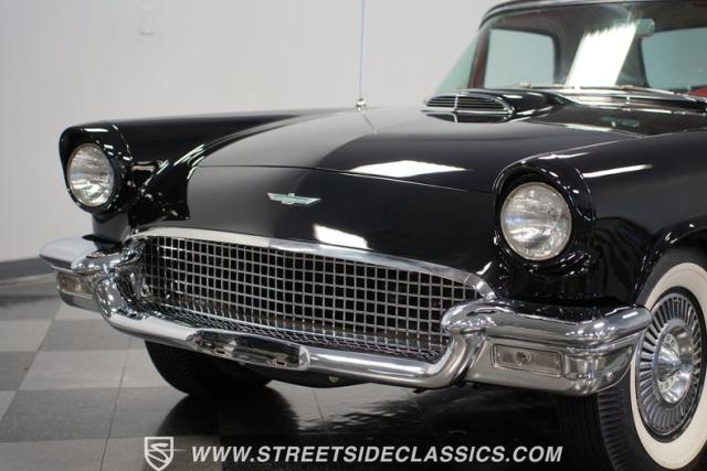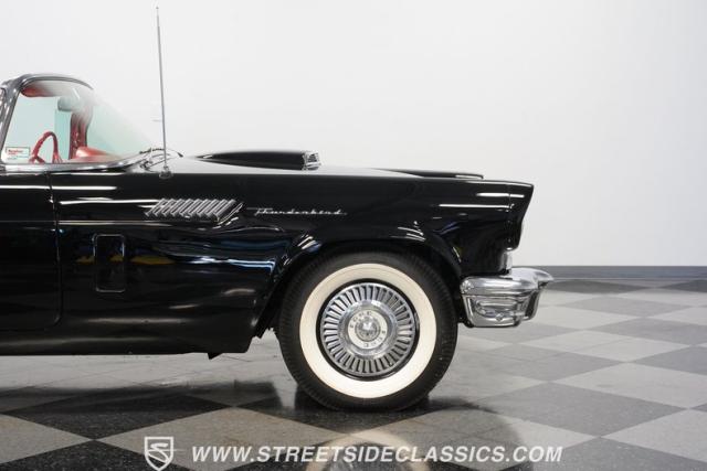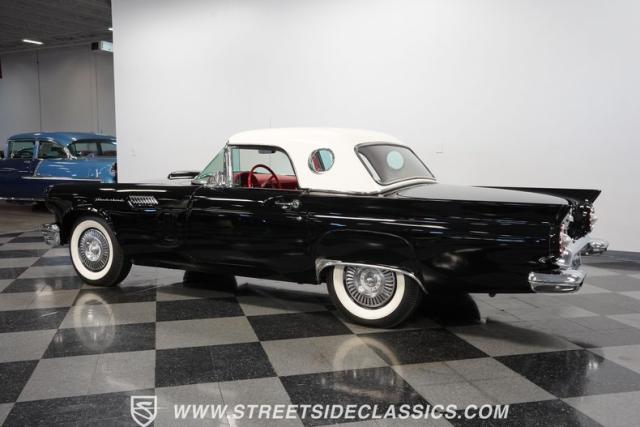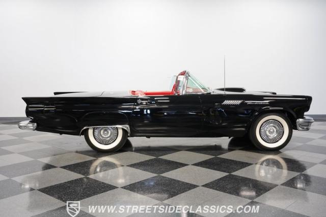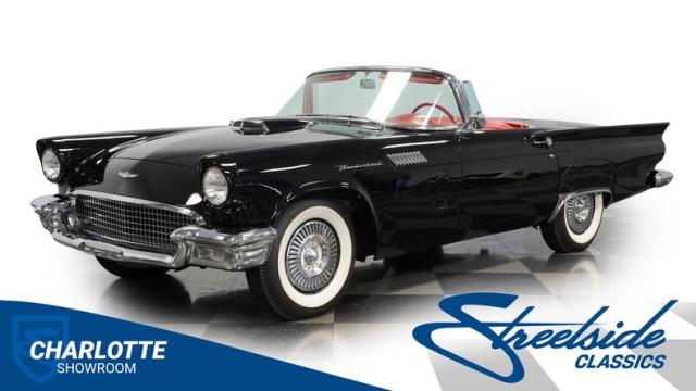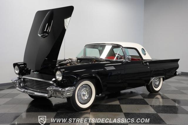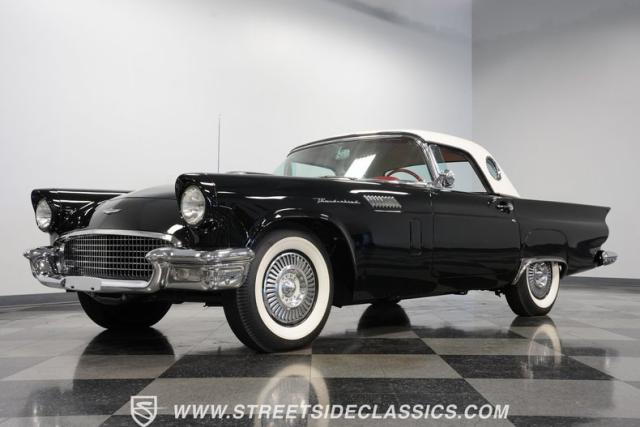 The 1957 Ford Thunderbird F Code hails from an era when cars were all about personality. It boasts a supercharged 312 V8 engine, a Flame Red interior as inviting as a classic diner booth, and a Raven Black exterior with a removable white hardtop. This look mirrors the sleek sophistication of the \'50s. Feel the pulse of the \'50s with every mile. Call today!