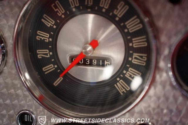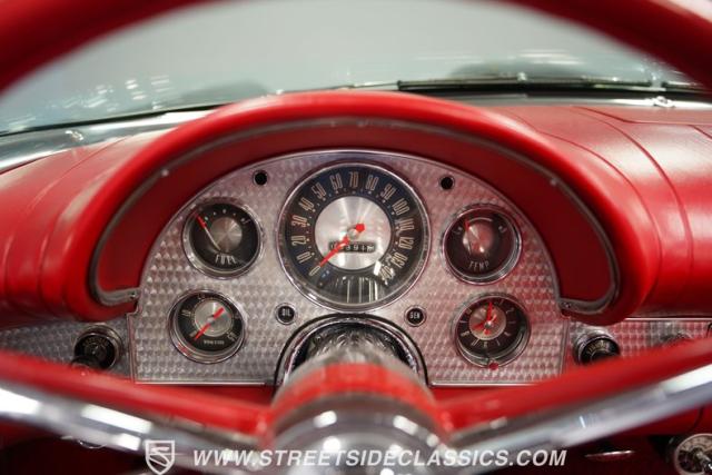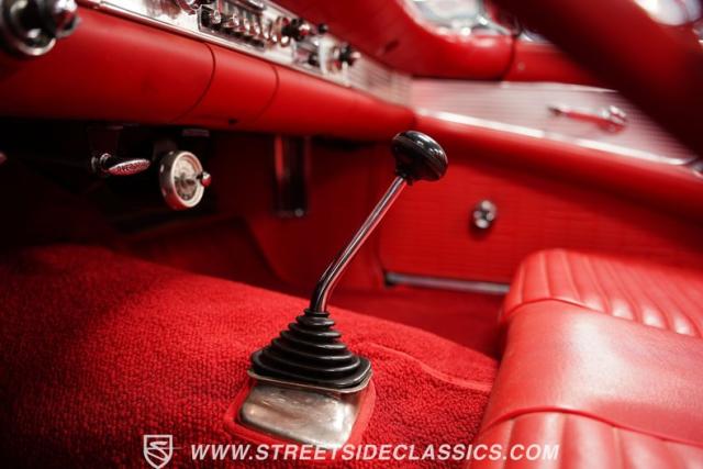 To be precise, the interior is as vibrant as a flame Flame Red. The vinyl seats beckon with a promise of comfort and style, the bench seat design offering a welcoming embrace. There\'s no center console, just the unadulterated classic design with a floor shifter that promises a winning driving experience. It\'s an interior fully restored to mirror the spirit of \'57, down to the AM radio.