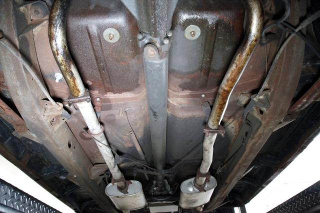 Surface rust in various stages of thickness abounds on this undercarriage. Some oiling areas from the bottom end of the engine and the rear pumpkin have kept it at bay. The frame has surface rust as do the rockers and wheel wells. Headers and a Dynomax exhaust system allow for the big exhale. Independent coil springs are in front and leaf springs are on the back. Power disc brakes now in front and power drums in back.