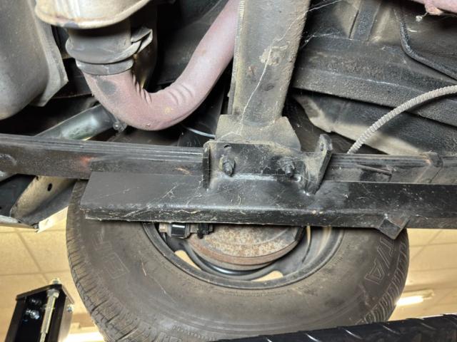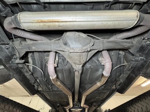 Super clean underneath with dual exhaust taking center stage and flowing through a stock style transverse muffler that gives way to polished tailpipes. Power brakes are supplied as front discs and rear drums and suspension consists of coil springs up front and leaf springs with traction bars in back. We note some residual oil on the pan and a drop on the transmission as well as some sling by the front U-joint.