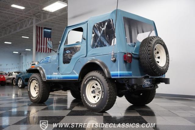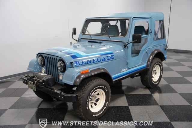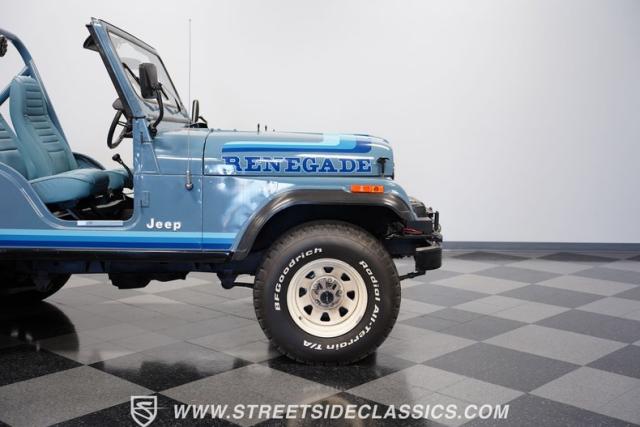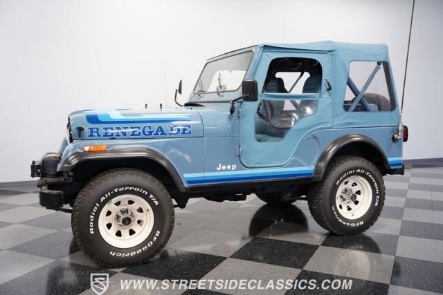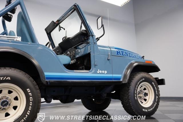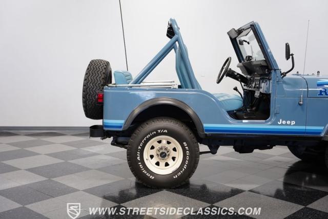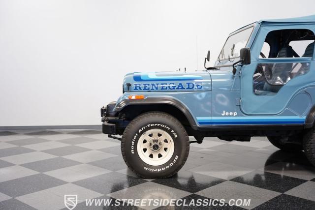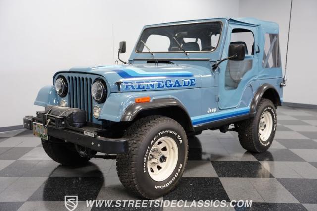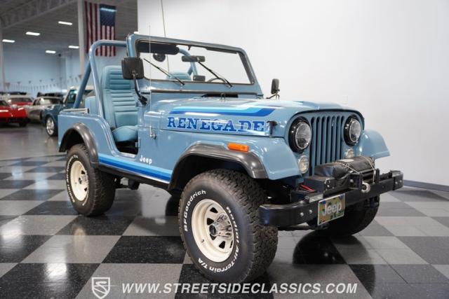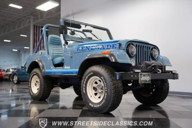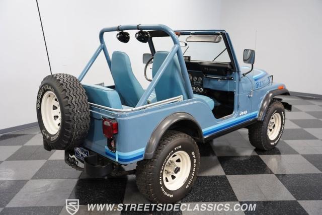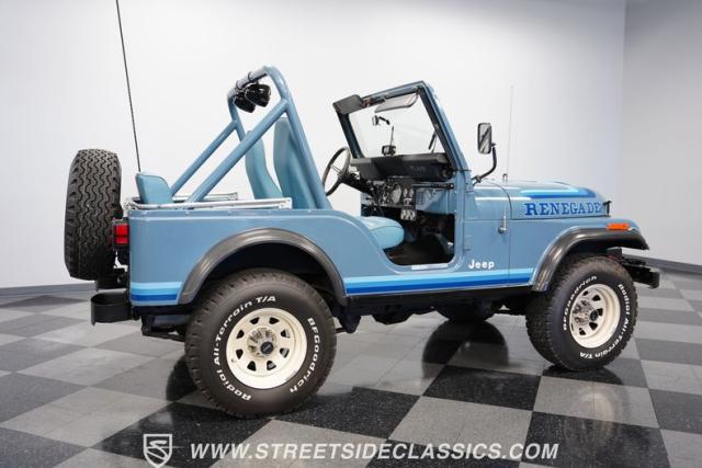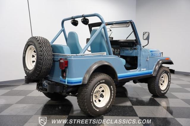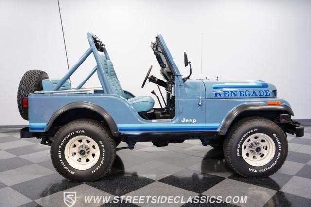 The 1981 Jeep CJ5 Renegade is a rugged and stylish representation of the Jeep\'s iconic off-road capabilities. This model, a tribute to the unique Levi Edition, stands out with its classic blue finish and 4.2L engine, ready to tackle any terrain. The Jeep CJ5 series has always been celebrated for its simplicity and effectiveness in off-road conditions, and this tribute edition is no exception. This Jeep features a manual 4-speed transmission, providing hands-on control. While not original to the Levi Edition, the interior maintains a classic style with blue vinyl bucket seats and original-style under-dash gauges, including a pitch/yaw meter. The exterior of the Jeep is striking in blue, complemented by 15\" wheels wrapped in 31x10.50R15 tires, offering excellent traction for off-road adventures. The vehicle has a Dana 30 front axle and Dana 20 rear axle, ensuring durability and reliability in various driving conditions. The suspension system, featuring leaf springs on both front and rear, is designed to handle rough terrains easily.