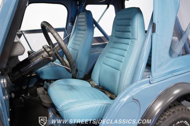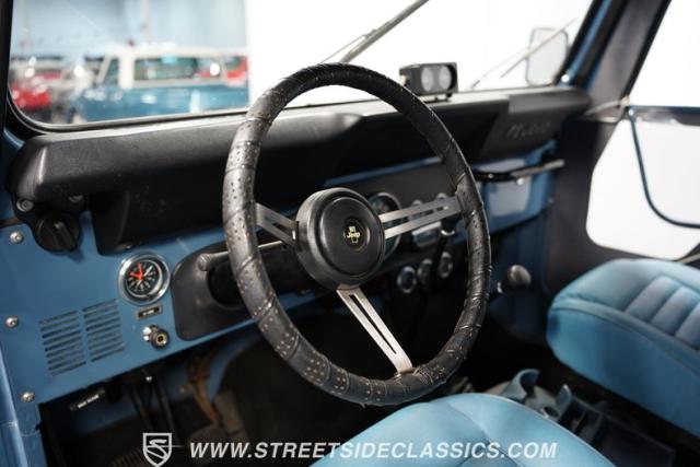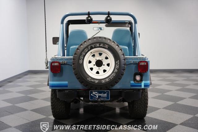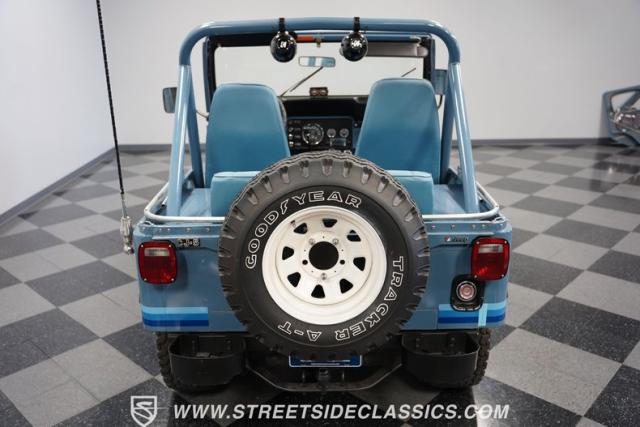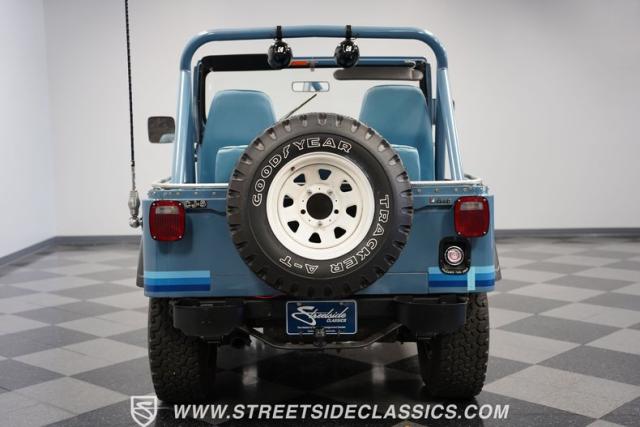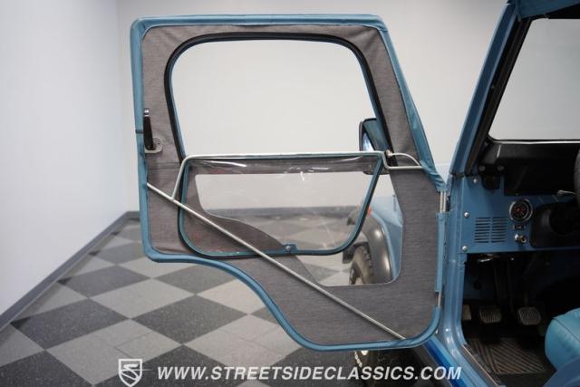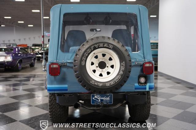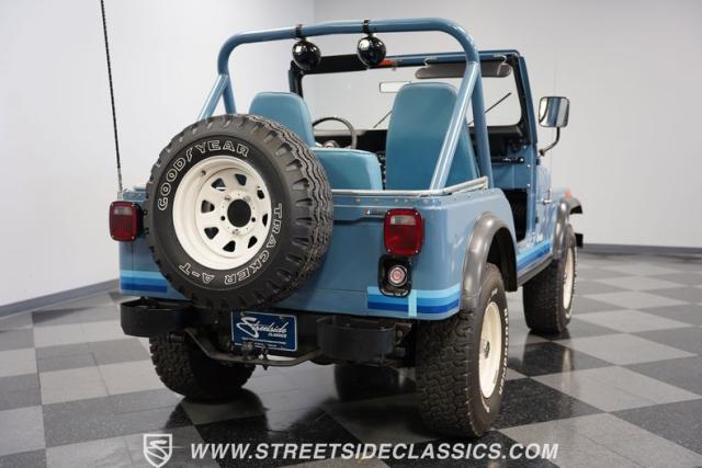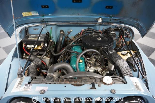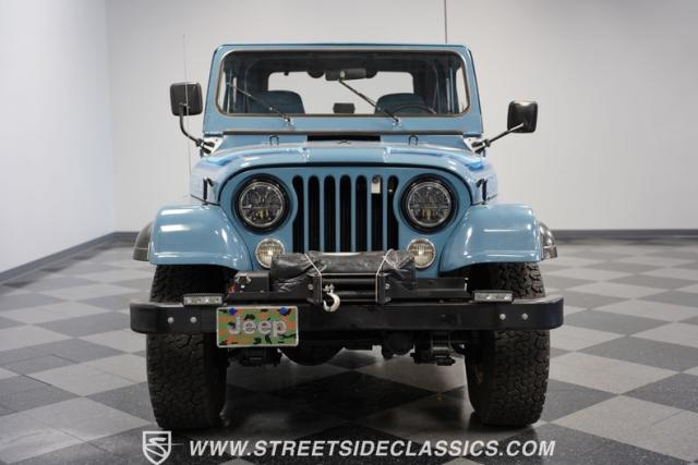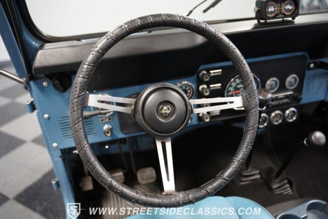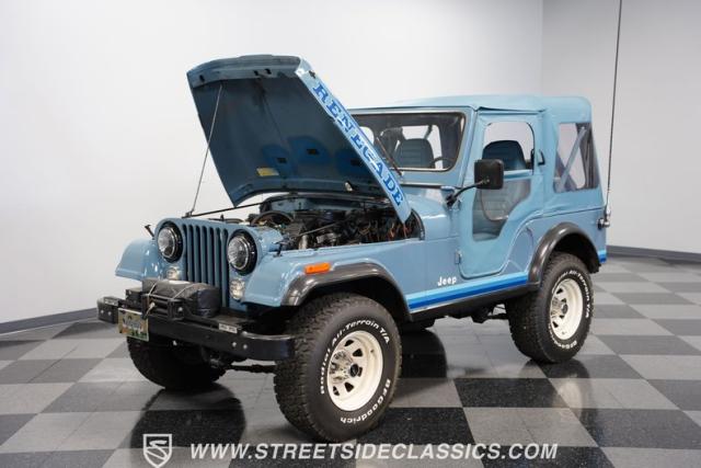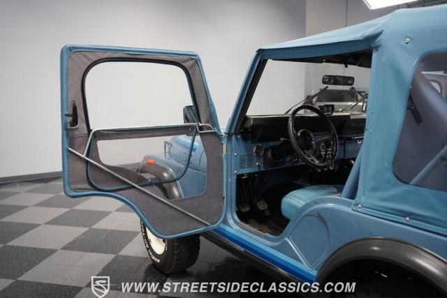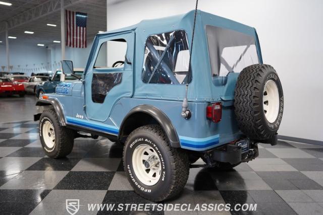 The 1981 Jeep CJ5 Renegade is a rugged and stylish representation of the Jeep\'s iconic off-road capabilities. This model, a tribute to the unique Levi Edition, stands out with its classic blue finish and 4.2L engine, ready to tackle any terrain. The Jeep CJ5 series has always been celebrated for its simplicity and effectiveness in off-road conditions, and this tribute edition is no exception. This Jeep features a manual 4-speed transmission, providing hands-on control. While not original to the Levi Edition, the interior maintains a classic style with blue vinyl bucket seats and original-style under-dash gauges, including a pitch/yaw meter. The exterior of the Jeep is striking in blue, complemented by 15\" wheels wrapped in 31x10.50R15 tires, offering excellent traction for off-road adventures. The vehicle has a Dana 30 front axle and Dana 20 rear axle, ensuring durability and reliability in various driving conditions. The suspension system, featuring leaf springs on both front and rear, is designed to handle rough terrains easily.