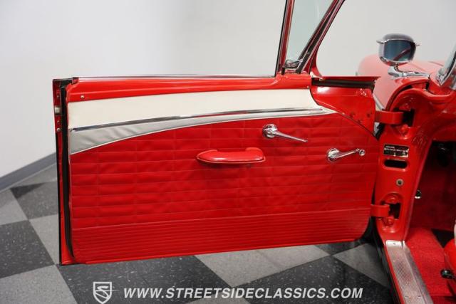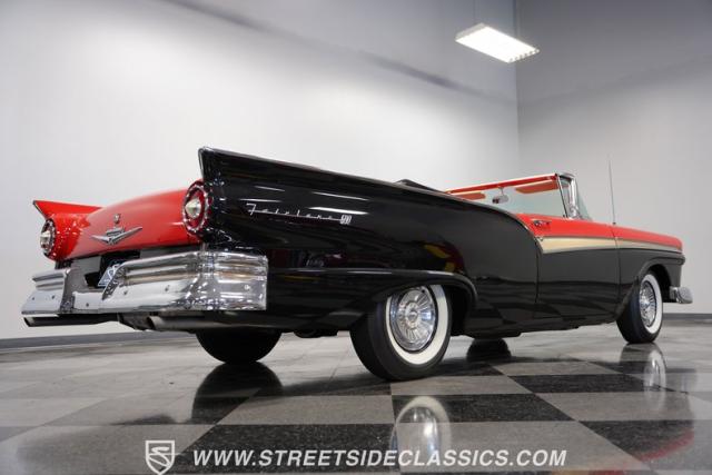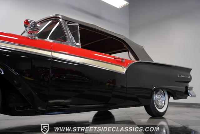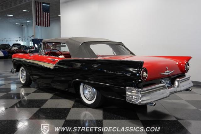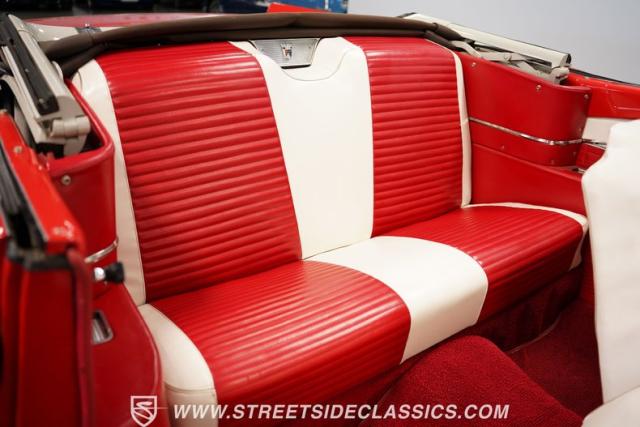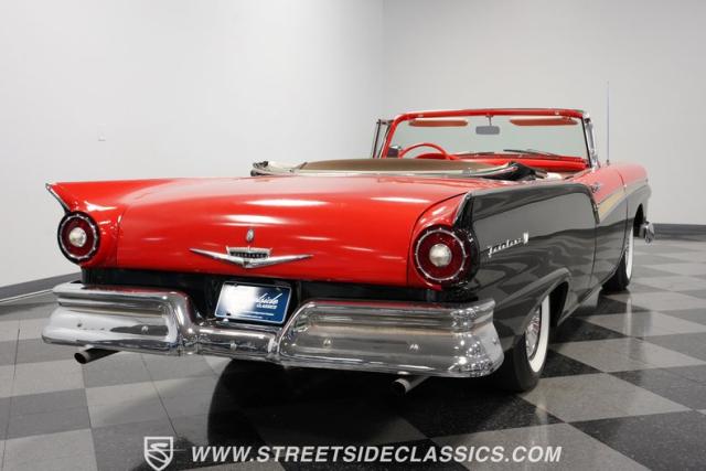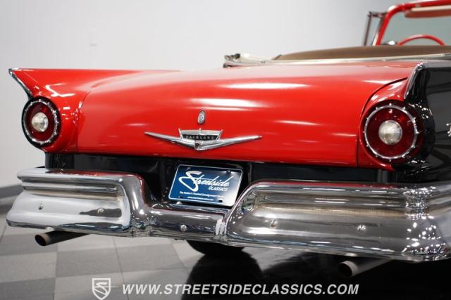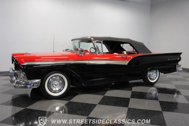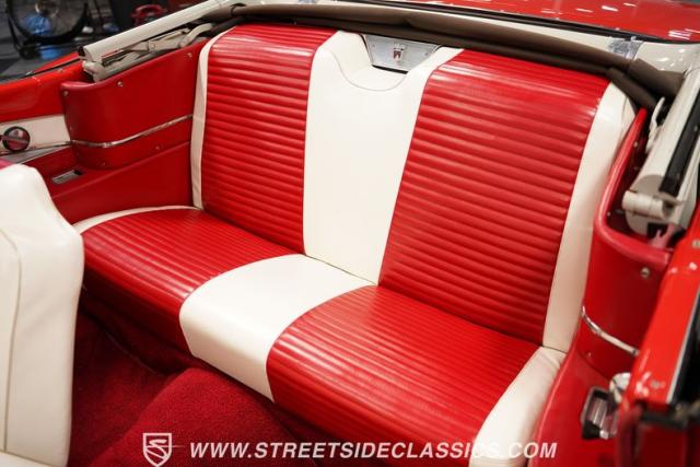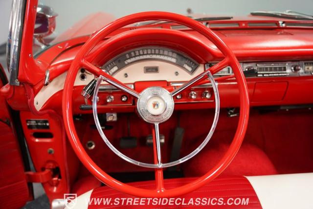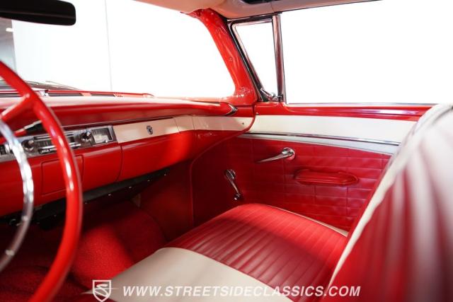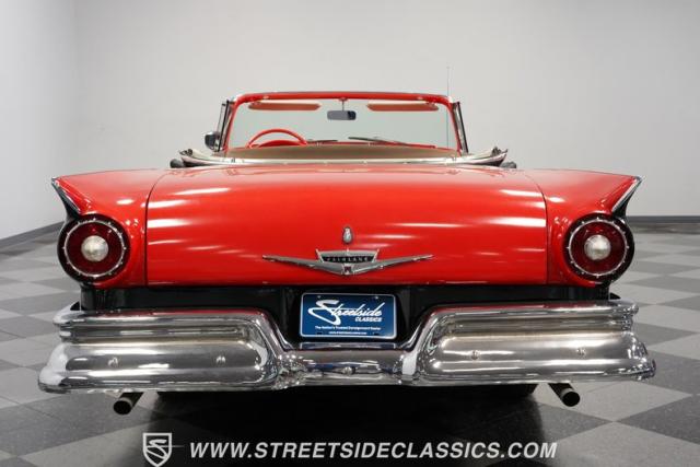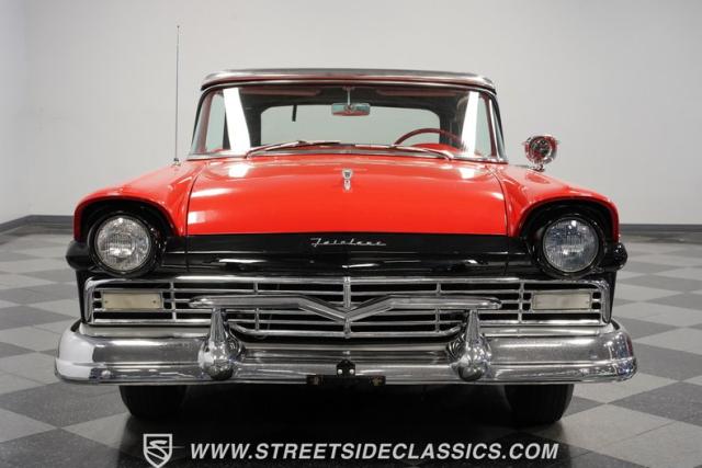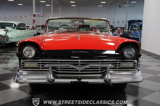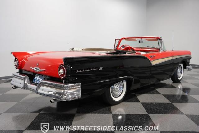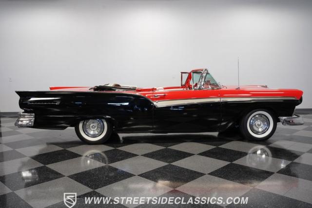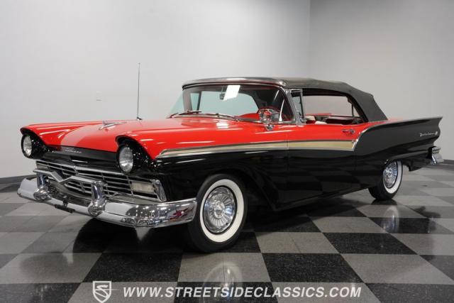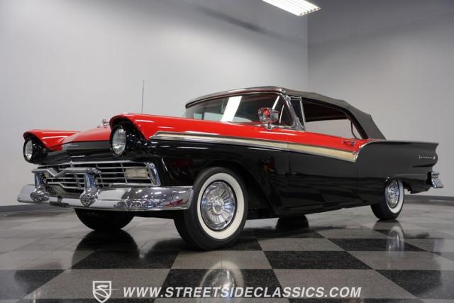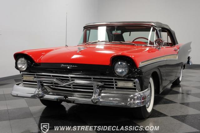 Despite the fuss about the 1957 Chevrolets, the year\'s top-selling convertible was the Ford Fairlane 500, which notched 77,728 happy customers against Chevy\'s 47,562. The 1957 Ford Fairlane 500 Sunliner convertible is five inches lower and nine inches longer than the 1956 cars. Fin fins took up almost half the length-\"high canted fenders\" in Ford speak-and a golden flash led from the headlight to the beginning of the fin at the rear of the door. This beautifully restored Sunliner is finished strikingly in Flame Red over Raven Black with a matching black convertible top. The restoration is somewhat older, however this classic remains in excellent condition today - a testament to the quality of the restoration and the care it has received. A wide whitewall radial tire set adds to this Ford\'s good looks. Built new in California, this glamorous convertible has options and accessories that include a spotlight mirror, chrome front V-Bar, Town & Country Wonderbar radio, and super-rare factory air conditioning with unique integrated air vents at the windshield base.