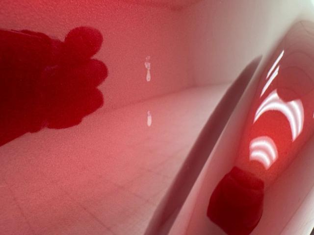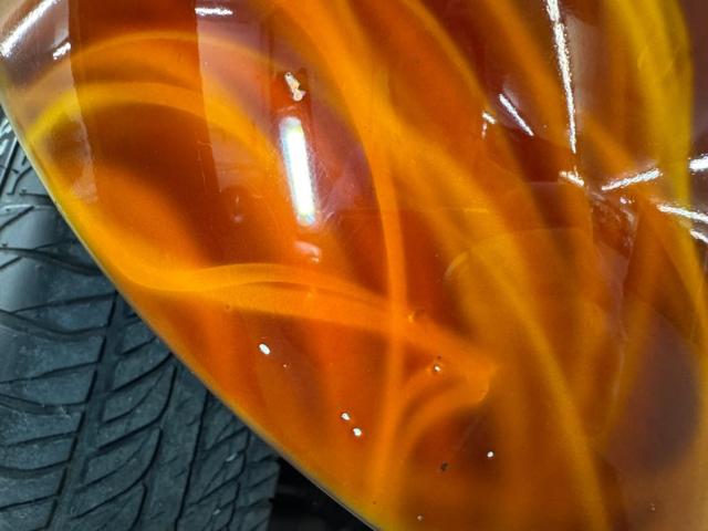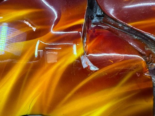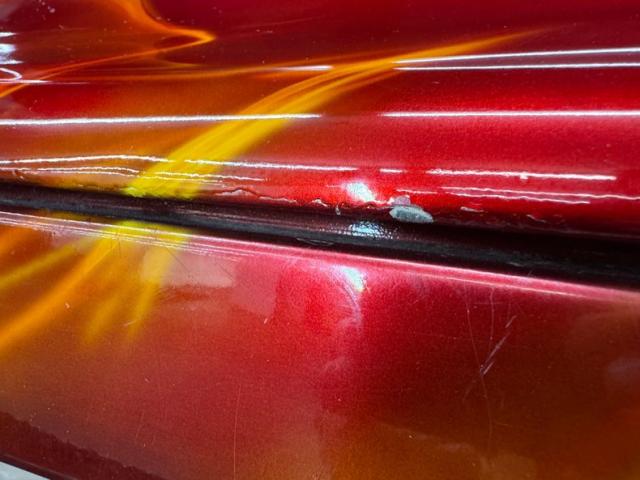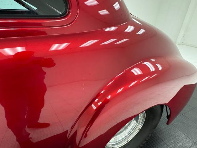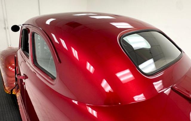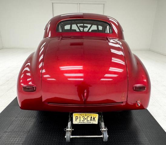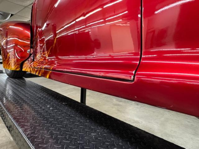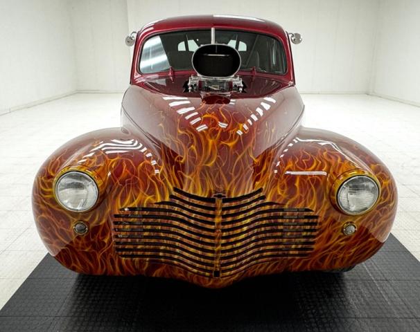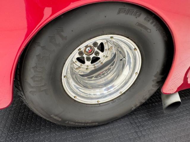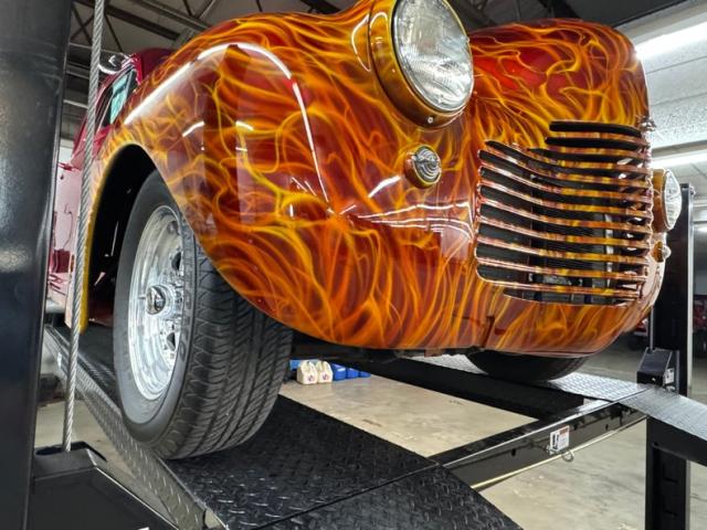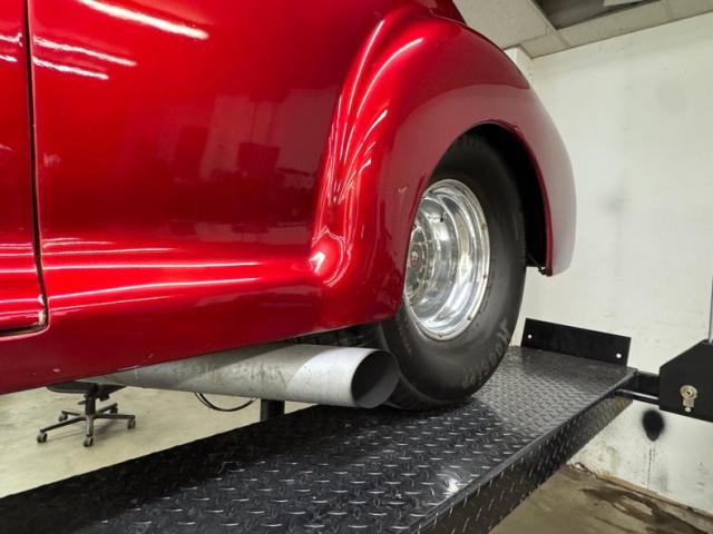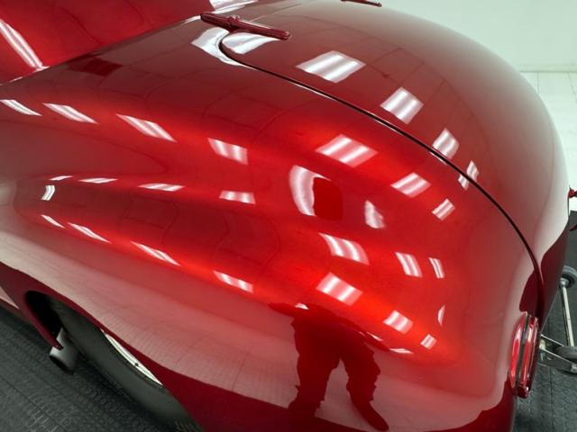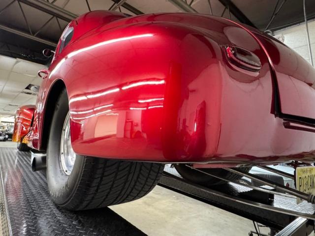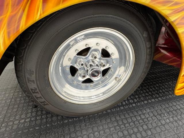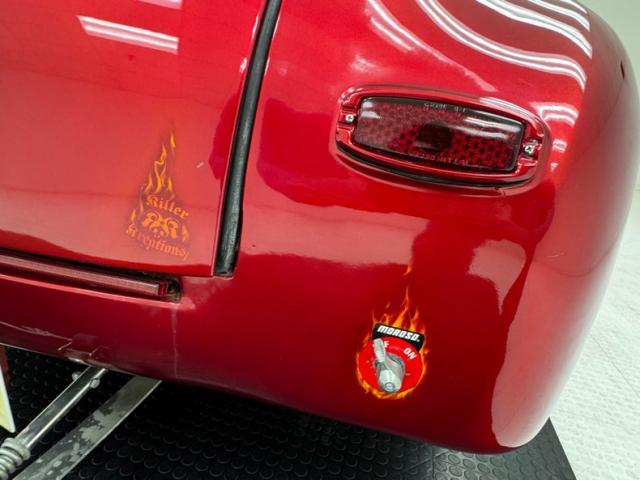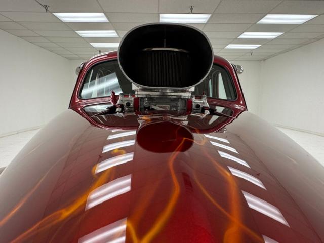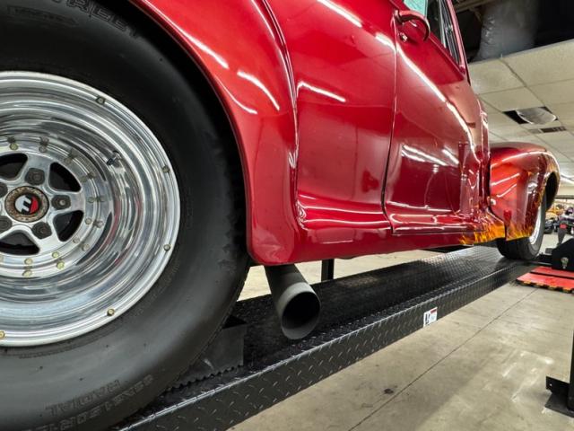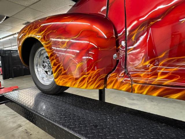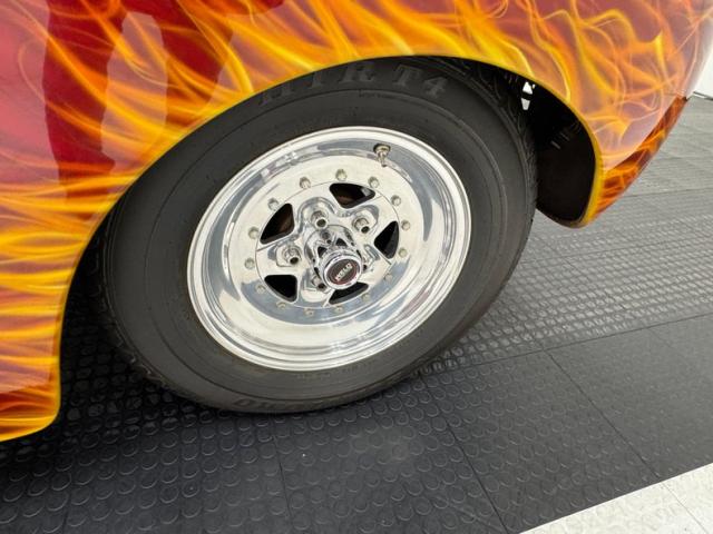In true street rod fashion, this car features front flames that lick rearward with a realism that had us reaching for an extinguisher! It\'s a nice presentation over the Ruby Red Metallic body which glistens like a piece of wet candy, reflecting light off of the curved shoulder line, the articulated rear fender, and the rounded rump. A supercharger pushes up a massive air scoop above the hood and whatever goes on under that hood is expelled through big exhaust pipes in front of each front wheel. Those wheels are 15-inch Weld wheels with deep set, tubbed units in back and more pedestrian sized widths in front. From a short distance, the body looks perfect, but with our due diligence we note a few flaws including numerous paint chips, cracks, scratches, uneven or evident filler.