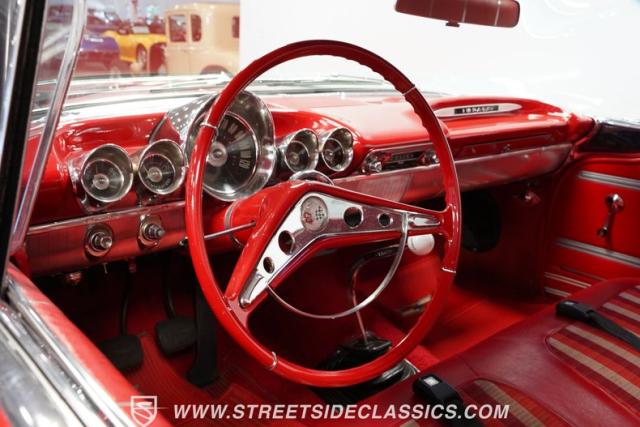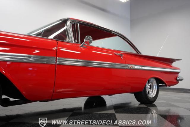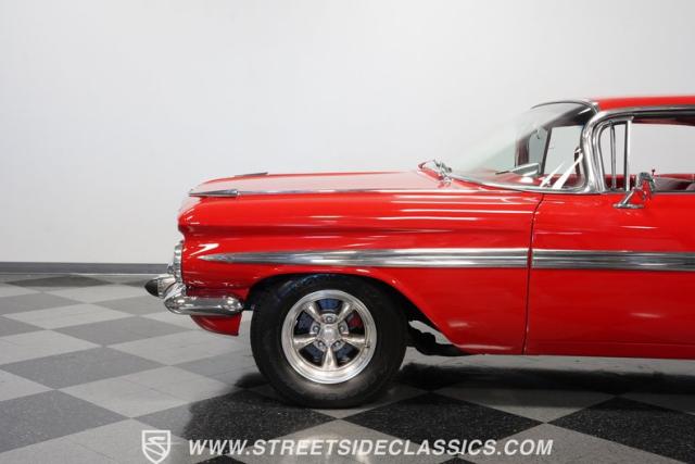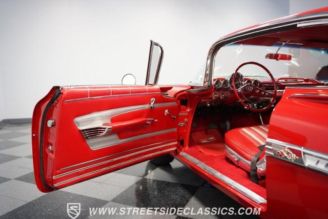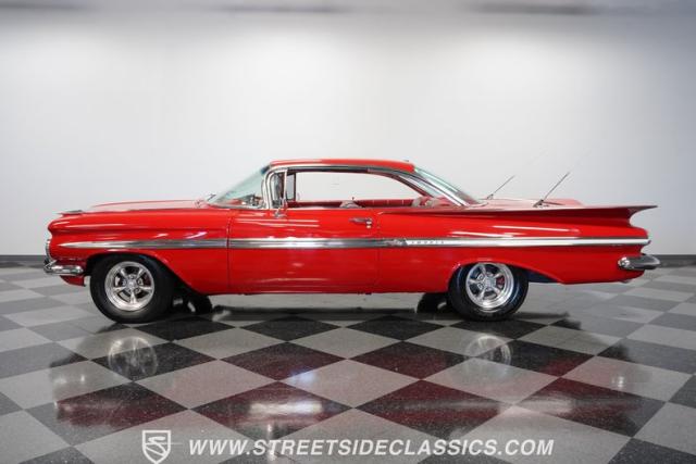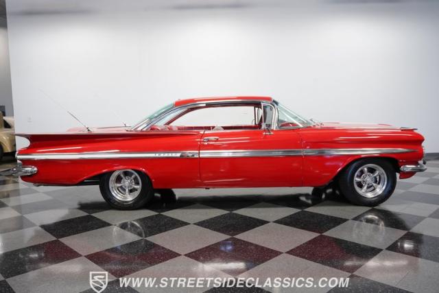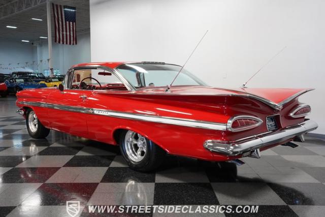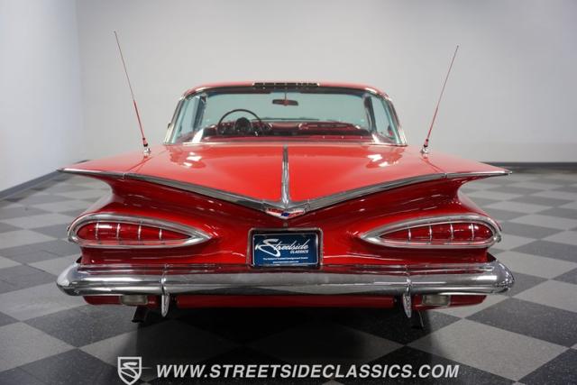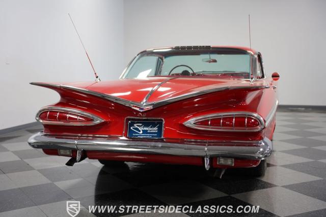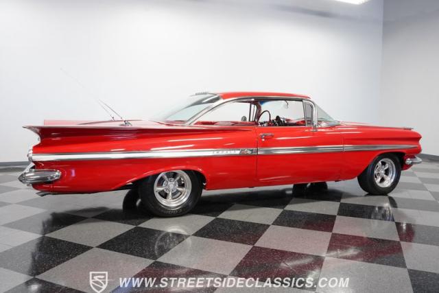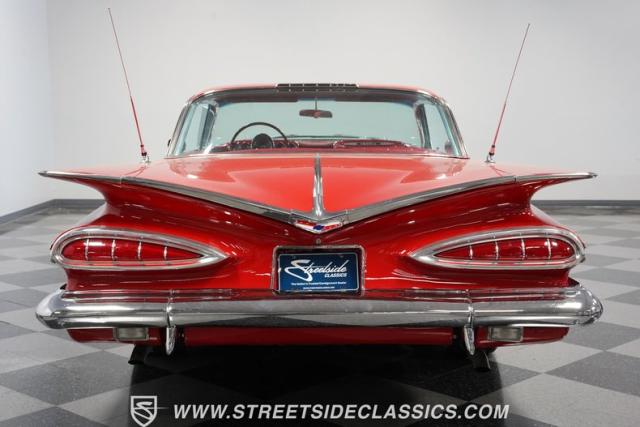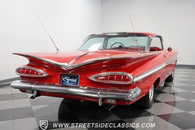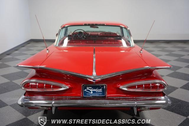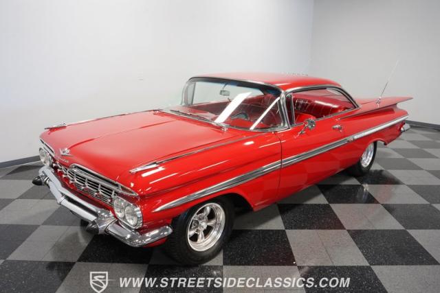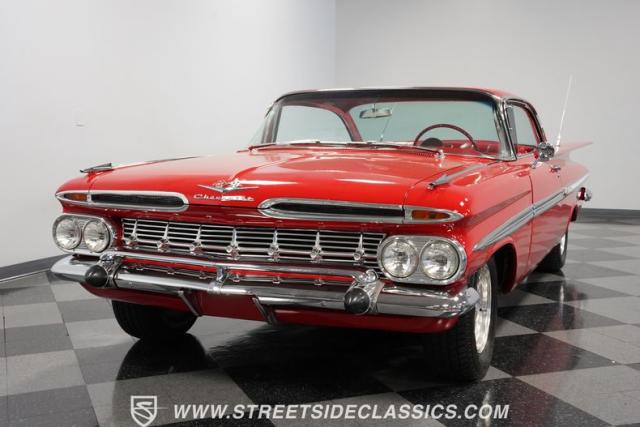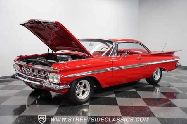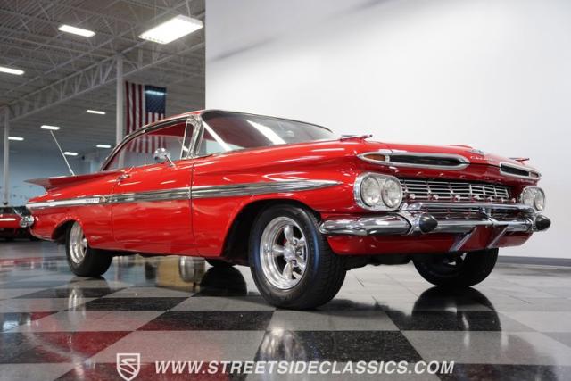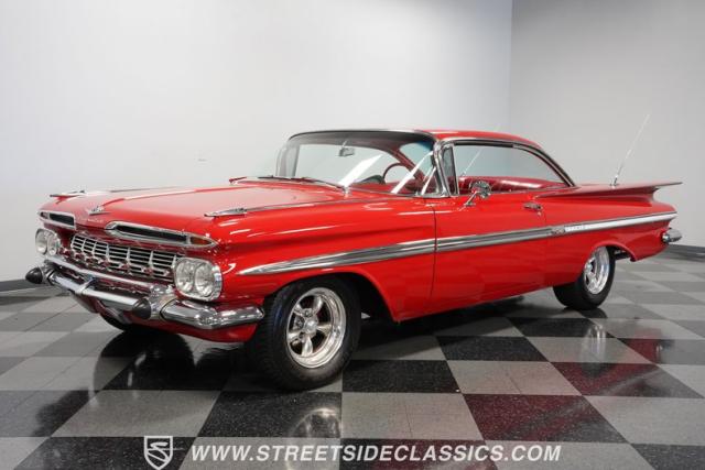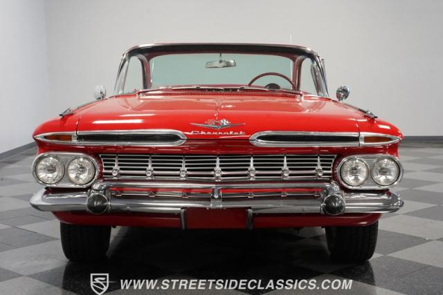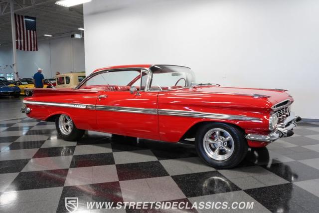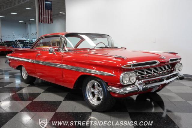 The 1959 Chevrolet Impala is a true icon of American automotive design, showcasing a striking red exterior that perfectly captures the era\'s bold and striking style. The sweeping lines and distinctive tailfins set this model apart, giving it an unmistakable presence on the road. This hardtop features dual antennas, dechromed bumpers, and 15-inch American Racing wheels, wrapped in 225/70R15 tires up front and 235/70R15 tires in the rear, ensuring it rides as good as it looks.