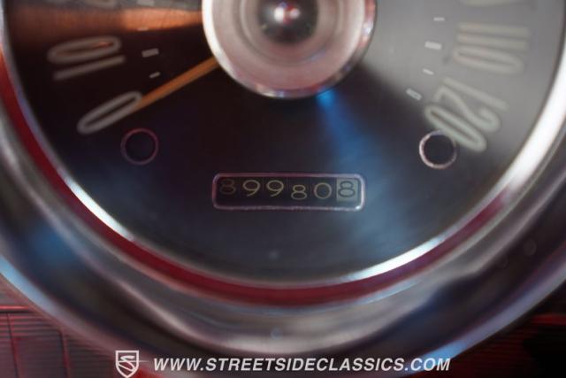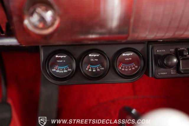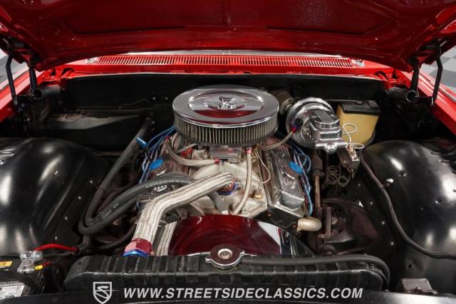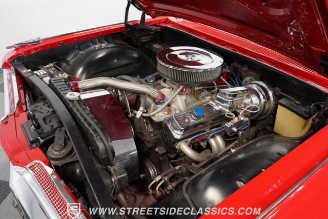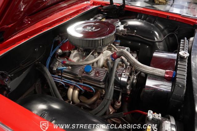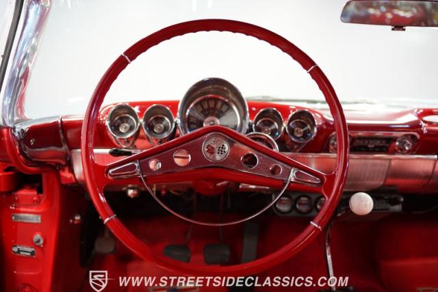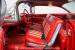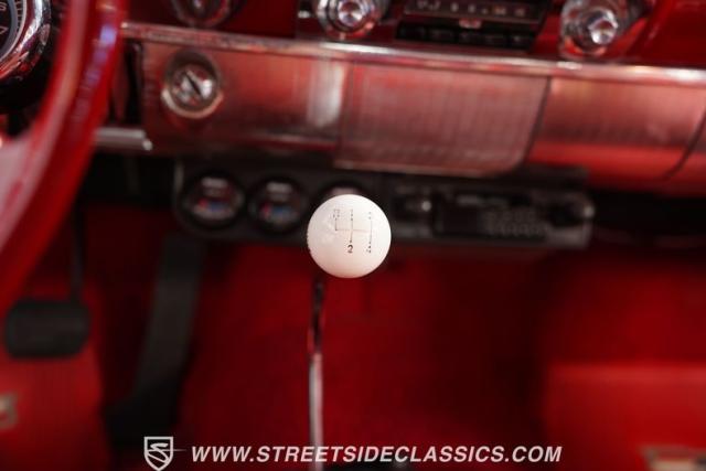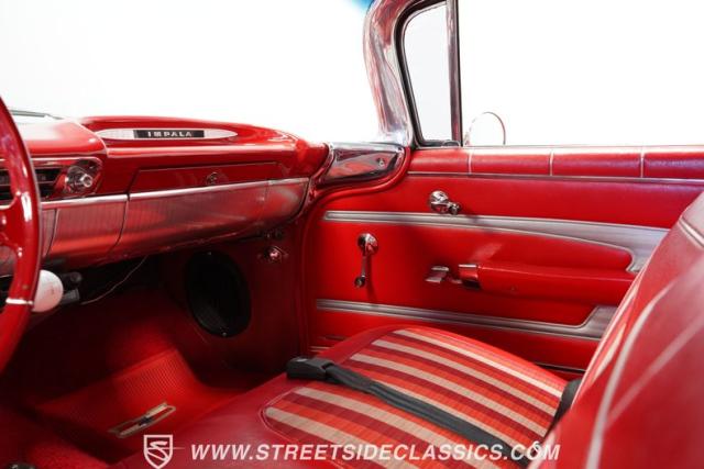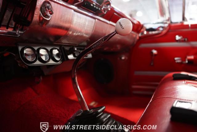 Inside, the Impala\'s red interior complements the exterior\'s vibrant hue. It features a comfortable bench seat with a vinyl and cloth combination that adds a touch of elegance. The iconic \'59 Impala dash stands as a centerpiece, with additional gauges and a bolt-on tachometer providing a classic yet functional aesthetic. A floor-mounted shifter and an AM/FM cassette player enhance the driving experience, while custom floor mats complete the look, making the cabin a blend of style and comfort.
