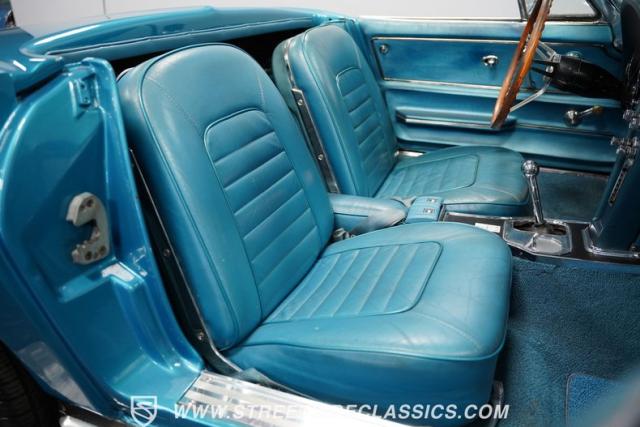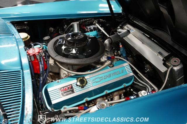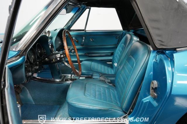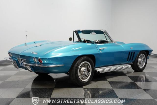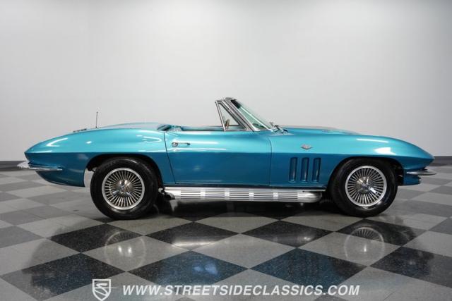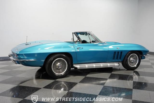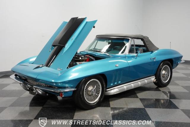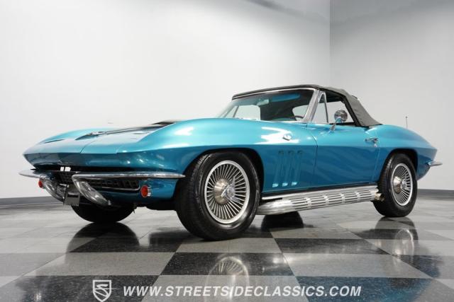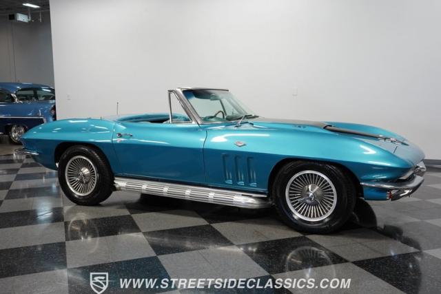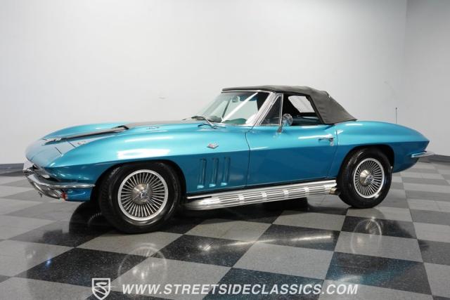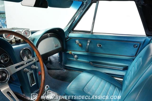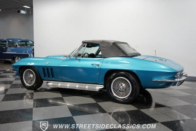 This 1966 Chevrolet Corvette 427 Stingray Convertible showcases American muscle at its finest. Sporting Nassau Blue paint, this C2 Corvette radiates power and speed. The aerodynamic body, accentuated by black stripes, creates an aggressive profile that defines the golden age of performance cars. Knock-off-style 15-inch wheels wrapped in 215/70R15 tires provide the perfect stance, while the black vinyl convertible top offers open-air thrills at a moment\'s notice.
