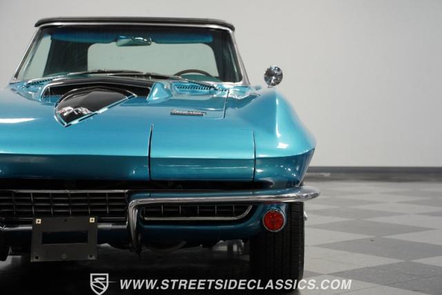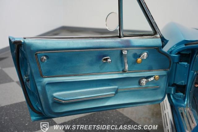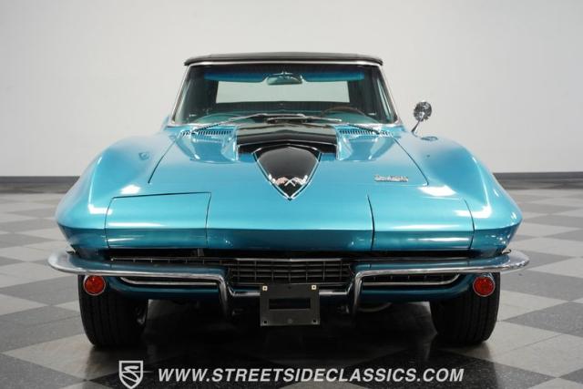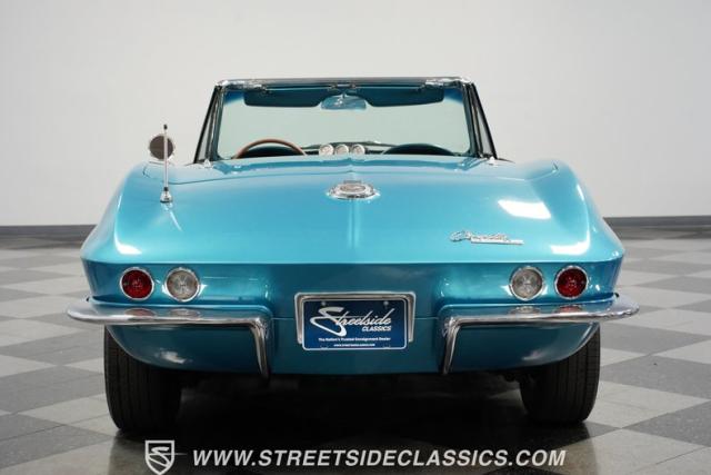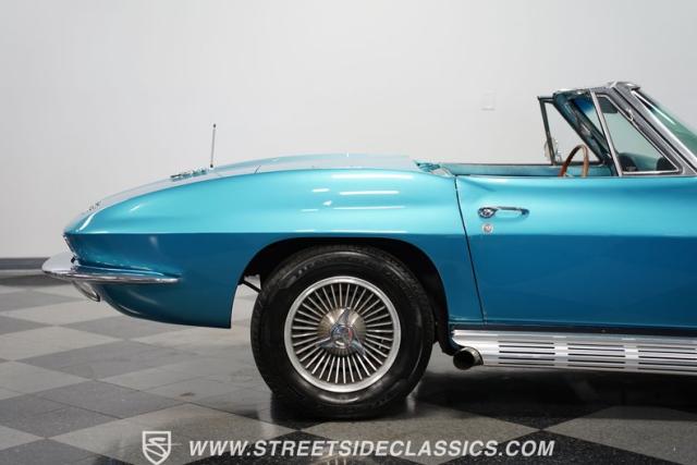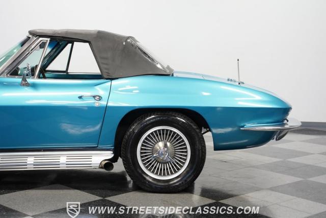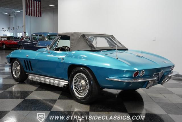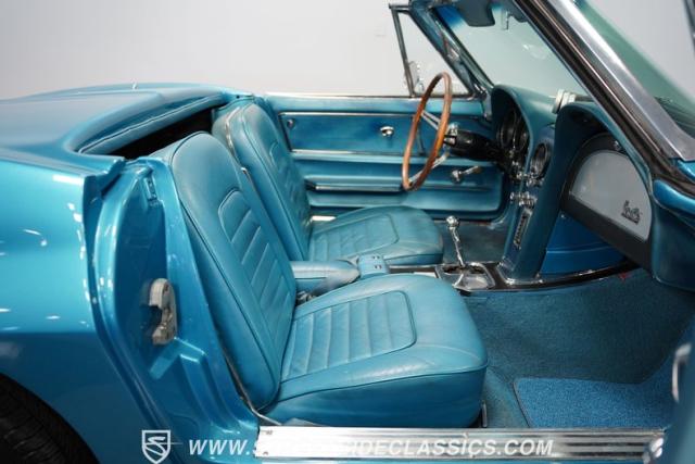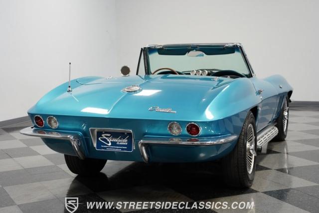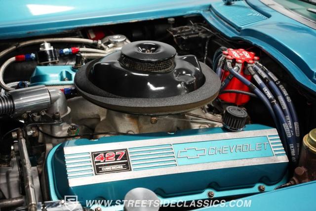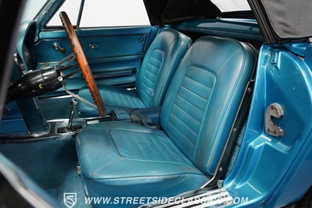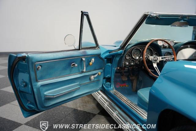 This 1966 Chevrolet Corvette 427 Stingray Convertible showcases American muscle at its finest. Sporting Nassau Blue paint, this C2 Corvette radiates power and speed. The aerodynamic body, accentuated by black stripes, creates an aggressive profile that defines the golden age of performance cars. Knock-off-style 15-inch wheels wrapped in 215/70R15 tires provide the perfect stance, while the black vinyl convertible top offers open-air thrills at a moment\'s notice.