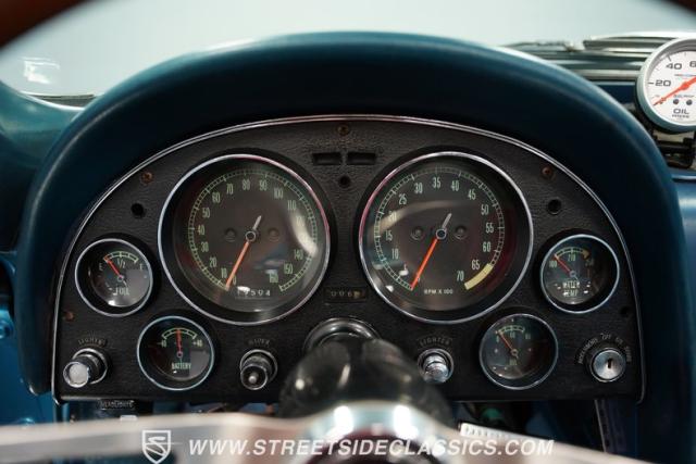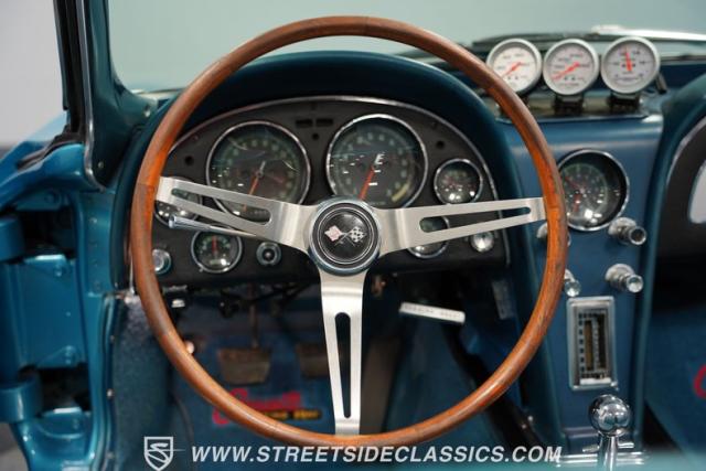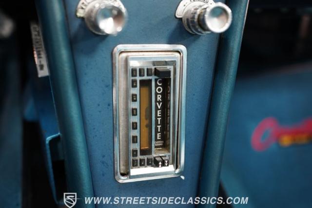 Open the door, and the blue vinyl interior invites you into a cockpit designed for serious driving. Bucket seats hold you firmly in place, ready for high-speed maneuvers. The center console houses the shifter for the Muncie 4-speed manual transmission, putting raw power at your command. Secondary gauges on the dash provide crucial information, enhancing the driver-centric layout. An older aftermarket Corvette stereo adds a subtle modern touch to this classic interior, allowing you to soundtrack your drives through the countryside or city streets.