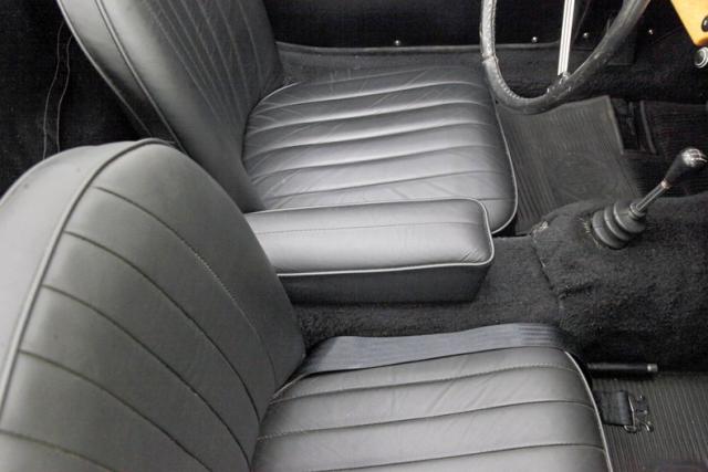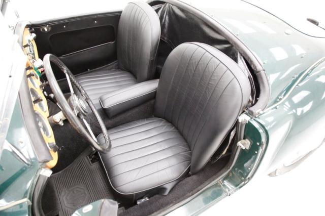 Reaching in and pulling the door release strap we are greeted with a bit of unexpected niceties in the form of black leather tuck and roll low back bomber style bucket seats with a hint of wrinkling to the upholstery and the handbrake tucked neatly between the passenger\'s seat and thickly padded center hump. An oak eyebrow curved dash, also draped in black sports a litany of gauges which pepper a black leather curved panel along with the heater controls, and MG badge over wood in front of the passenger. Our consignor notes that the original metal dash face plate is included with your purchase. This is fronted by a black rimmed banjo style 4 spoke steering wheel. Black leather covers the simple small doors, and each offers up some pouch storage and the chromed retainers for the side curtains. Deep black carpeting with very little wear floods the floors and a rear storage area all looking so inviting and beckoning me to feel its softness.