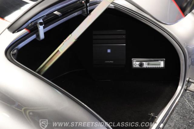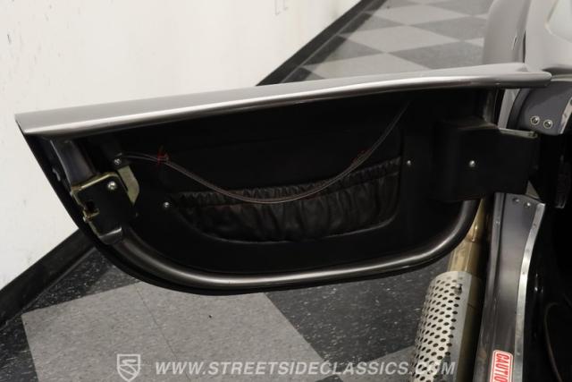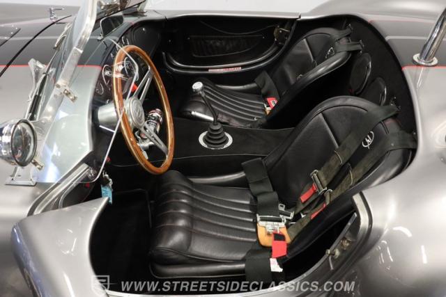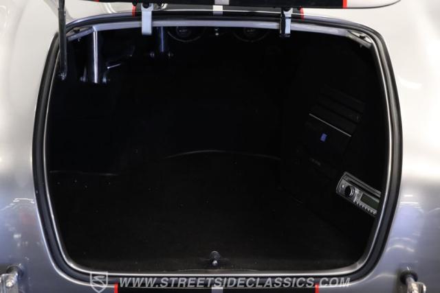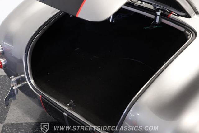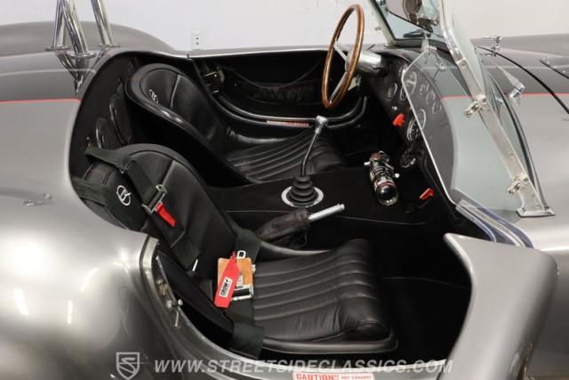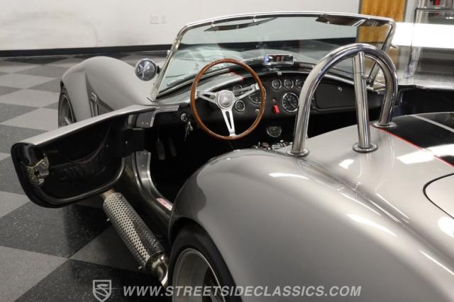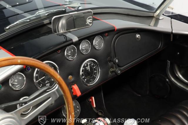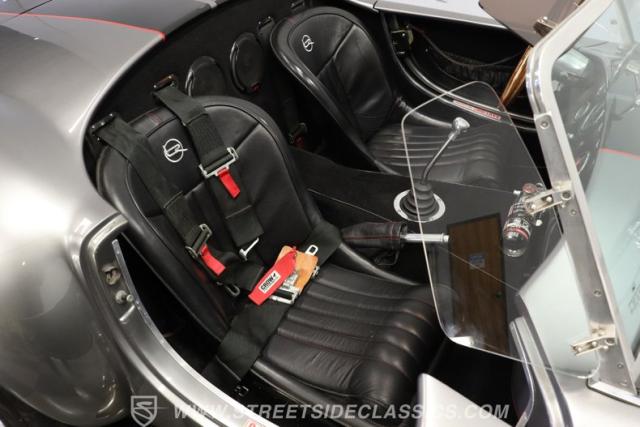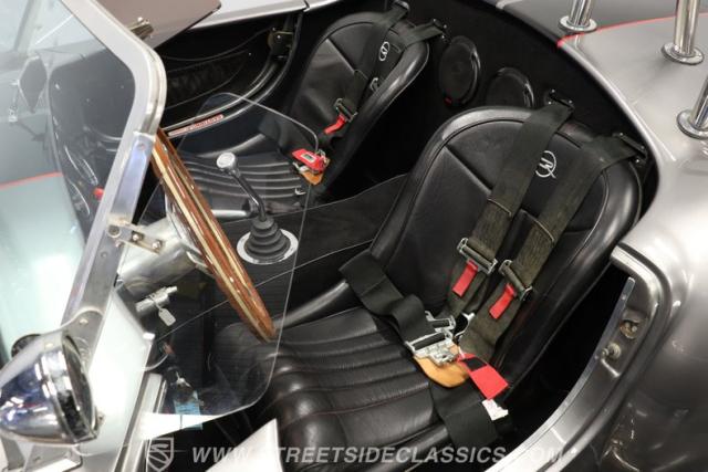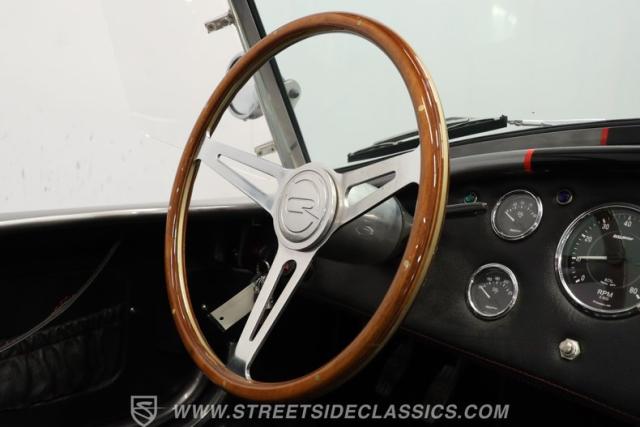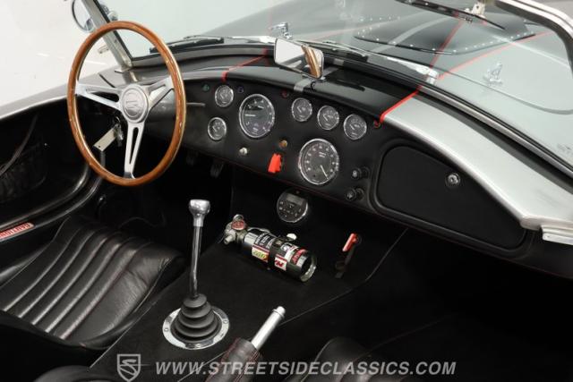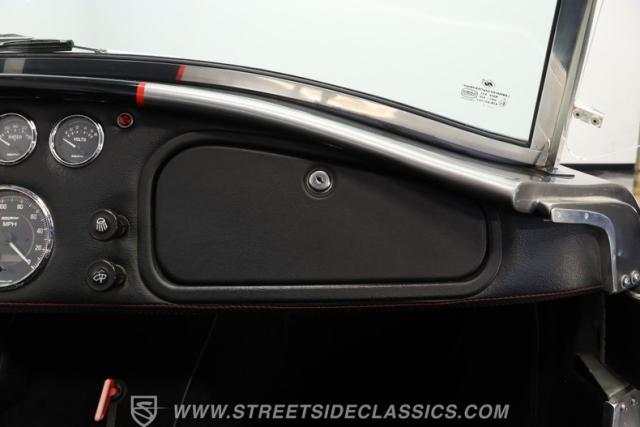 Slip inside, and you\'ll find a cockpit designed for both comfort and performance. The interior features supple leather bucket seats with striking red stitching, extending across the dash and door panels for a cohesive, custom look. The faux wood steering wheel and Autometer gauges evoke classic race heritage, while a Bluetooth receiver and upgraded speaker system add a touch of modern convenience. Every detail, from the feel of the shifter to the placement of the fire extinguisher, is crafted to immerse you in the Cobra experience.