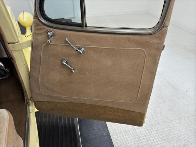 A new LeBaron Bonney interior graces this Packard, beginning with smooth tan broadcloth which mixes with a carpeted lower section on the four door panels, enhanced with decorative piping. This material makes its way to the lofty front bench and the opulent rear seat that provides foot and arm rests for the ultimate lap of luxury. Up front the original dash in all its art deco styling and gray/brown painted metal splendor with embossed bezels framing the original white faced instruments. In the center are several bakelite knobs and buttons along with the ignition switch and ash receptacle, while in front of the passenger is a round clock sitting within the glovebox door. A heater box is noted below the dash and a modern gauge to monitor water temperature has been added. The steering wheel is a functional sculpture with tapered spokes leading to a grooved rim. Topping off this regal interior is thick tan carpet at our feet and a tan headliner that is fully intact. The two storage compartments in the back are clean and covered in black carpet.