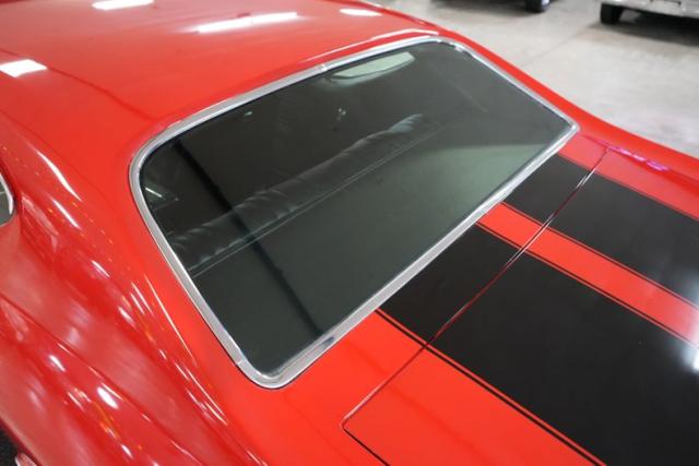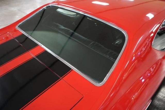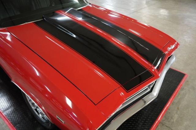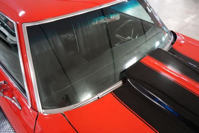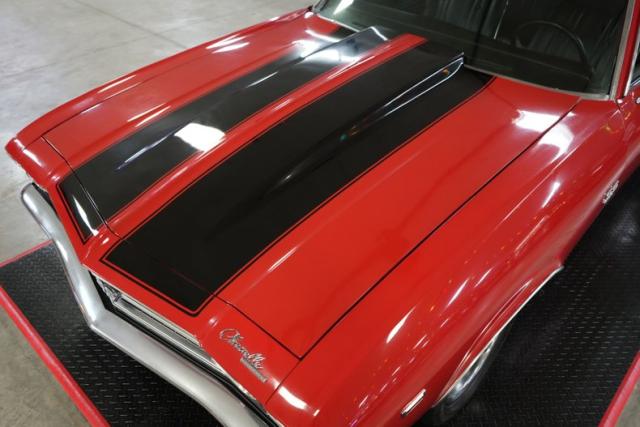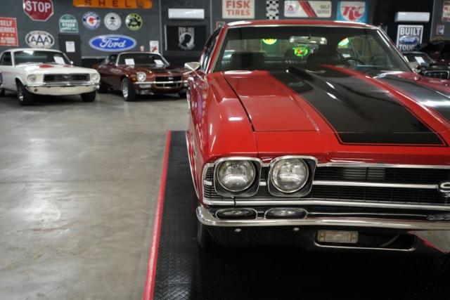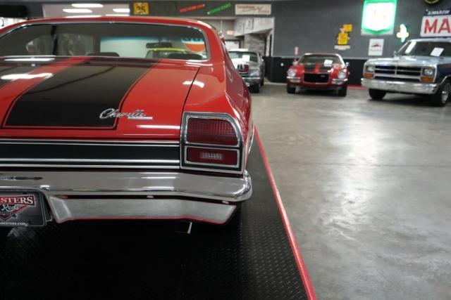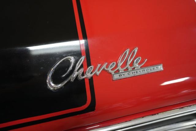 This 1969 Chevrolet Chevelle blends classic muscle with modern upgrades. Under the hood, a powerful 396 Big Block Chevy V8 is paired with a 700-R4 automatic transmission and a 10-bolt POSI rear end featuring 3.73 gears. Stopping power comes from 4-wheel Wilwood disc brakes, while the ride is enhanced with 17\" front and 20\" rear Ridler 695 chrome wheels wrapped in Michelin and Pirelli tires. A black vinyl interior complements the aggressive red exterior with bold black stripes. Additional performance highlights include an Edelbrock intake, Holley 4-barrel carb, MSD HEI Flamethrower distributor, electronic ignition, and dual Derale electric cooling fans.