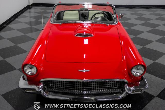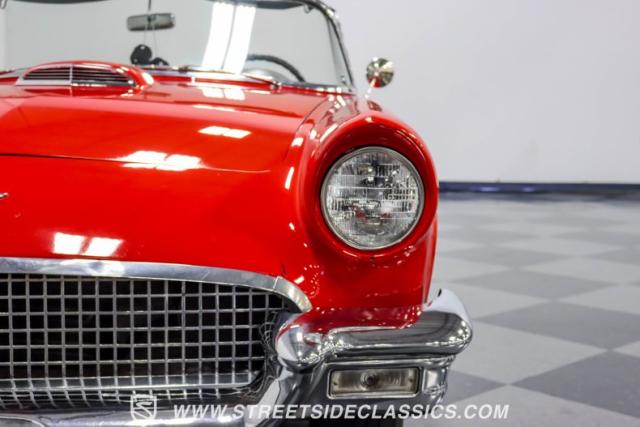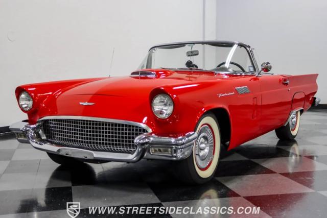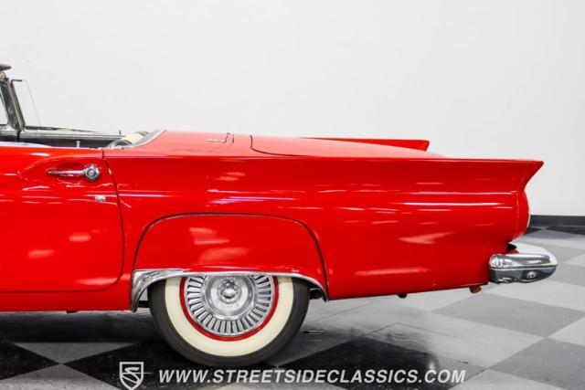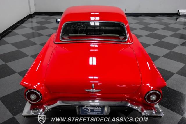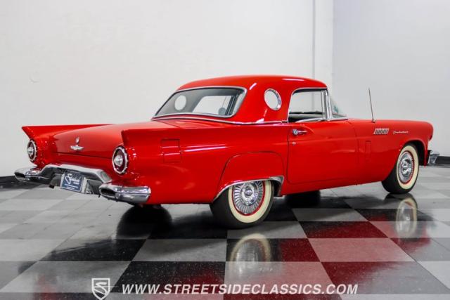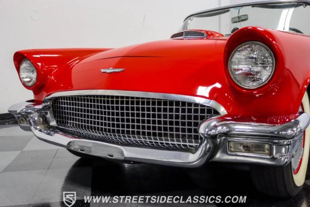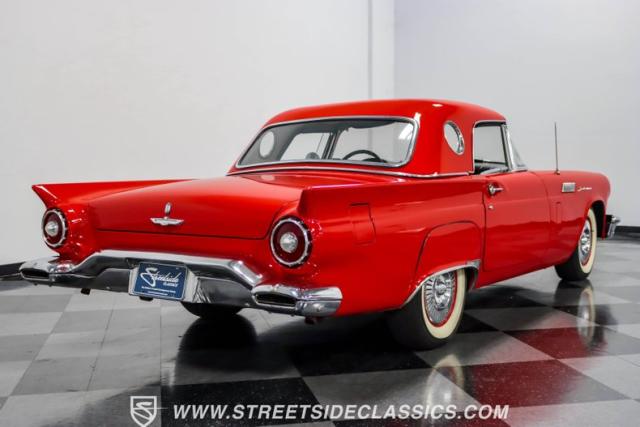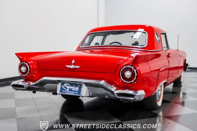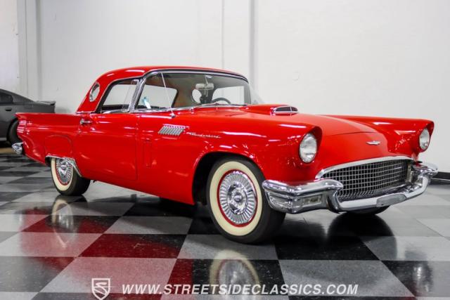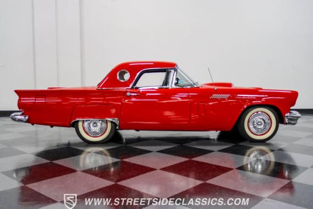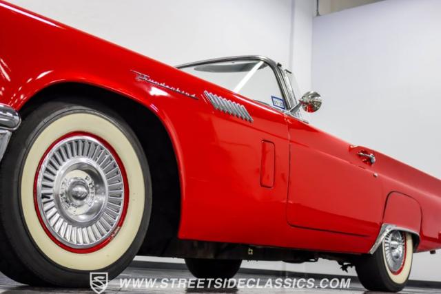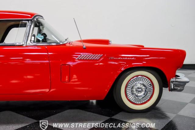 This local Texas-owned \'57 Thunderbird loves to show off in its bold red paint and matching attitude. The removable red fiberglass hardtop adds to the already muscular profile of Ford\'s personal luxury fighter. Chrome bumpers and trim accent every angle, creating a powerful visual punch. The factory hood scoop leads the charge on this T-Bird\'s design, supported by classic 14-inch wheels with whitewall Firestone 205/75R14 tires putting the American muscle to the pavement.