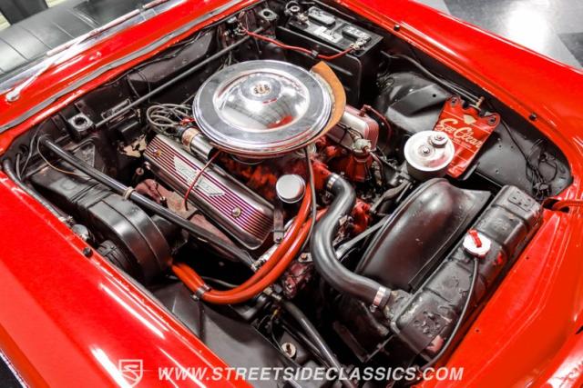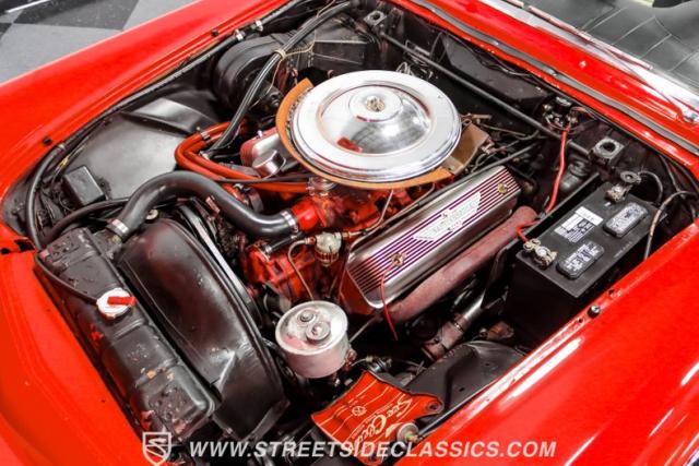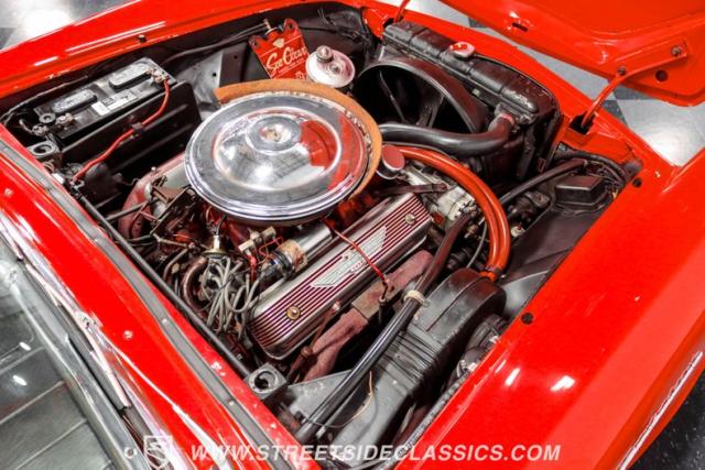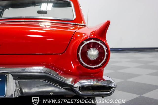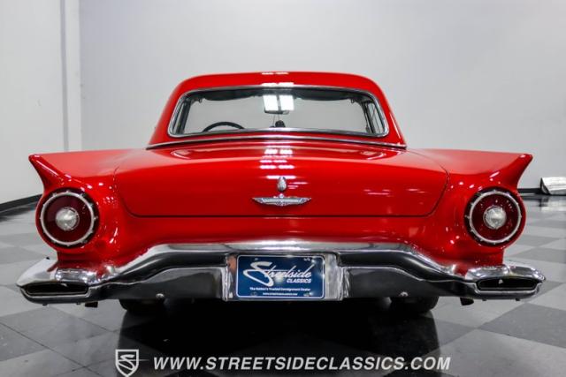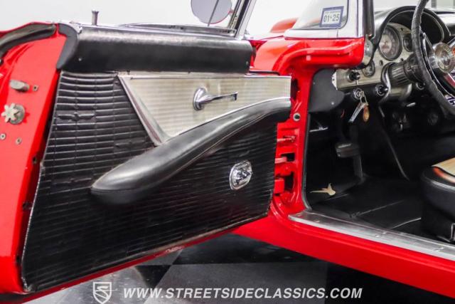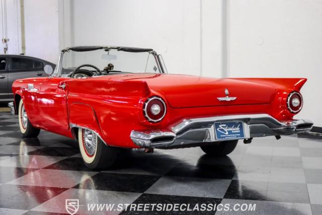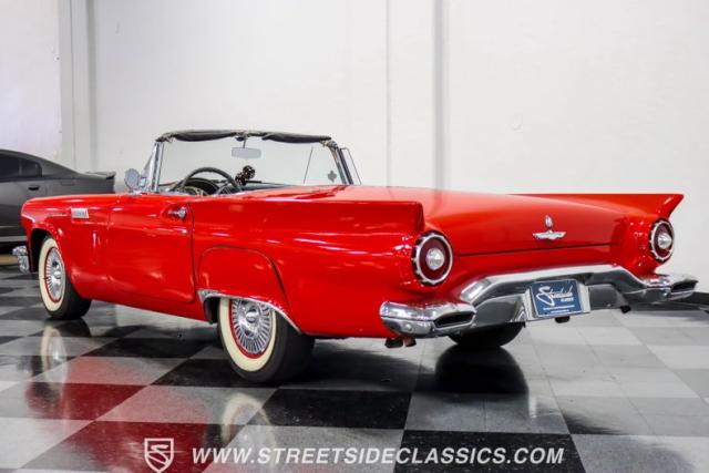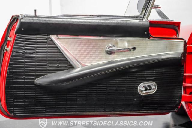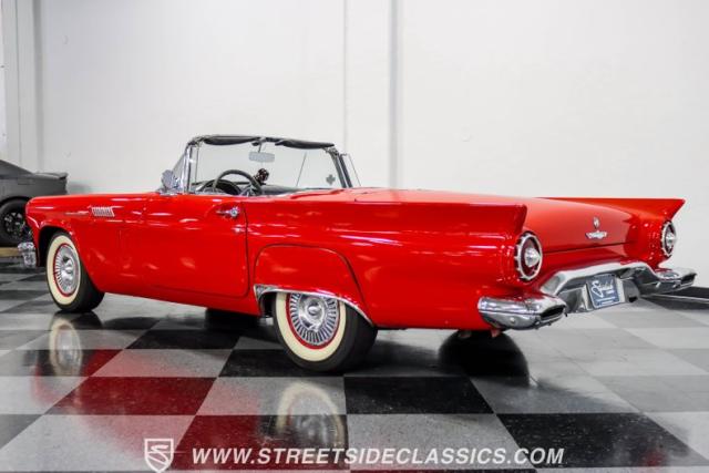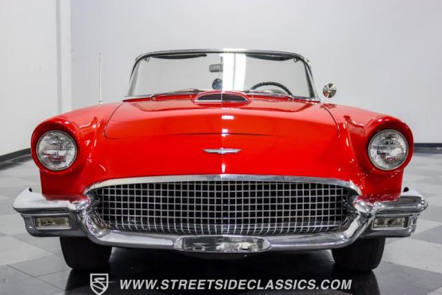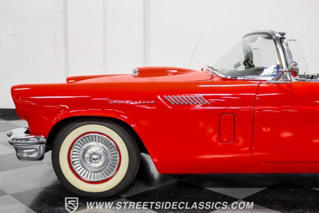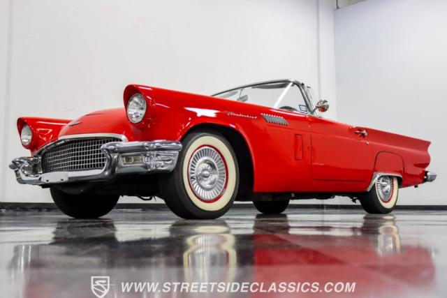 This local Texas-owned \'57 Thunderbird loves to show off in its bold red paint and matching attitude. The removable red fiberglass hardtop adds to the already muscular profile of Ford\'s personal luxury fighter. Chrome bumpers and trim accent every angle, creating a powerful visual punch. The factory hood scoop leads the charge on this T-Bird\'s design, supported by classic 14-inch wheels with whitewall Firestone 205/75R14 tires putting the American muscle to the pavement.