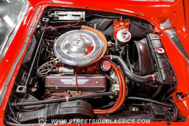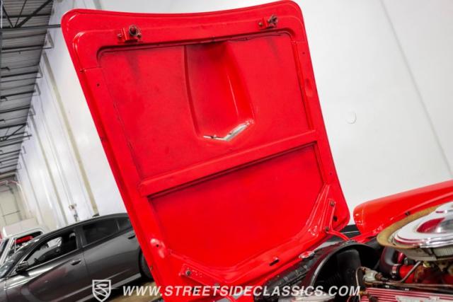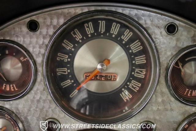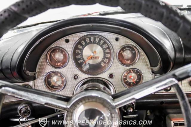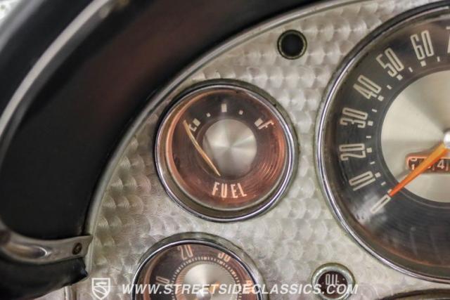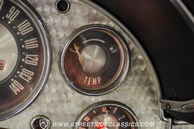 The contrasting black and white vinyl interior delivers pure 1950s American style. A wide bench seat with substantial bolsters anchors the cabin, matched by coordinated door panels and a fresh black carpet below. Factory gauges fill the instrument panel with aluminum trim elements throughout. The floor-mounted shifter puts you in control while power windows and factory air conditioning keep you comfortable during every drive.