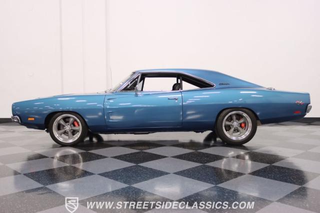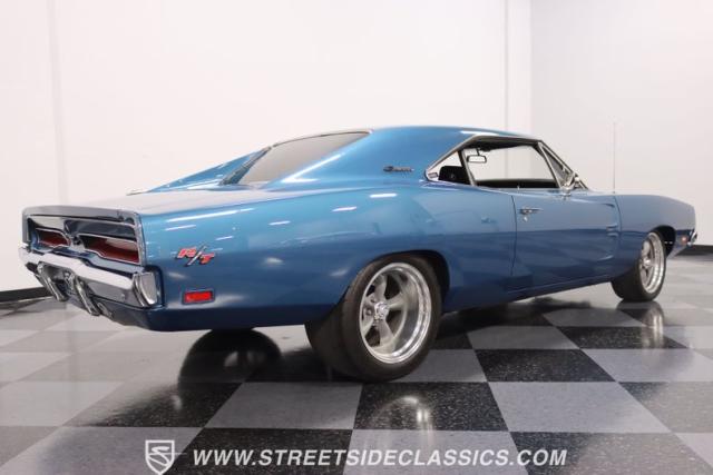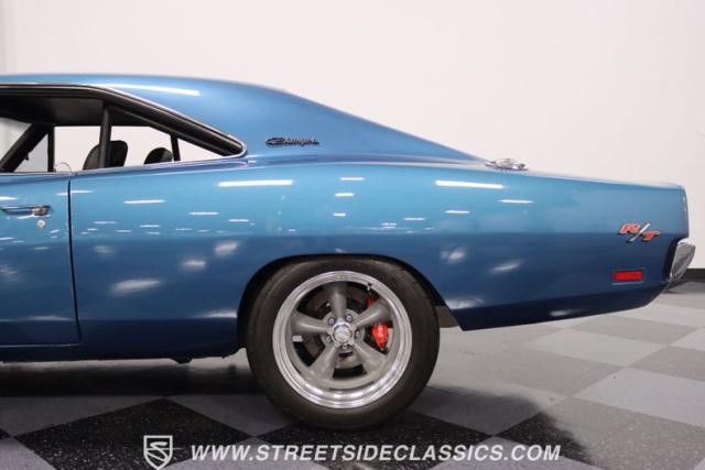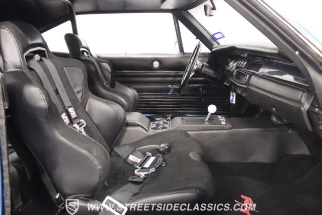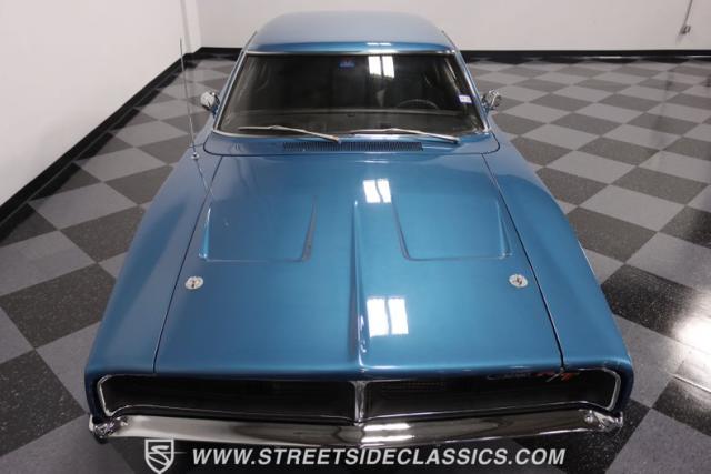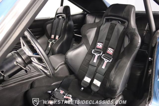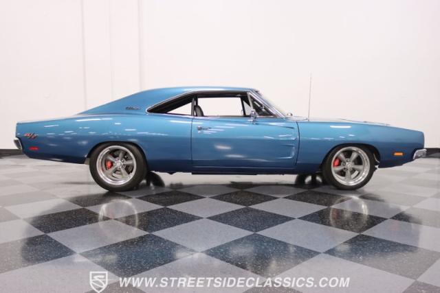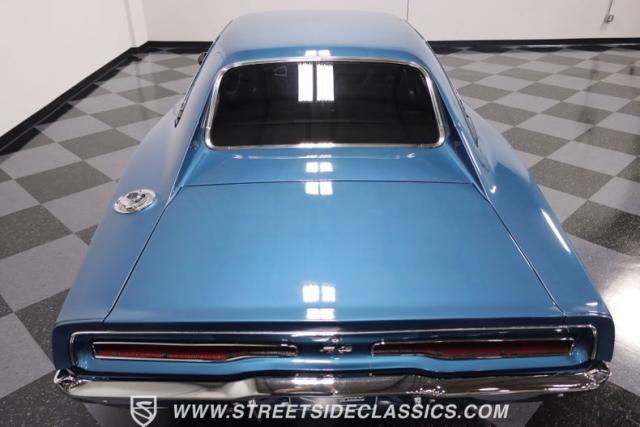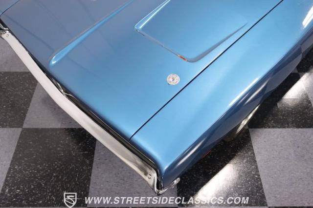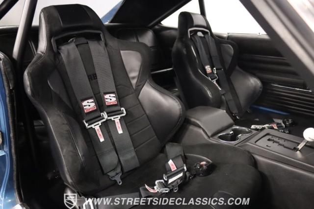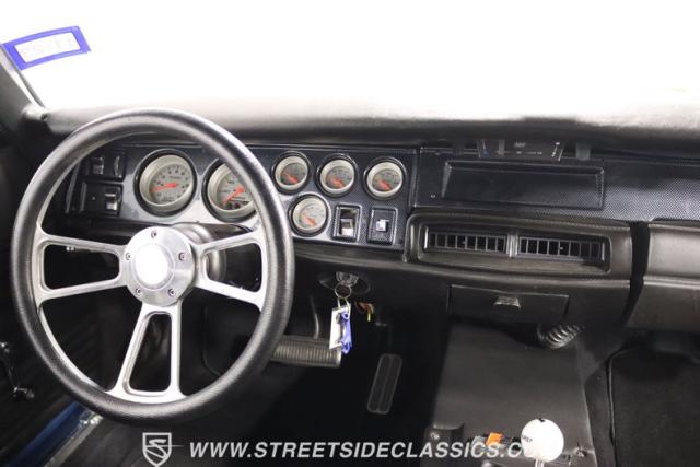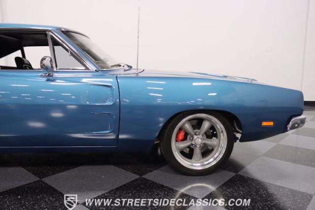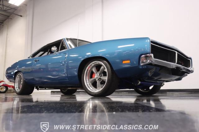 This 1969 Dodge Charger Supercharged Hemi Restomod is a true embodiment of classic muscle car spirit blended with modern performance enhancements. This Charger captivates onlookers with its stunning Light Blue Metallic finish while the interior is a harmonious blend of original muscle car feel and modern comfort. The custom black cloth bucket seats provide a comfortable and stylish driving experience, while the updated gauges seamlessly integrate modern functionality into the classic Charger design. Every element of the interior, from the custom roll bar to the tilt column, has been thoughtfully chosen to enhance the driving experience while preserving the vehicle\'s classic appeal.