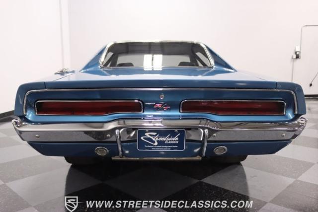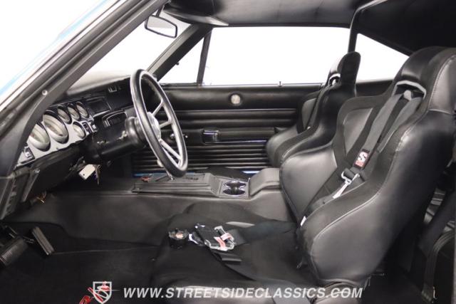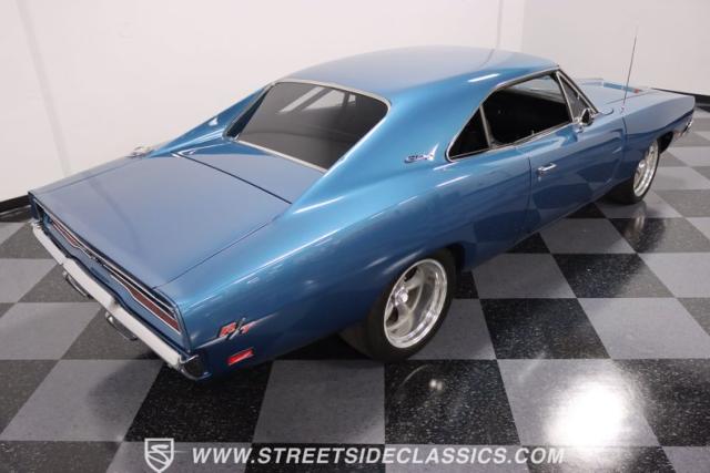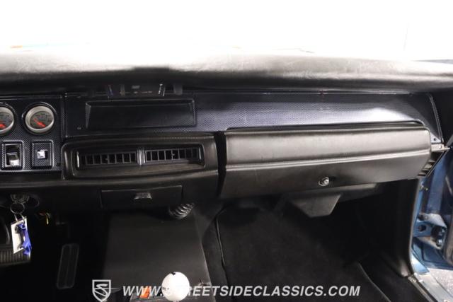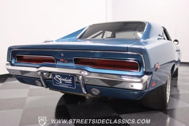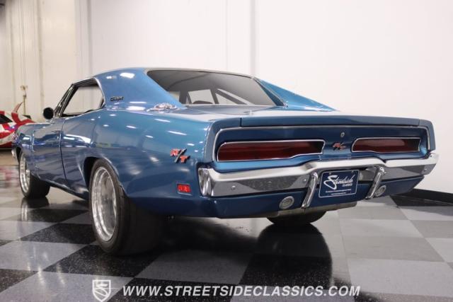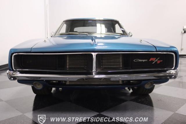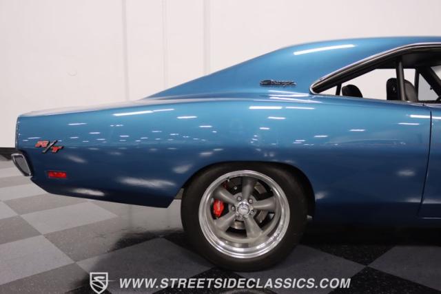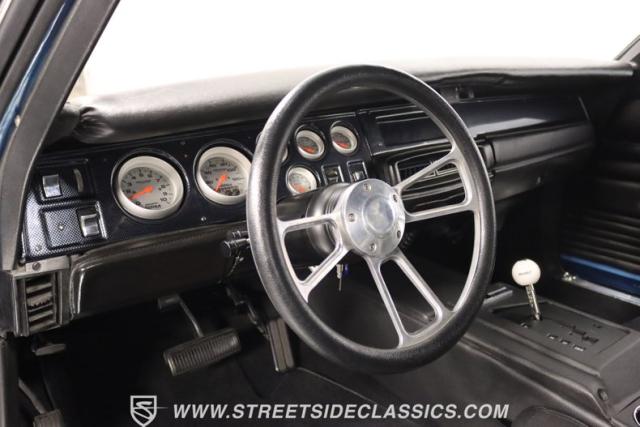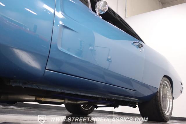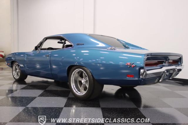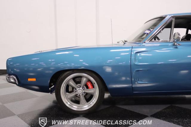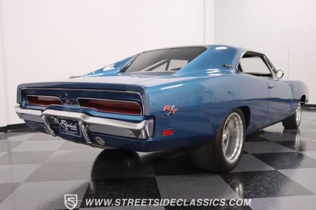This 1969 Dodge Charger Supercharged Hemi Restomod is a true embodiment of classic muscle car spirit blended with modern performance enhancements. This Charger captivates onlookers with its stunning Light Blue Metallic finish while the interior is a harmonious blend of original muscle car feel and modern comfort. The custom black cloth bucket seats provide a comfortable and stylish driving experience, while the updated gauges seamlessly integrate modern functionality into the classic Charger design. Every element of the interior, from the custom roll bar to the tilt column, has been thoughtfully chosen to enhance the driving experience while preserving the vehicle\'s classic appeal.