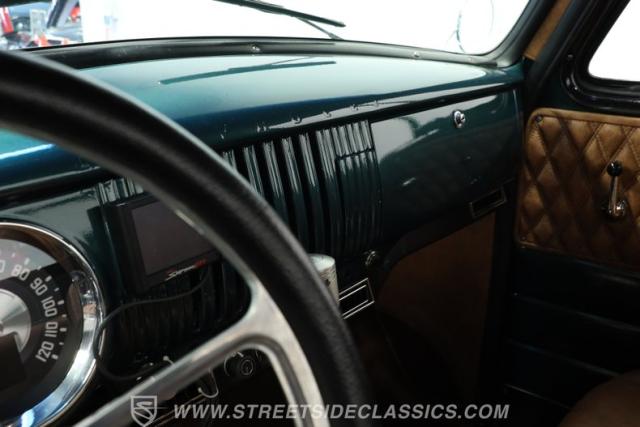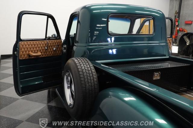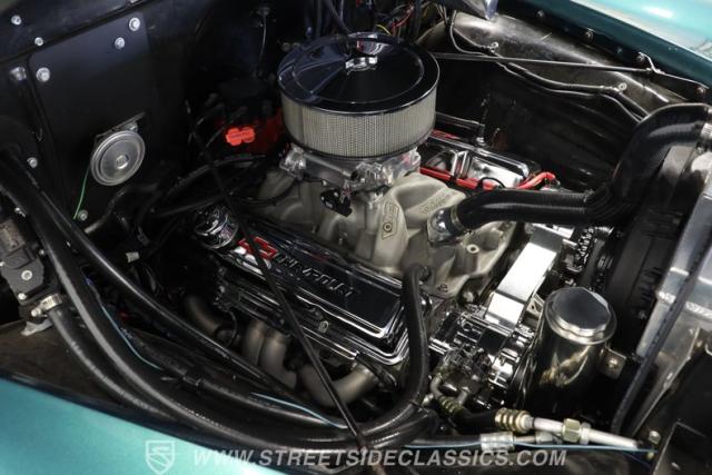 Step inside to discover an interior crafted for both comfort and style. The fresh bucket seats, upholstered in high-quality material, invite you to settle in and enjoy the ride. Matching door panels and a custom center console continue the theme, while the green-painted dashboard gleams in excellent condition. Modern touches like a Dakota Digital instrument cluster, tilt steering wheel, and integrated Holley Sniper EFI display enhance the driving experience, while Vintage Air A/C keeps the cabin cool and inviting.