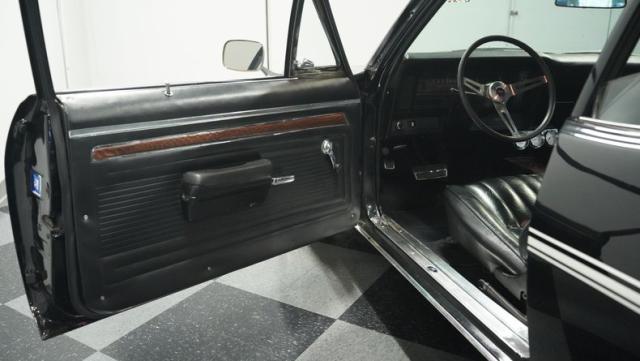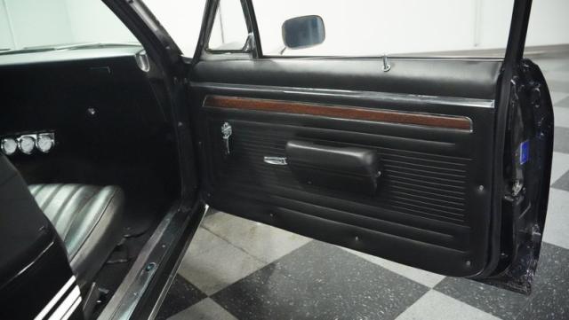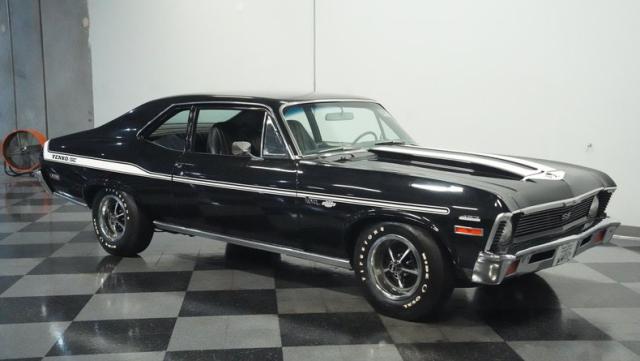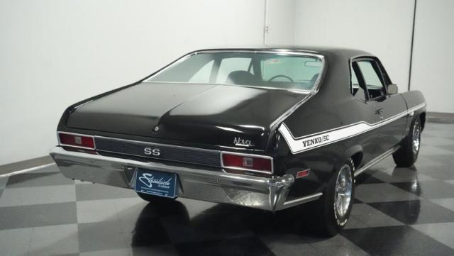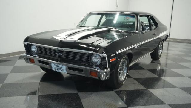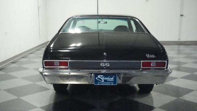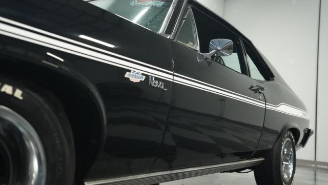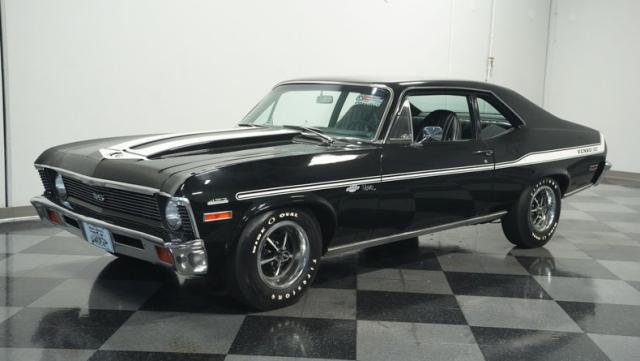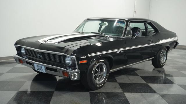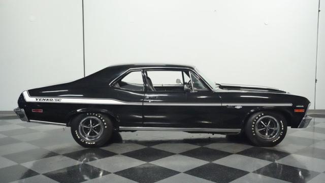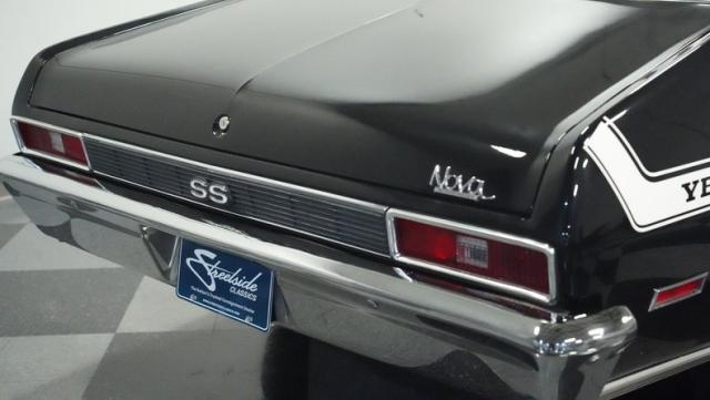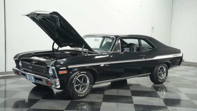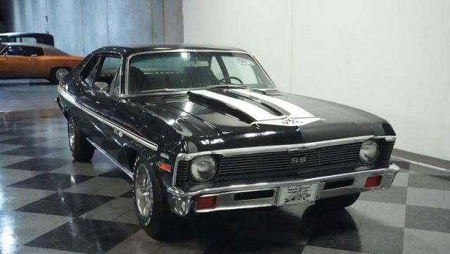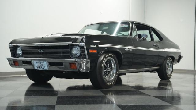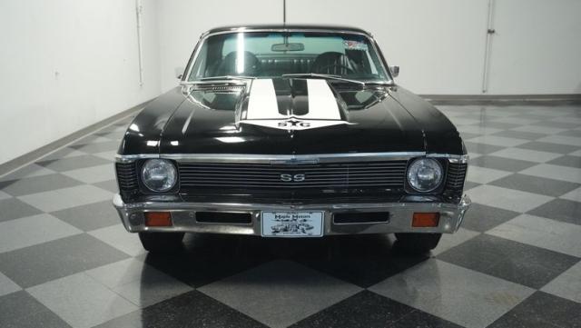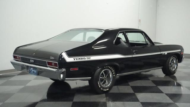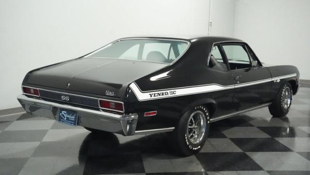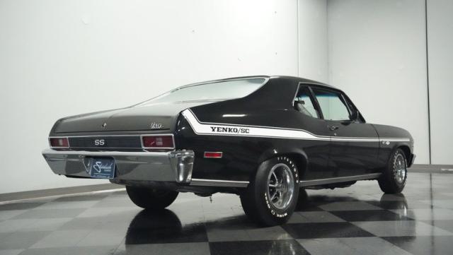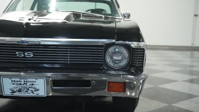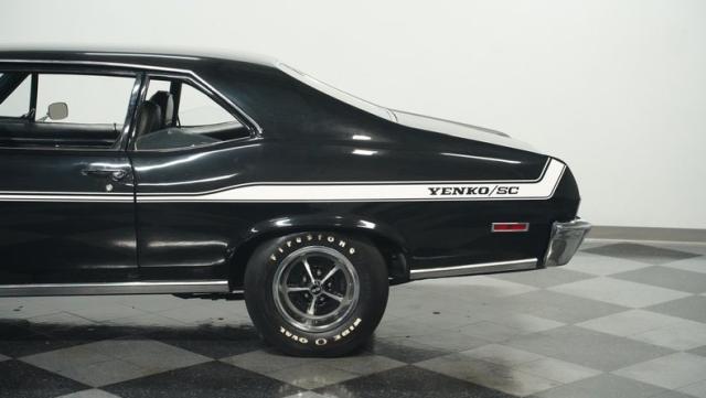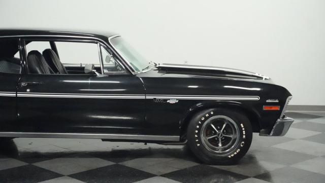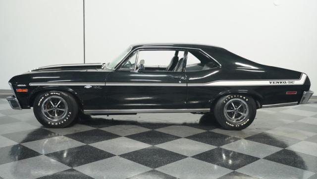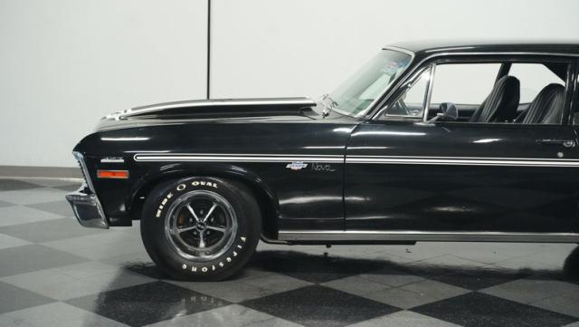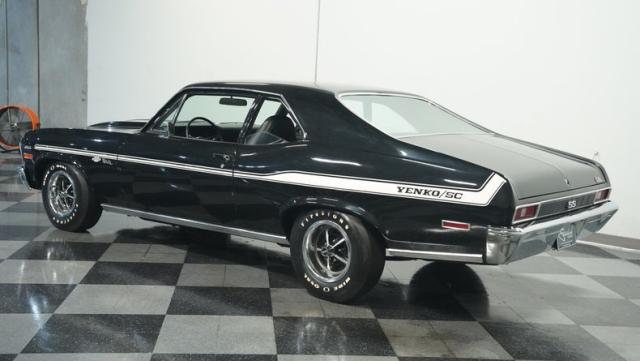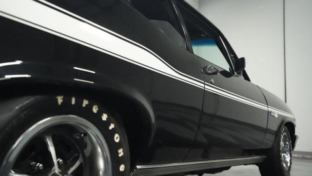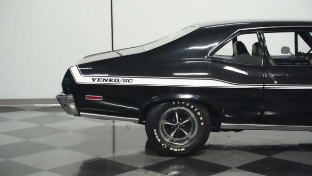 Built to honor Yenko\'s legendary performance legacy, this 1972 Chevrolet Nova SS tribute flexes muscular black paint accented by bold white stripes. The cowl hood gives this Nova an extra dose of attitude, while classic SS badges add street-legal racing flair. The polished Chevy Mag 500 14-inch wheels and Firestone F70-14 wide oval tires complete the period-correct competition look.