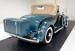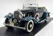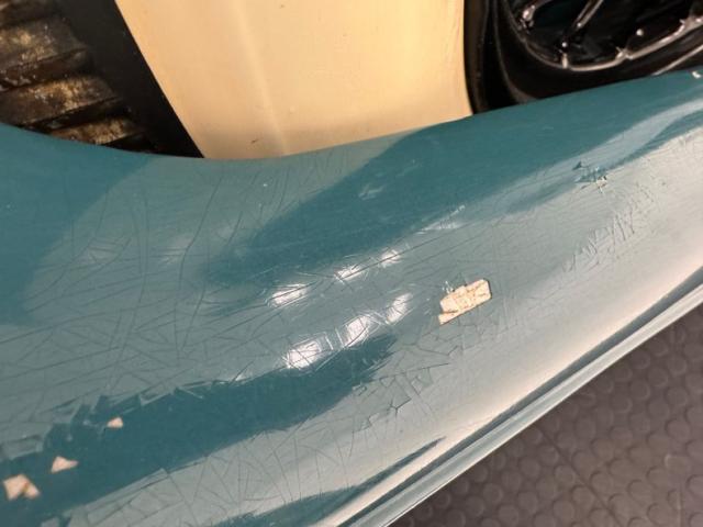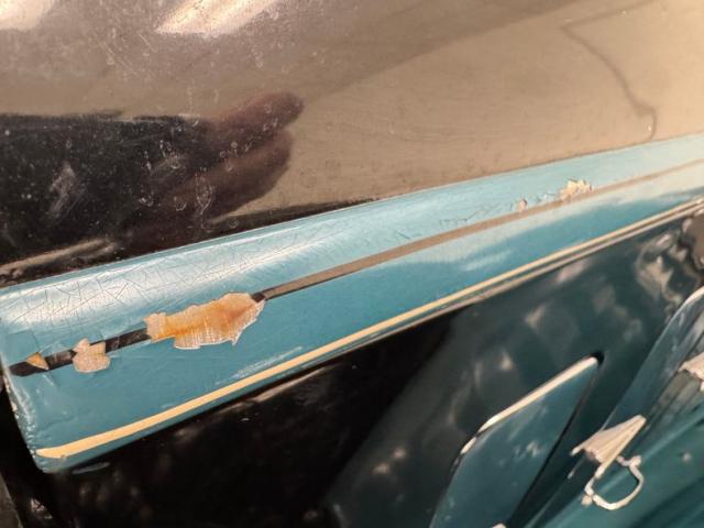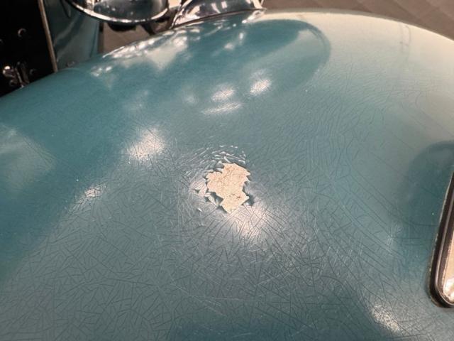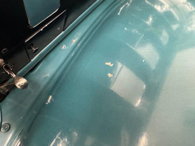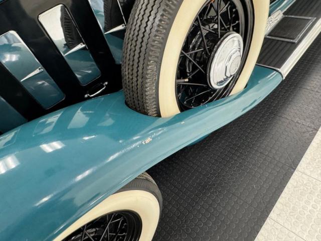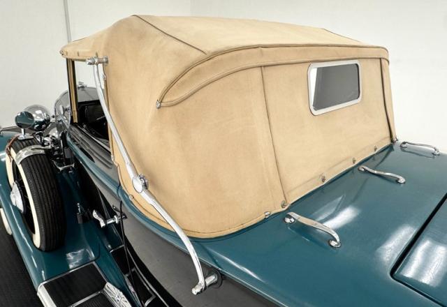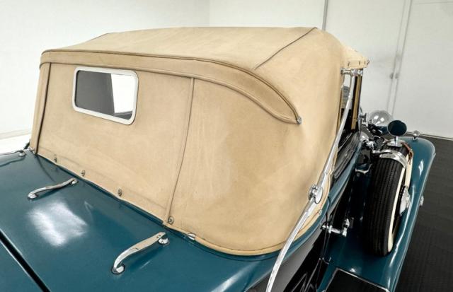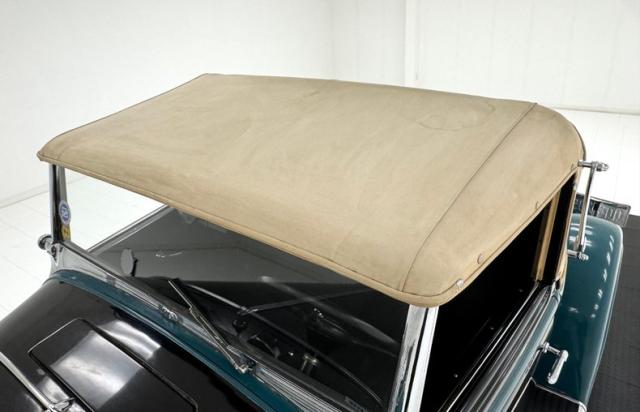After researching colors and paints, our consignor decided on Pinehurst Green which intersects black panels in a sporty design that results in a handsome profile. Up front, there\'s a lot for the senses to take in; the upright ribs of the radiator, large headlights and fog lights that nearly match the diameter, twin horns, and polished vents on the engine covers. In profile, 18-inch black wire wheels contrast dramatically with the white wall tires and polished center caps and a spare on both sides creates a symmetrical configuration bolstered by wide running boards expertly trimmed in metal and each wearing a textured step. Up top, a beige canvas Haartz soft top is accompanied by a real landau bar, later to appear on cars stylistically, and other than some light staining, the top and its plastic window are in great shape. On the body, crazing is noted throughout on green surfaces, along with chips on both colors, somewhat extensive in places, and cracks and deglazing on a window.
