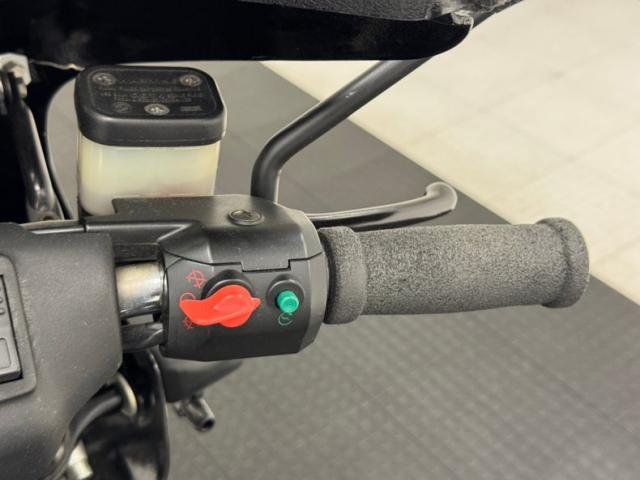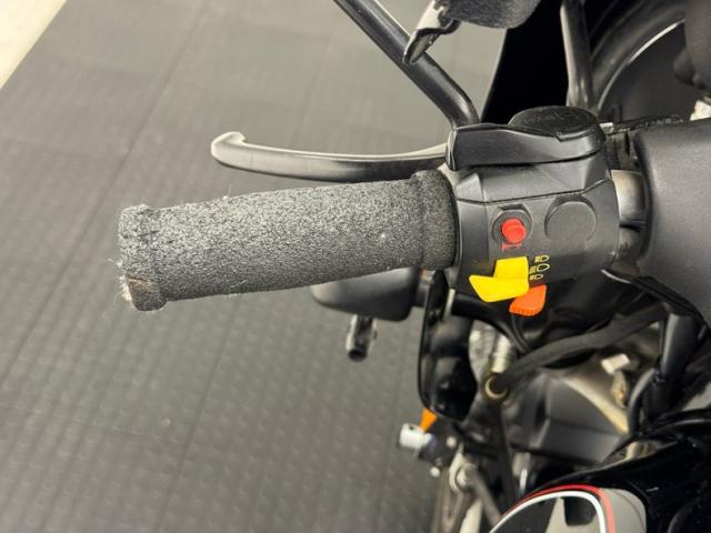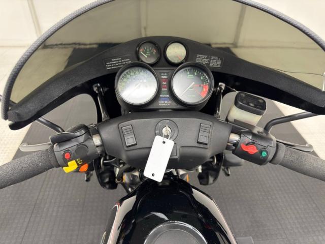 Thumb controls are constructed of varying, brightly colored plastic switches on each handlebar, and foam rubber grips are utilized. Gauges include a speedometer and tachometer flanking indicator lights while a clock and fuel gauge are embedded in the fairing.