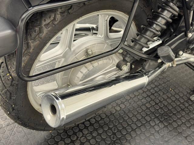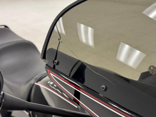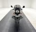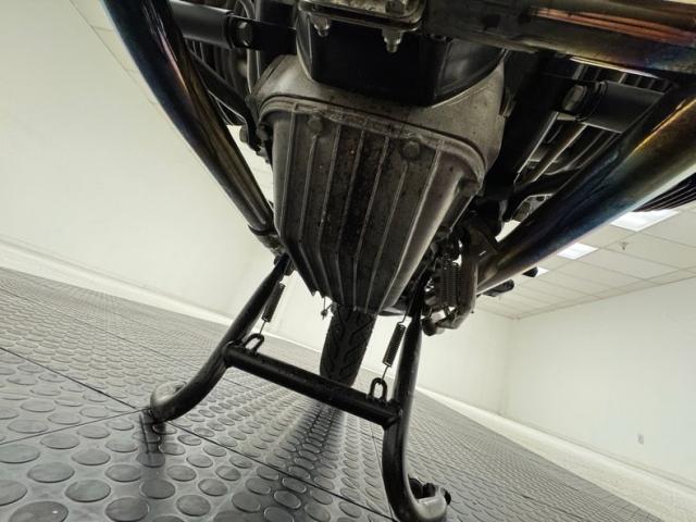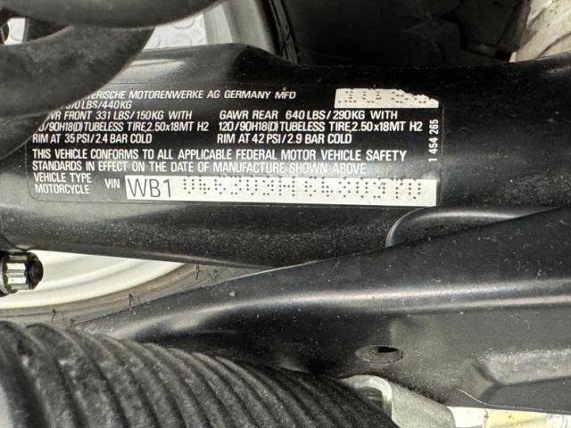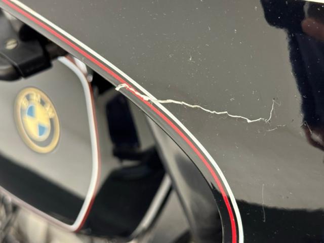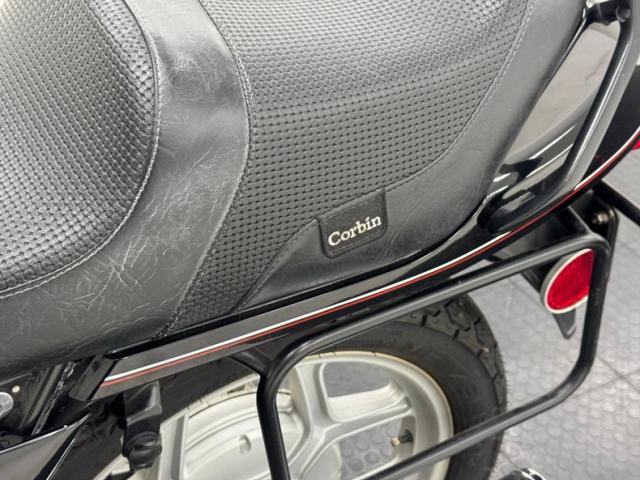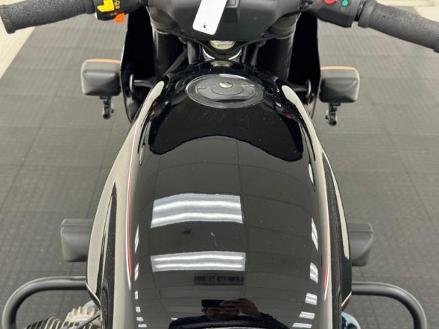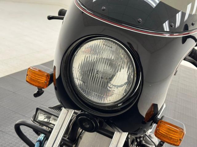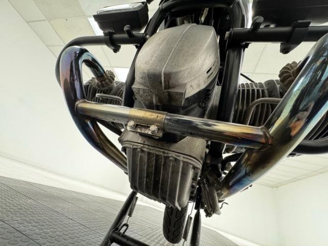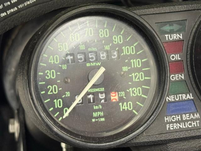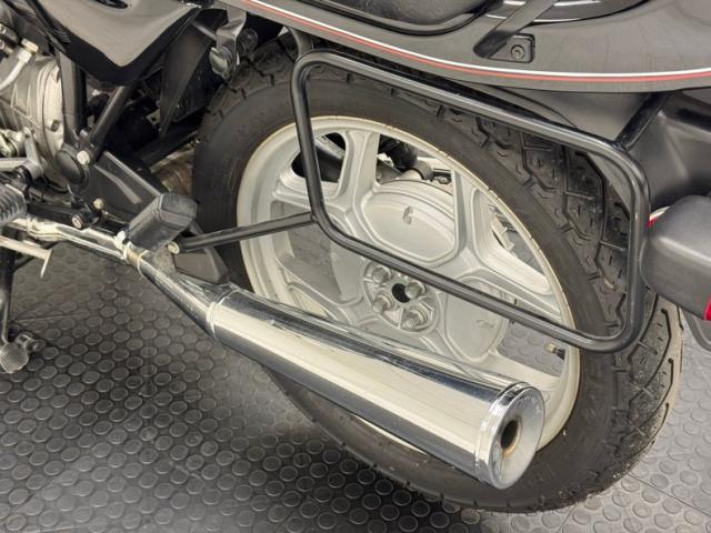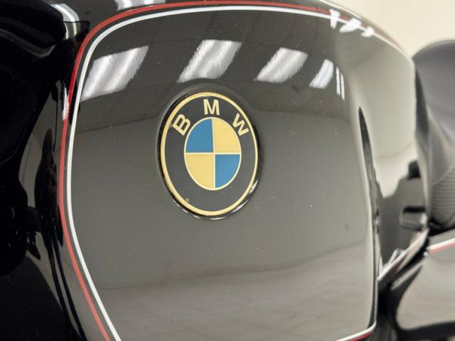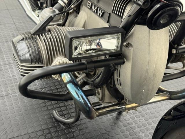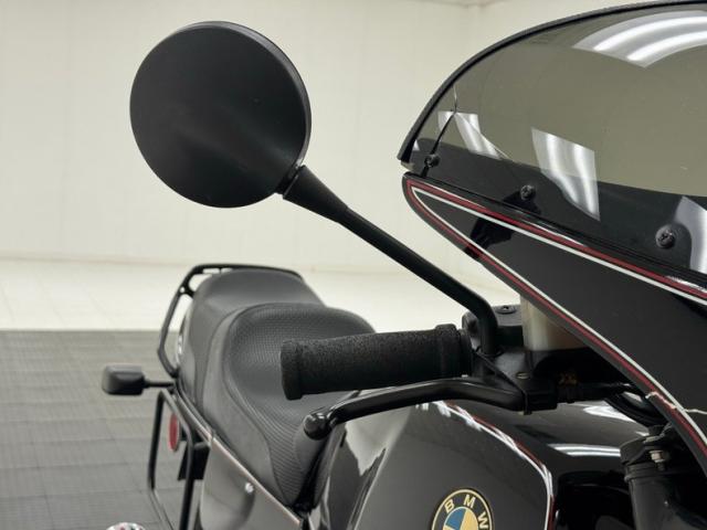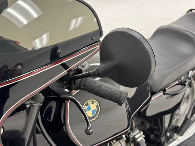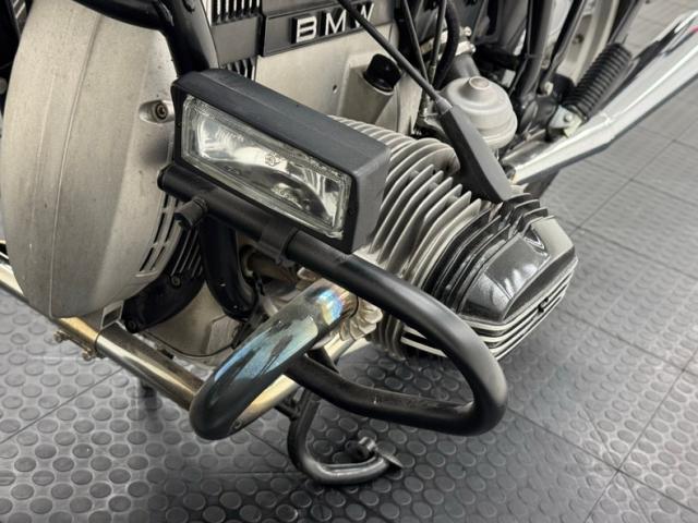 The beautifully designed bike has a narrow and upright profile with a prominent black gas tanks adorned with a double pinstripe of red and white and of course, the coveted BMW emblem. The pinstriping continues on the apron and around to the rear cowl as well as framing the added fairing. A weave textured black leather Corbin saddle includes a dip for a passenger and foot pegs are in place below. Exhaust pipes flank the rear wheel like twin barrels of a rifle while red marker lights are matched with the brake light. The fairing\'s windscreen is tinted plastic that wraps over the handlebars while fog lights perch on the engine guards. Imperfections include a crack in the windscreen and a deep scratch in the fairing, along with some minor wear on the edge of the seat. There is evidence of use on the undercarriage.