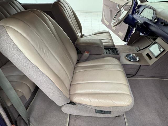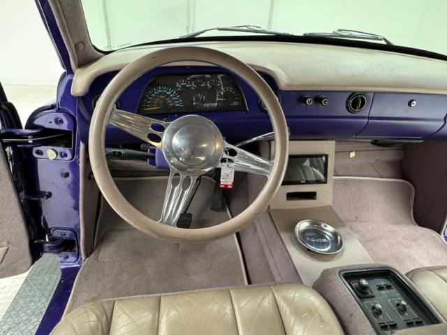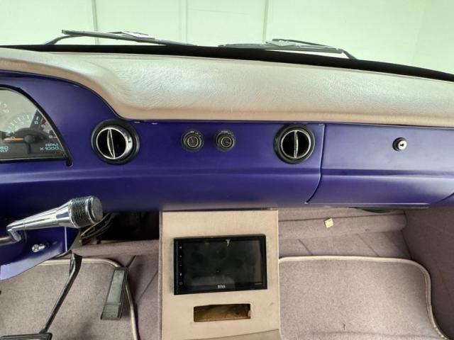 A pop of the doors and I\'m greeted with a nifty combo of tweed and leather. Leather for the sills and tweed for the lowers which house a simple billet actuator and a molded in armrest.All this menagerie is in a cream and mauve color way.Seats take from the door panels and are using cream leather on the wide tuck and roll seats and back inserts and mauve tweed for the bolsters.A custom console runs through the center and is mauve tweed and a leather top. In back is a fancy overstuffed cream leather tuck and roll bench which is just fab! Upfront is a Blurple dash with late model sweep instruments in the drivers side panel. A couple of eyeball AC vents and knobs for AC are also in this panel which stretched across the front. Cream is the coloring for the padded dash top.On the rise to the dash from the console is a Boss AM/FM/Bluetooth touch screen radio.In the center console are also toggles for the windows and seat adjustment joysticks. Fronting the dash for the driver is a billet styled leather covered steering wheel on a tilt column.The paint on the dash front is showing a few cracks.A custom tweed headliner is above all this action.
