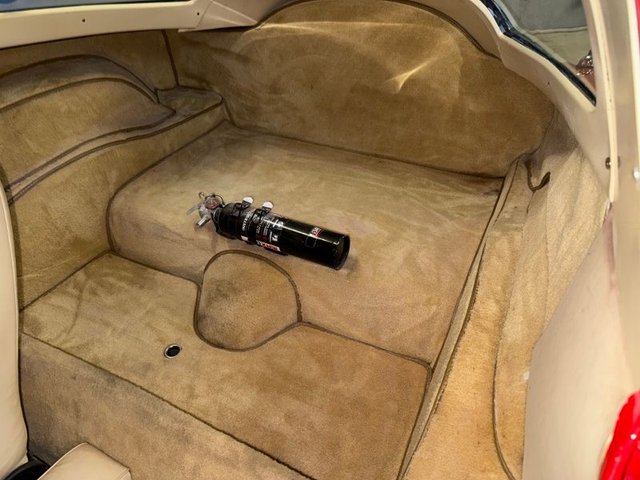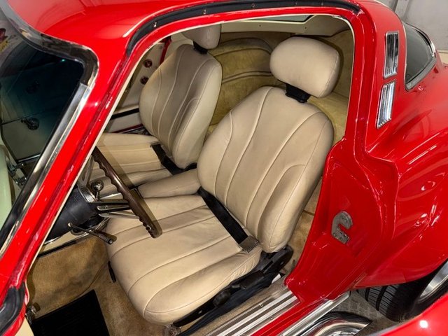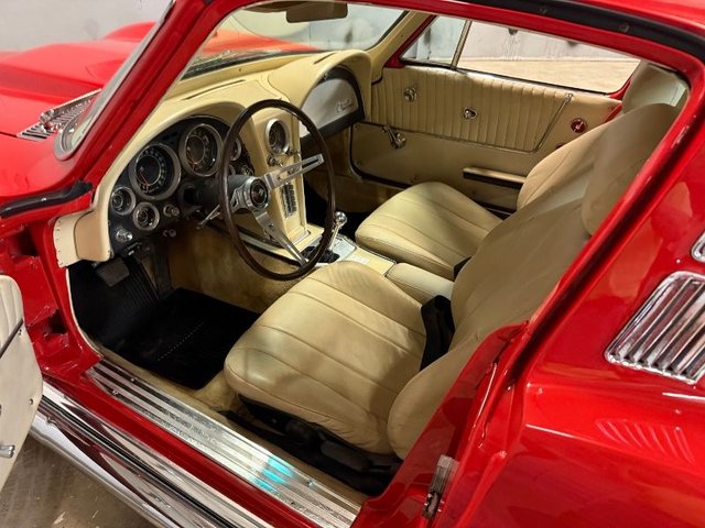 Beautiful cream-colored leather interior and custom. Headrest, door panels, arm rest, new headliner. The door knobs and window cranks are new. New door sill plates. Light Tan colored carpet with polyback, black rubber corvette floormats, new black seatbelts, new cream-colored dash pads. The dash cluster is black with all gauges. Center of console has a clock, AM/FM Delco radio. Teakwood steering like new with Corvette horn button and like new. The park brake cable is new. Complete steering column rebuilt. Heat Bearer kit, Arm Rest pads new. Parking brake assembly is new. Under console tunnel insulation is new. The Sunvisor’s and headlight dash switch is new. New parking brake light switch is new. Competition plush shifter. Beautiful inside.