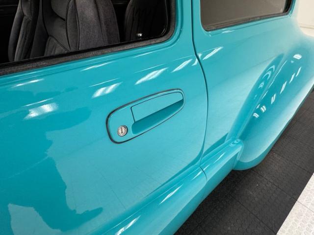 The word \"clean\" comes to mind as trim and molding has been deleted, custom tail lights are frenched into the body, flush door handles take on the body\'s teal paint, and fluted bumpers now hug the body and wrap around to add subtle accenting to the profile. The two stage paint makes Buick\'s desire to create an airplane inspired body evident as the front fenders dip dramatically through the door and meet the articulated fenders in back. Up front, modern smoked headlights loom over a grille that would make a walrus envious, with enormous vertical bars and broad surround. In back, an inset third brake light has been molded in with a body detail that\'s in line with the license plate box. 15-inch Unique Wheels are on board. Imperfections include various paint chips and touched up scratches, cracking paint, and bubbles, (especially in the back).