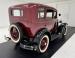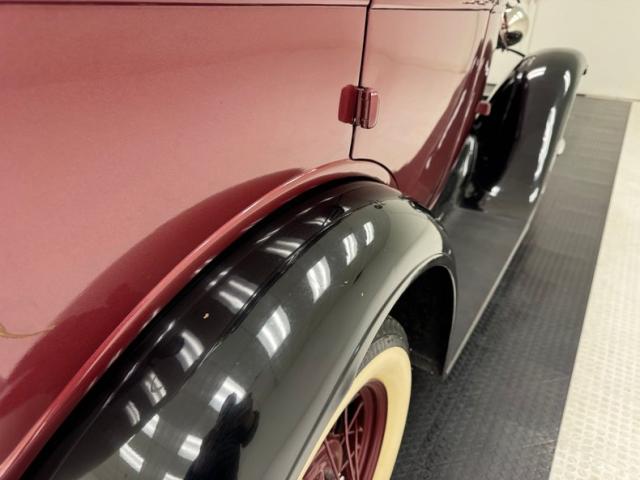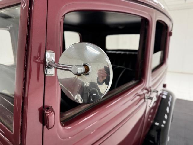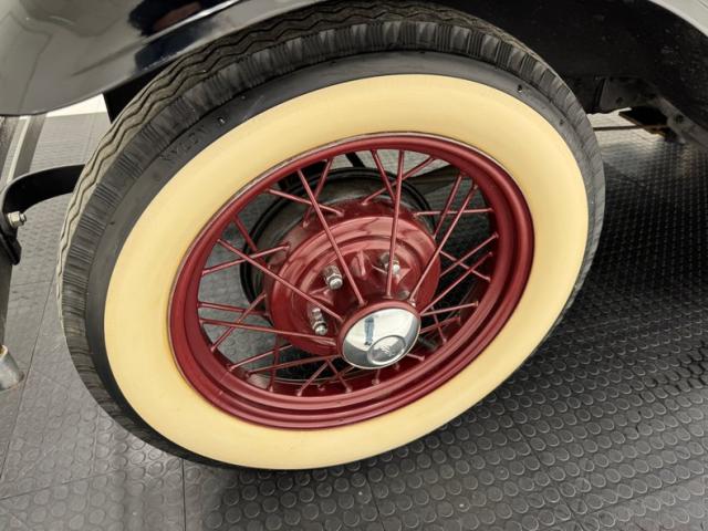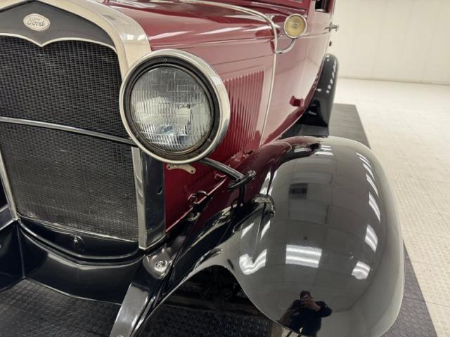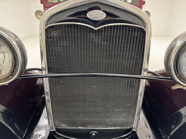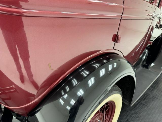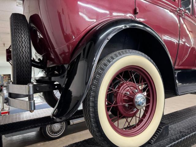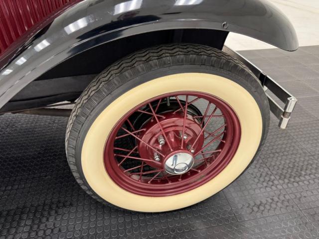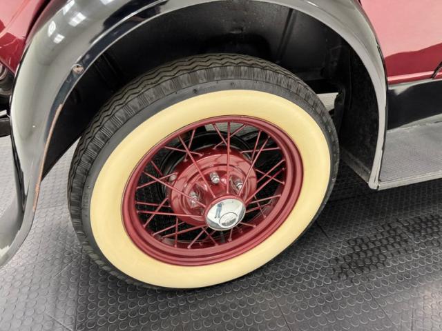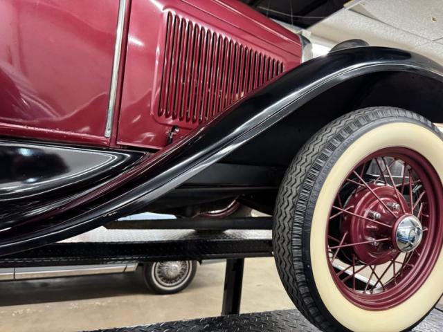 The classically two tone paint job is expressed with Ford Maroon and black, and she retains her vinyl roof as back in 1930, the technology did not exist to stamp a panel large enough to fit the entire roof, so it was left to be canvas with lath structure, modernized with vinyl. Beyond that, the enclosed cabin is fully enveloped in maroon paint with a drip rail and matching 19-inch wire wheels wrapped in white wall tires. Scroll lever door handles sit side by side on the reverse hinged doors while in front, a black painted light bar fronts a polished grille with black header ahead of the louvered hood and flanking cowl lights. In back, the spare tire splits the ribbon bumpers and a single tail light illuminates over the license plate. Imperfections include bubbles in the paint, overspray on some trim, a few chips and scratches throughout, and the edge of a fender arch missing paint.