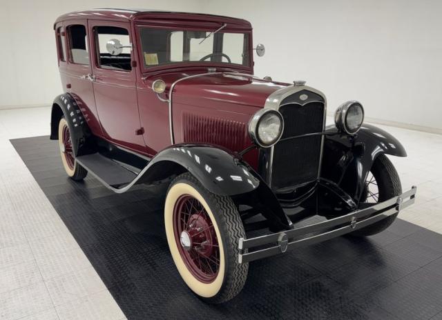 For consignment, a 1931 Ford Model A Fordor sedan showing 34,477 miles, but the true miles are unknown due to a title exemption. The car presents in nice drivable condition with vinyl bench seats on the inside.