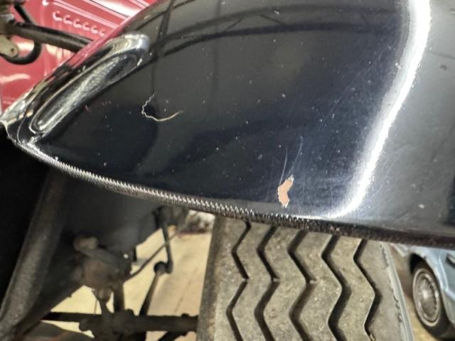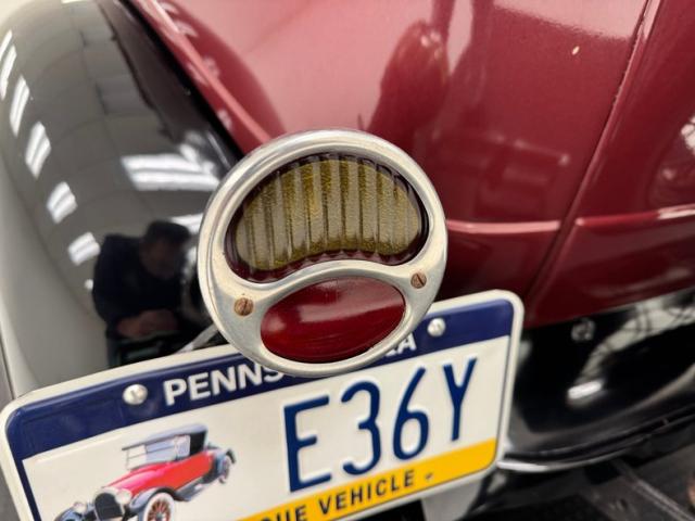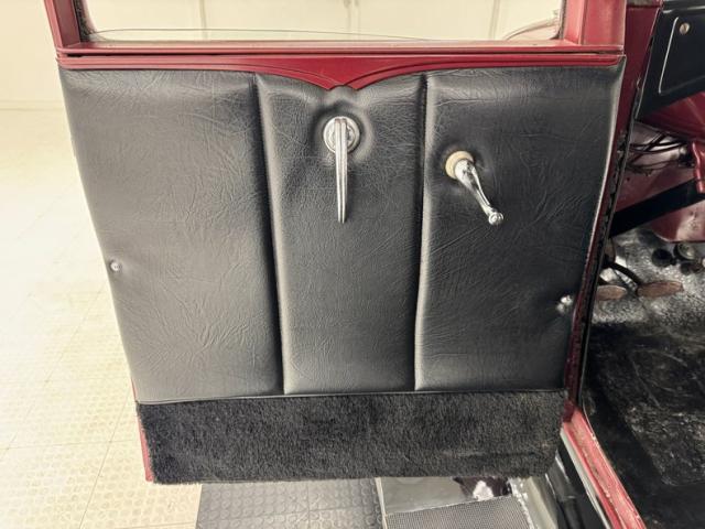 Black grain vinyl takes the place of any mohair or broadcloth that may have come with the car, and it presents handsomely on the door panels complete with carpeted lowers. Inside, two bench seats also wear the column tufted black vinyl, nicely stuffed and in great shape. Forward controls do not veer from original with a four spoke steering wheel and instrument cluster in the center with some wonderful patina against the maroon and black metal dash. Textured rubber makes up the floor covering, showing some cracks in few places but presentable front and rear while a tall shifter rises from the flat floor up front. Our headliner is a long smooth piece of black vinyl which is mirrored in the side walls and inner pillar covers.