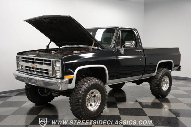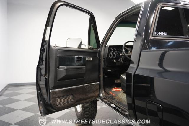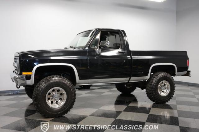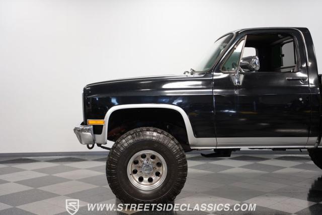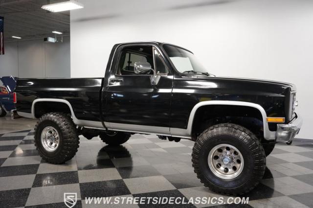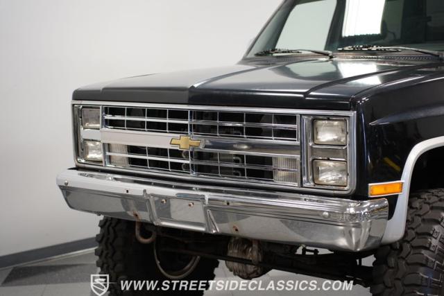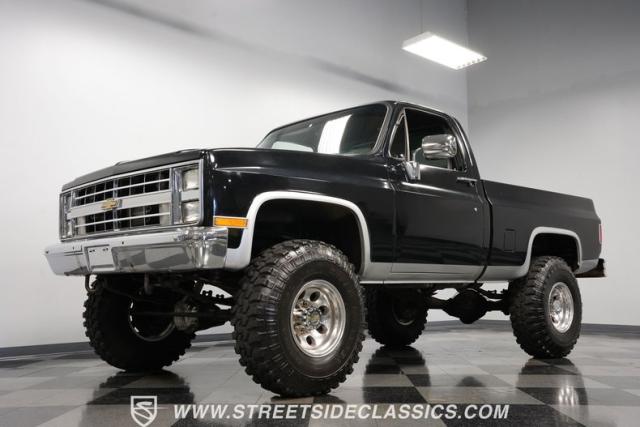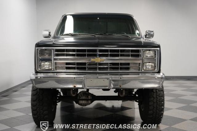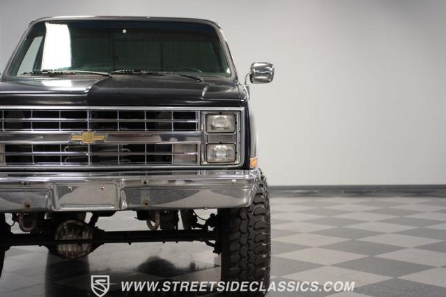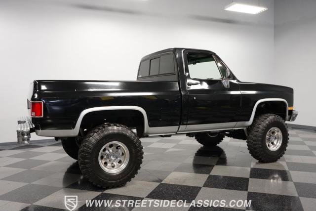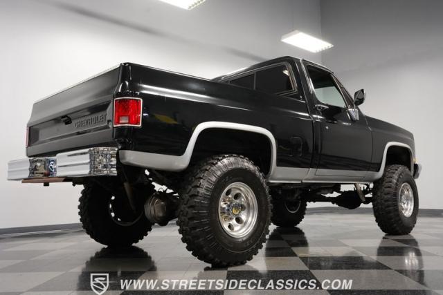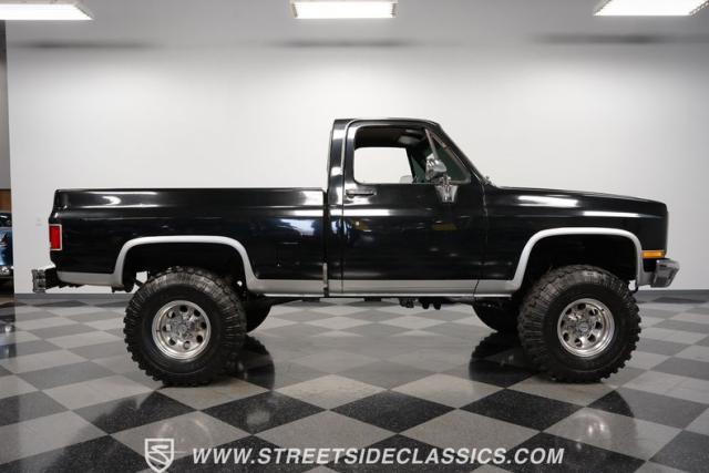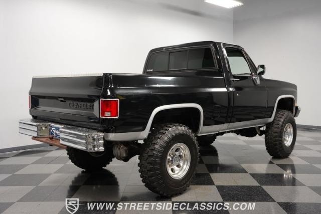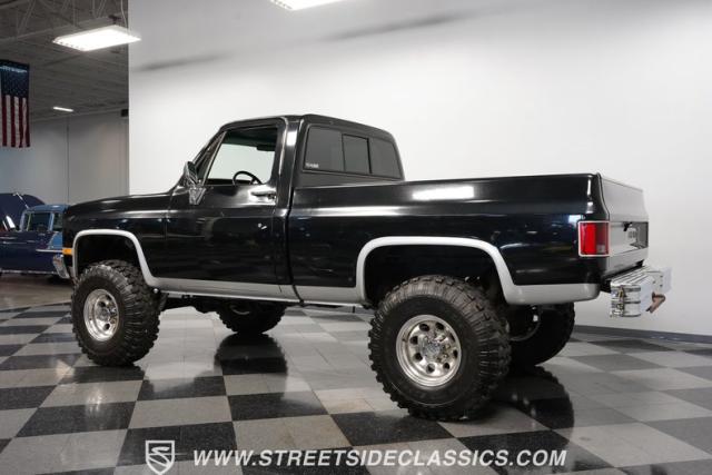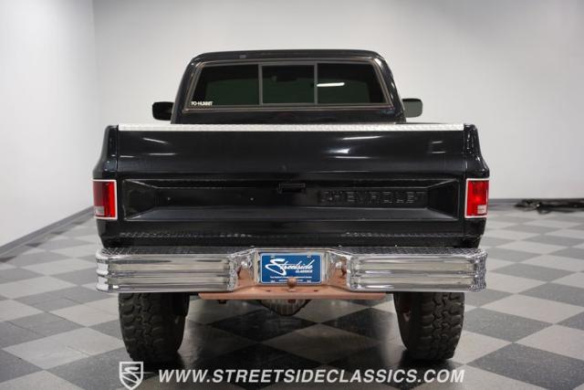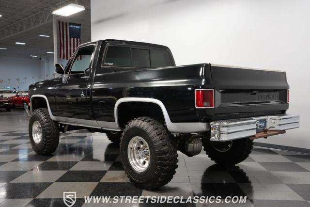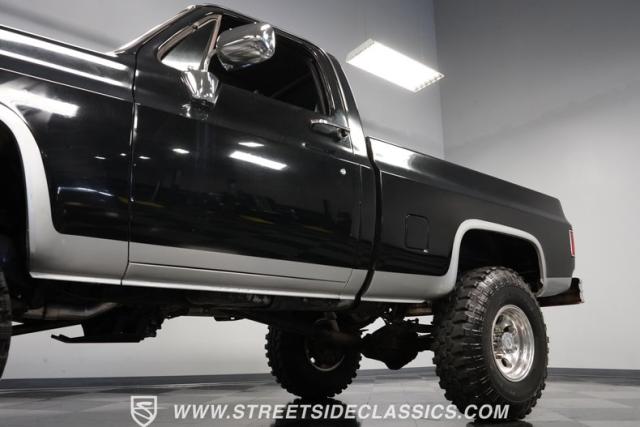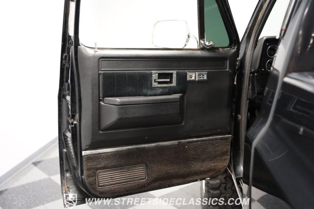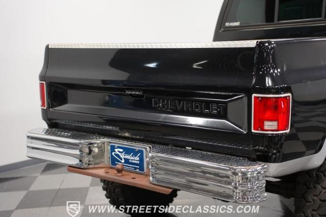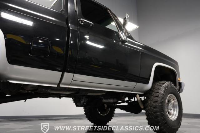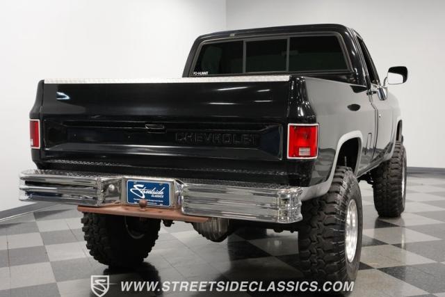 This 1985 Chevrolet K10 4x4 comes built for off-road adventures with its custom suspension lift and massive ground clearance. The black exterior features 18-inch Power Comp wheels wrapped in 36x12.50R18LT Super Swamper tires. The silver accents create a bold look against the black paint, and the heavy-duty chrome rear bumper and dark-tinted windows add to this truck\'s raw appeal.