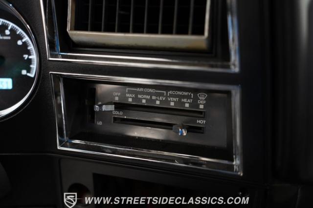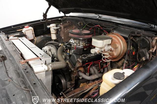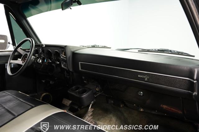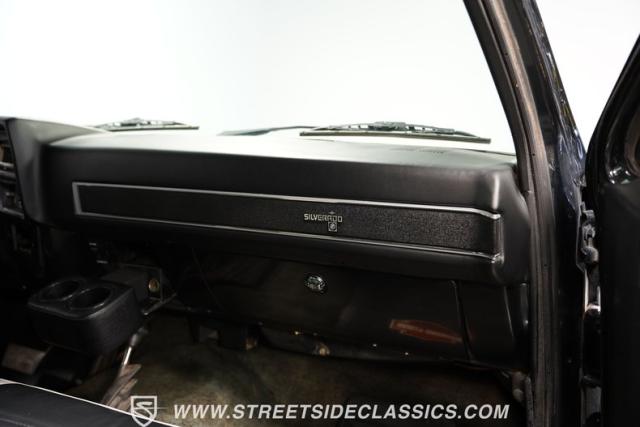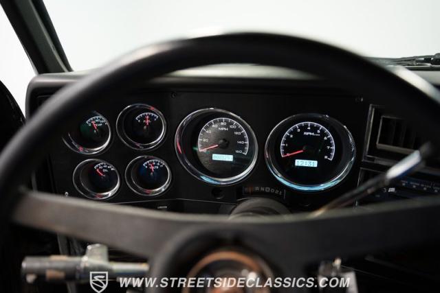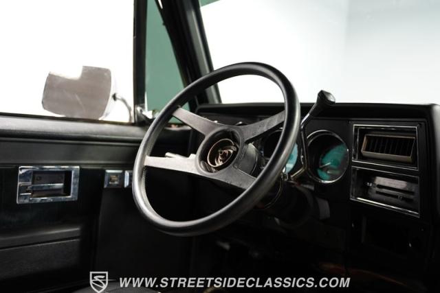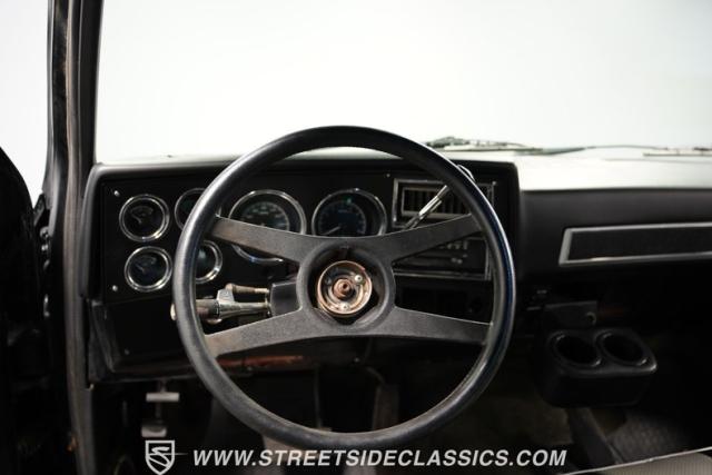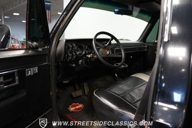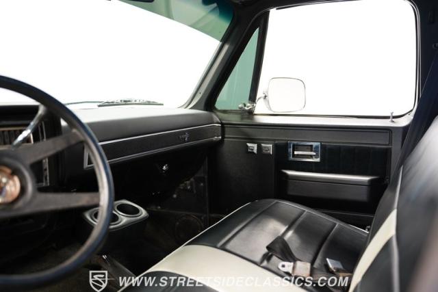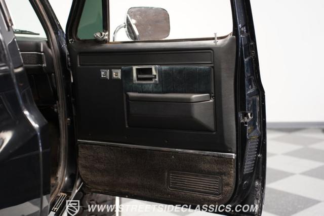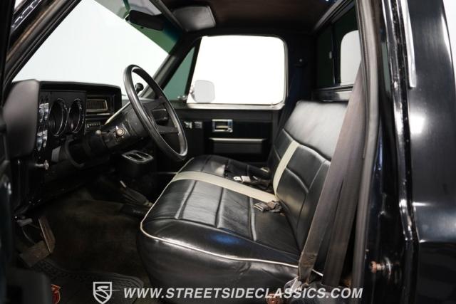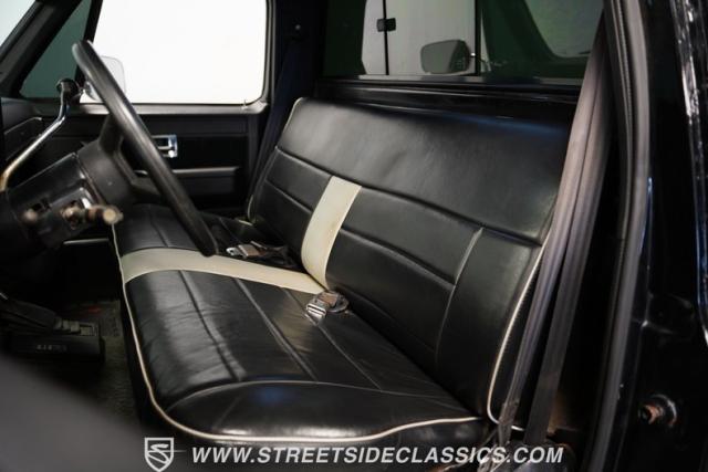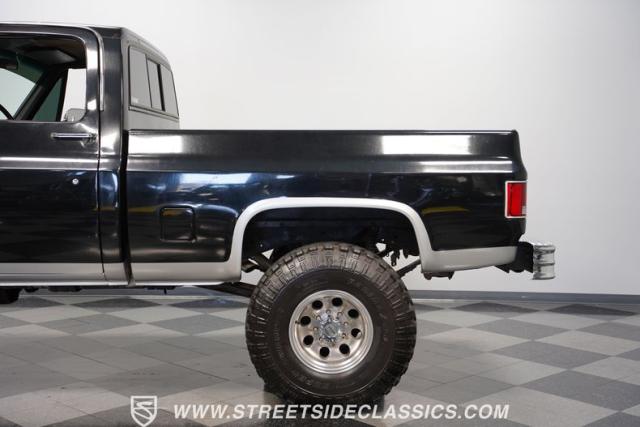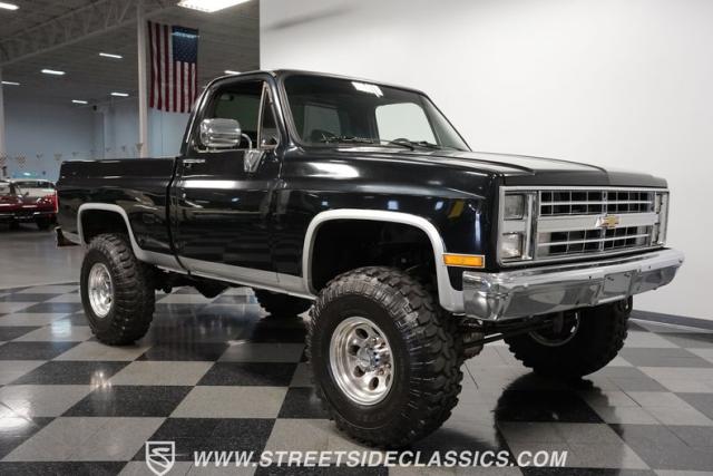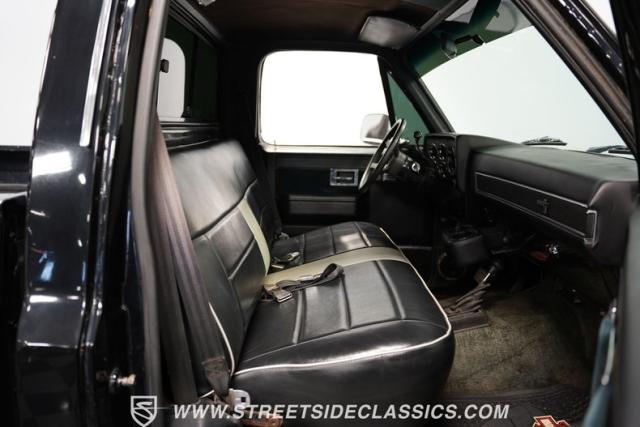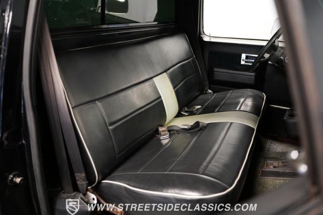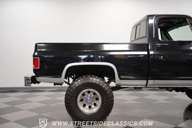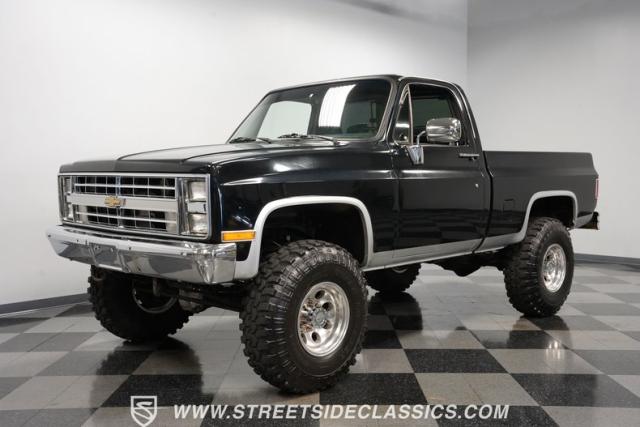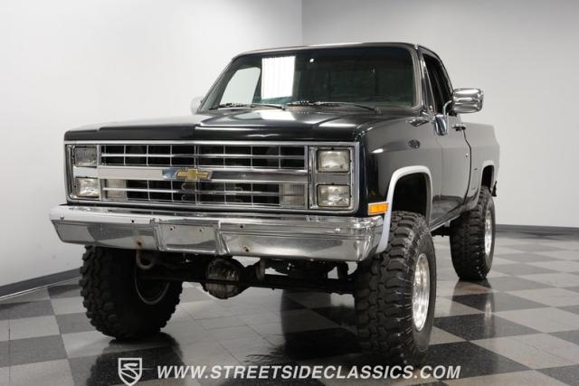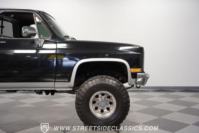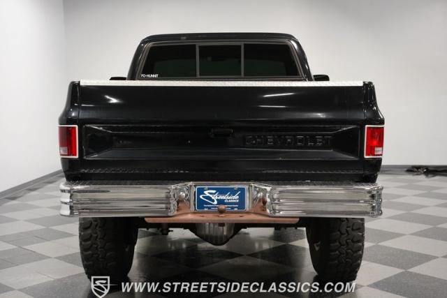 This 1985 Chevrolet K10 4x4 comes built for off-road adventures with its custom suspension lift and massive ground clearance. The black exterior features 18-inch Power Comp wheels wrapped in 36x12.50R18LT Super Swamper tires. The silver accents create a bold look against the black paint, and the heavy-duty chrome rear bumper and dark-tinted windows add to this truck\'s raw appeal.